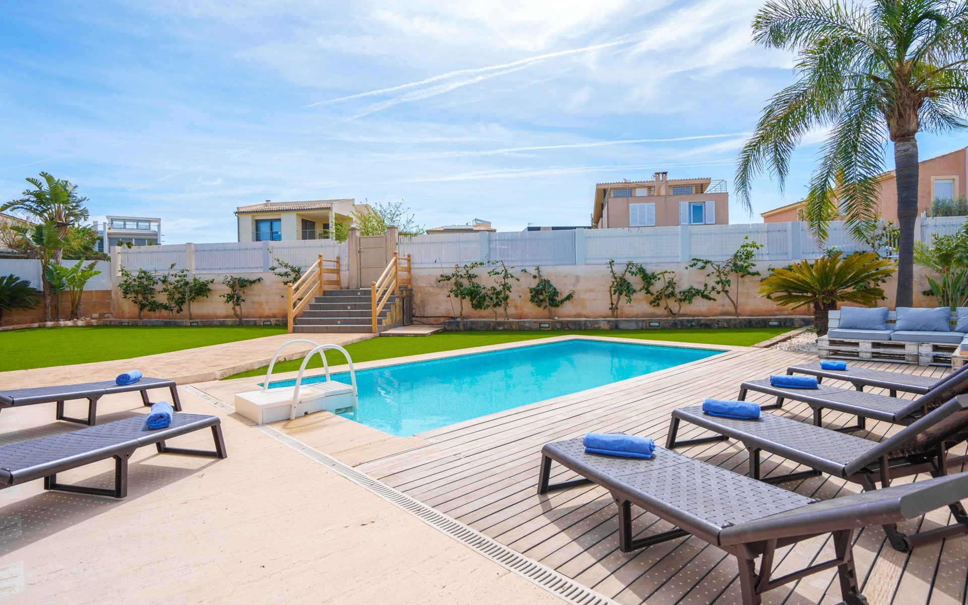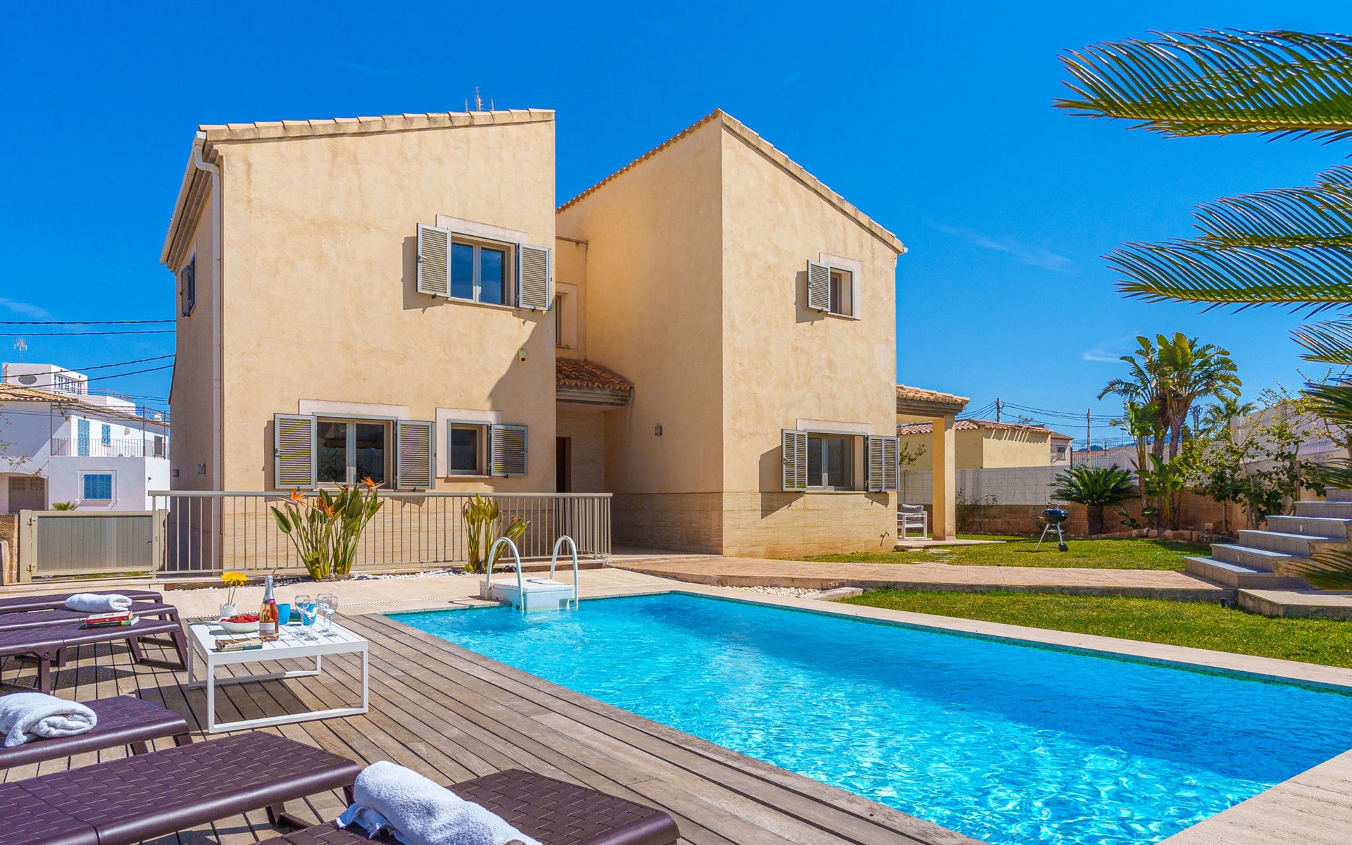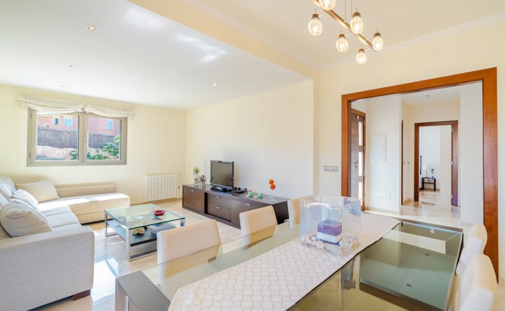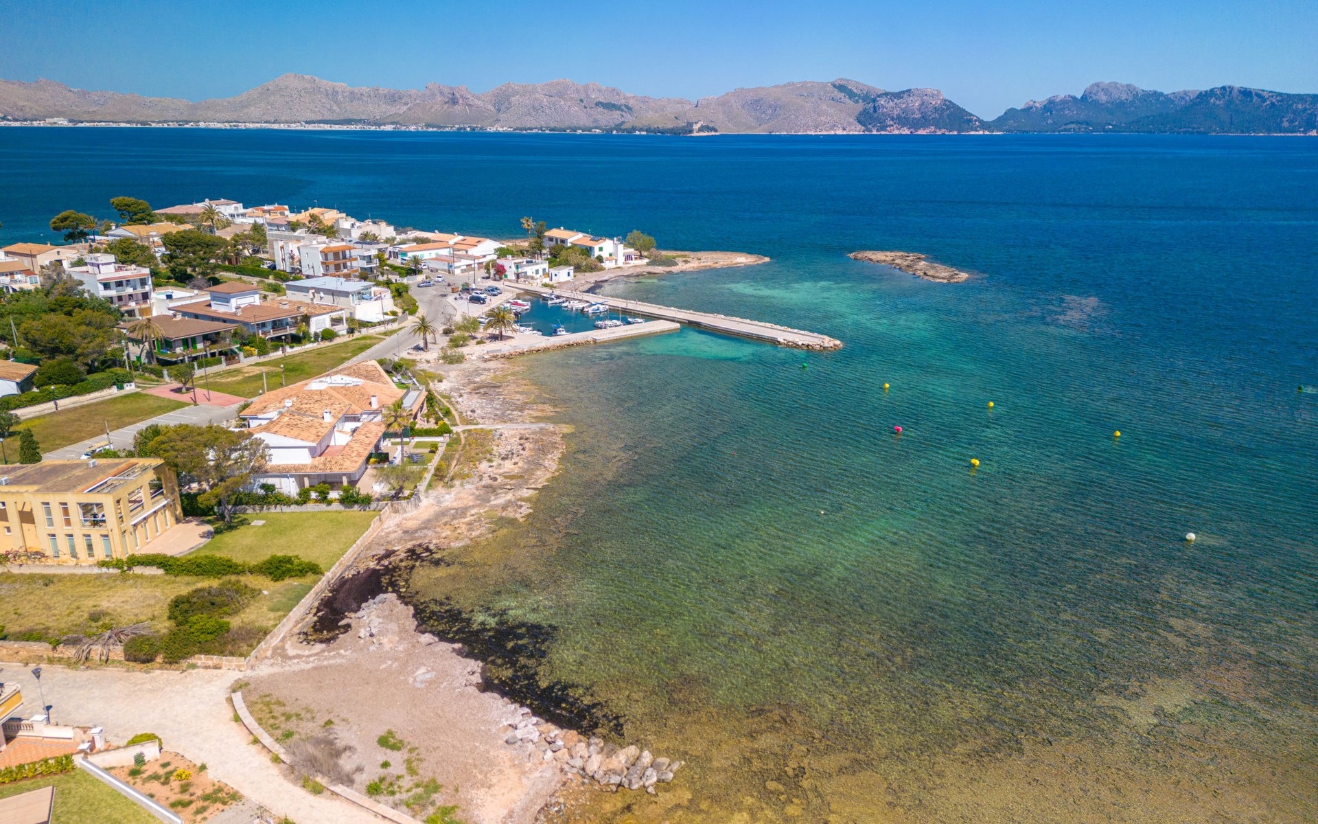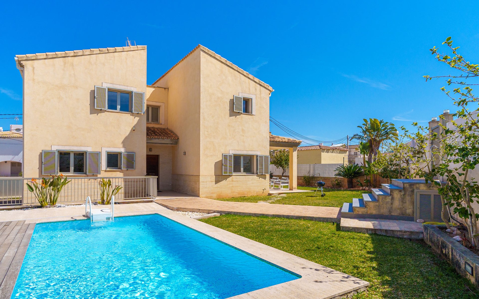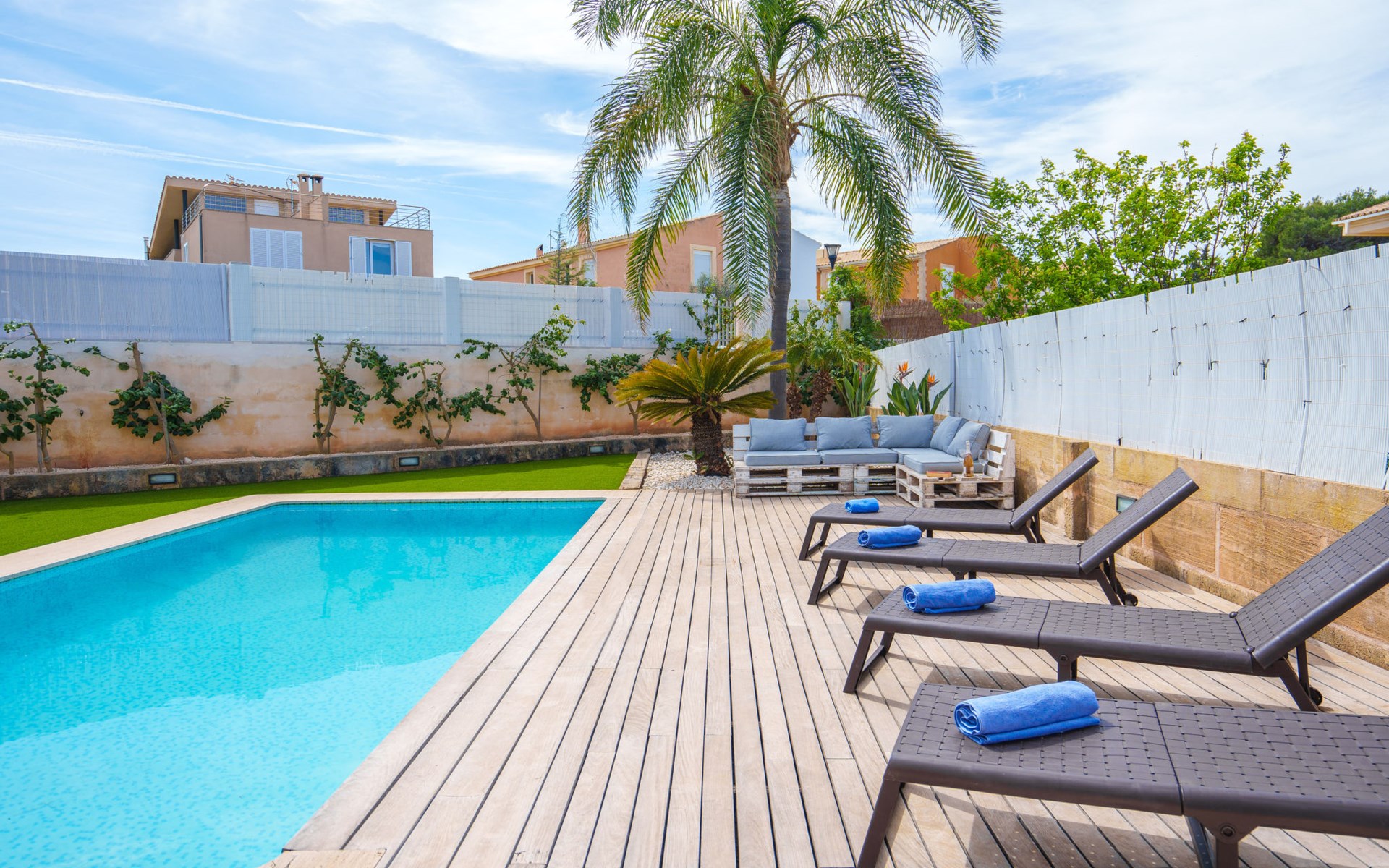 Barcarés 1 km von Alcúdia: Sehr grosse, sehr moderne, freistehende Villa "Son Jil", auf 2 Stockwerken, Baujahr 2005. Ruhige, sonnige Lage im Villenviertel, 2 km vom Waldrand, 60 m vom Meer, Strasse zu überqueren. Zur Alleinbenutzung: grosser, gepflegter Garten mit Rasen und Pflanzen, Schwimmbad eckig (8 x 4 m, 150 - 150 cm tief, saisonale Verfügbarkeit: 01.Jan. - 31.Dez.) mit Salzelektrolyse-Reinigungssystem. Aussendusche, Sitzplatz, Laube, Pergola, Gartenmöbel, Grill. Im Hause: Internetzugang, Wireless LAN, Zentralheizung, Klimaanlage, Waschmaschine. Öffentliches Parkhaus, öffentliche Parkplätze auf der Strasse. Einkaufsgeschäft 1 km, Supermarkt 1.2 km, Einkaufszentrum 45 km, Restaurant 160 m, Bar, Fußgängerzone 50 m, Zentrum zu Fuss in 15 Minuten erreichbar, Bushaltestelle 1.5 km, Fähre 3 km, Sandstrand "Platja Es Morer Vermell" 550 m, Felsstrand "Platja Es Barcarés" 60 m. Sporthafen 250 m, Jacht-Hafen 3 km, Golfplatz (18 Loch) 6 km, Tennis 2.5 km, Reitstall 2.5 km, Sportzentrum 2.5 km, Wanderwege ab Haus 1 km, Radweg 700 m, Kinderspielplatz 500 m. Nahe gelegene Sehenswürdigkeiten: Ermita de la Victoria, Barcarés, Manresa, Sa Marina, Es Malpas. Ciutat Romana de Pollentia, Alcudia. Port d'Alcúdia, Port de Pollença - Pollença, North Beaches. Wandergebiete: Sa Talaia, Es Puig de Sant Martí, Serra Tramuntana Pollença. Bitte beachten: geeignet für Familien, geeignet für Senioren. Objekt geeignet für 8 Erwachsene Jugendgruppen nur auf Anfrage. Flugplatz 60 km vom Haus.