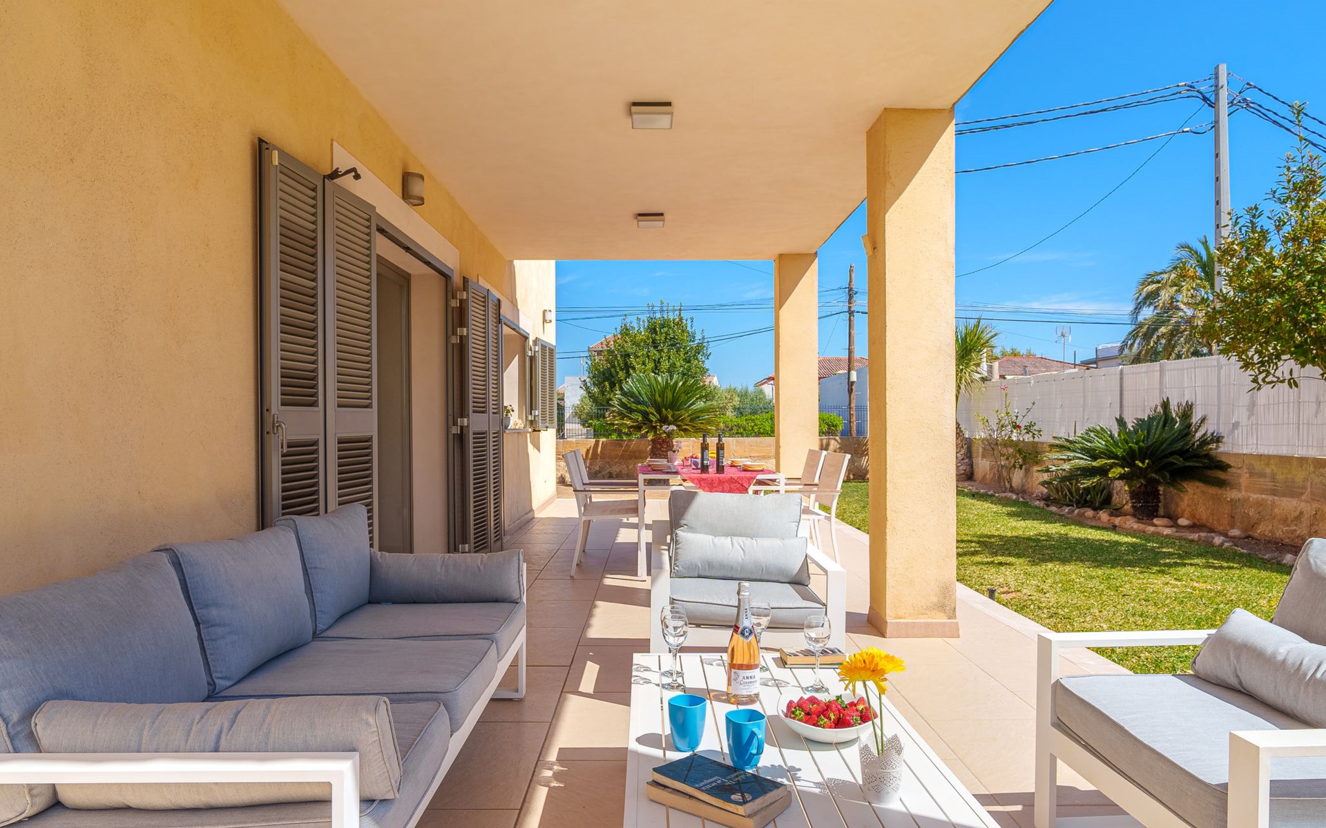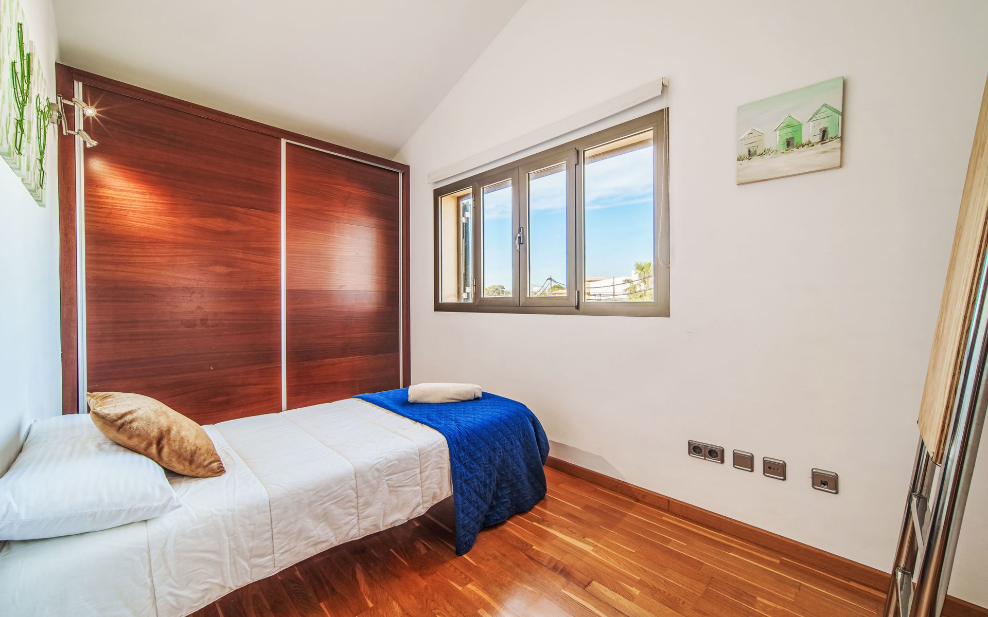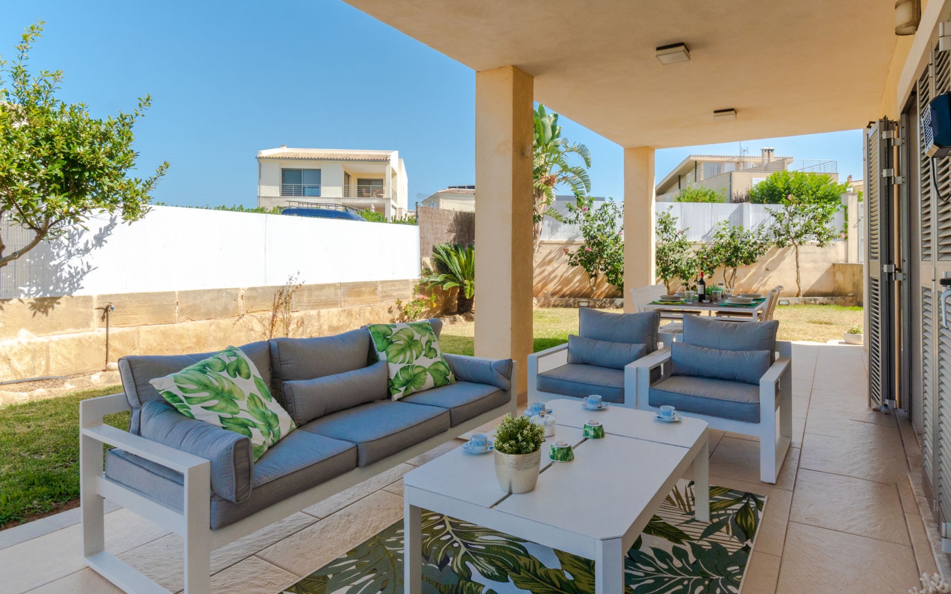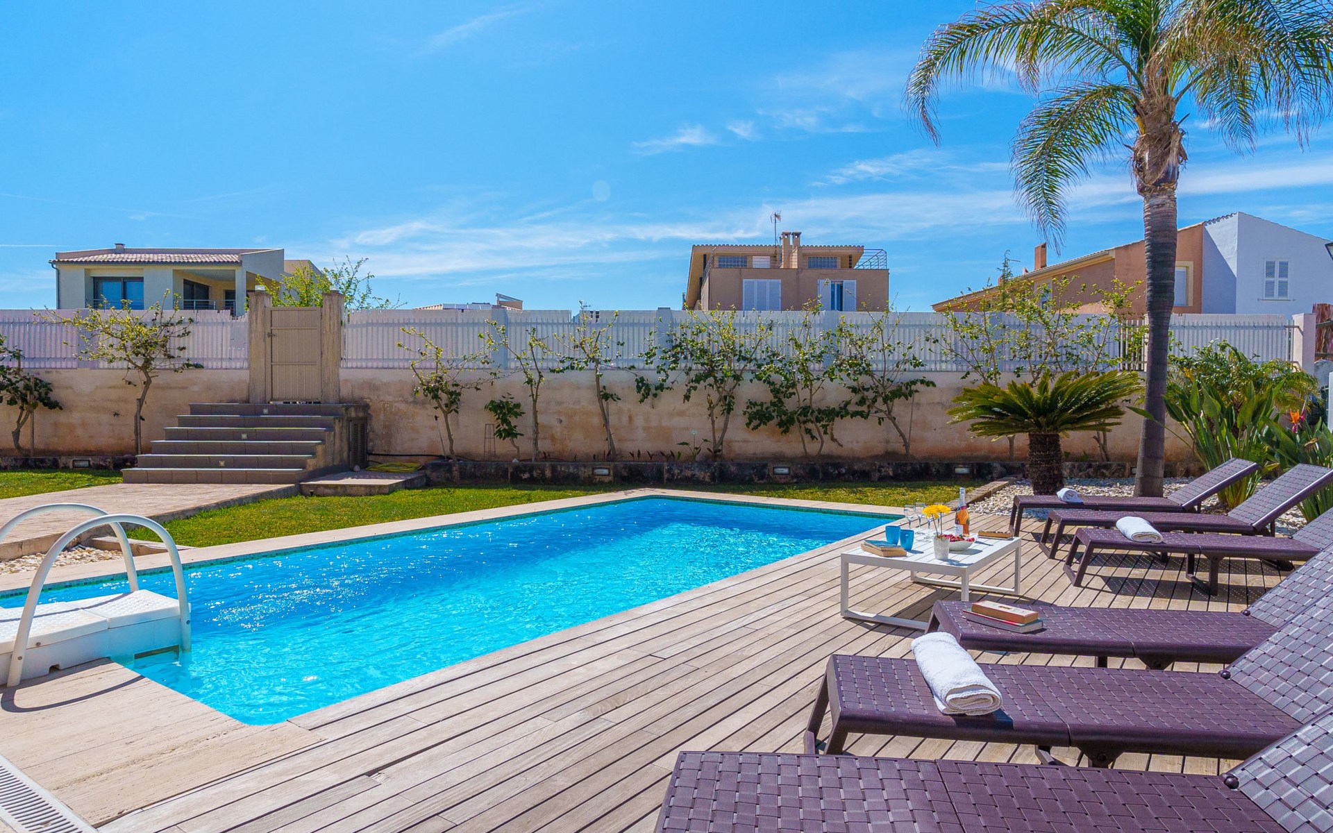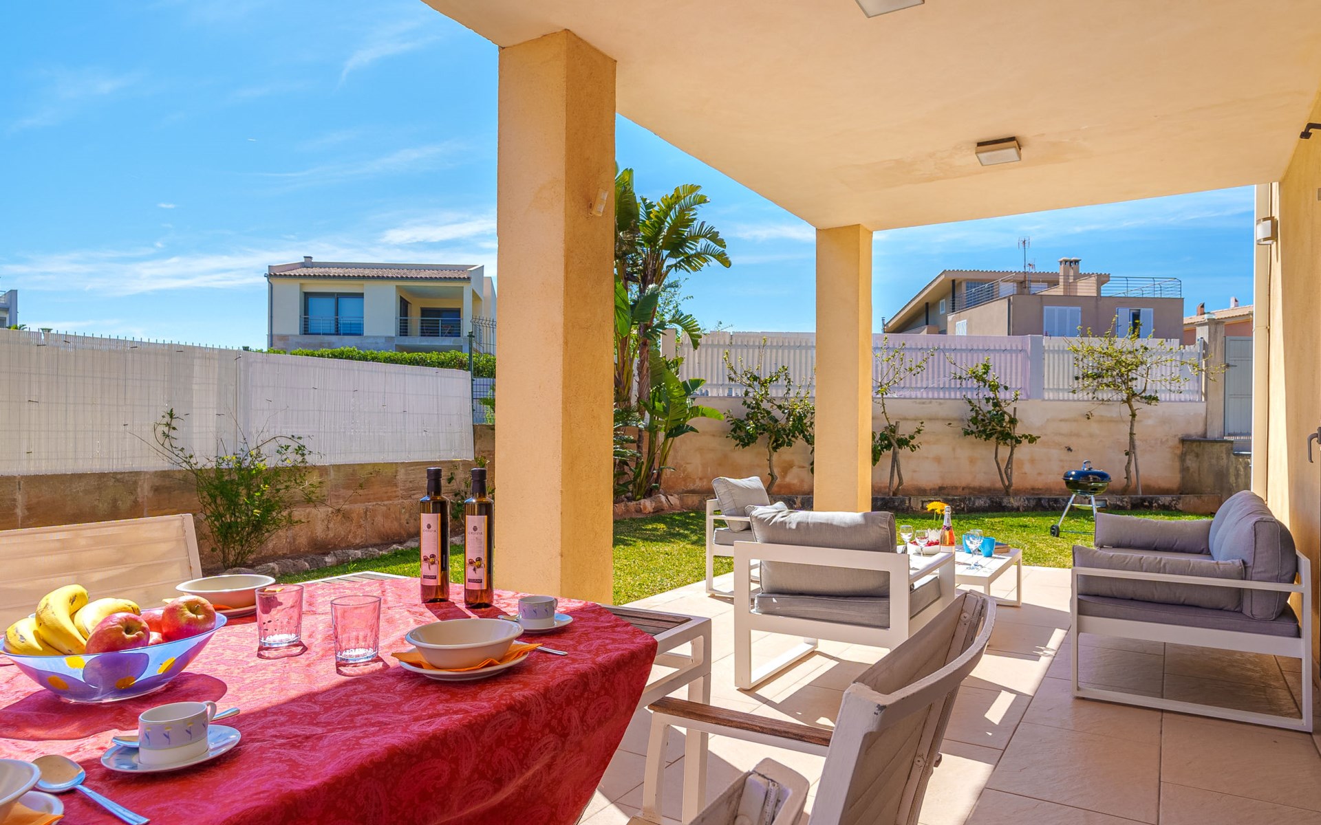 Barcarés 1 km von Alcúdia: Sehr grosse, sehr moderne, freistehende Villa "Son Jil", auf 2 Stockwerken, Baujahr 2005. Ruhige, sonnige Lage im Villenviertel, 2 km vom Waldrand, 60 m vom Meer, Strasse zu überqueren. Zur Alleinbenutzung: grosser, gepflegter Garten mit Rasen und Pflanzen, Schwimmbad eckig (8 x 4 m, 150 - 150 cm tief, saisonale Verfügbarkeit: 01.Jan. - 31.Dez.) mit Salzelektrolyse-Reinigungssystem. Aussendusche, Sitzplatz, Laube, Pergola, Gartenmöbel, Grill. Im Hause: Internetzugang, Wireless LAN, Zentralheizung, Klimaanlage, Waschmaschine. Öffentliches Parkhaus, öffentliche Parkplätze auf der Strasse. Einkaufsgeschäft 1 km, Supermarkt 1.2 km, Einkaufszentrum 45 km, Restaurant 160 m, Bar, Fußgängerzone 50 m, Zentrum zu Fuss in 15 Minuten erreichbar, Bushaltestelle 1.5 km, Fähre 3 km, Sandstrand "Platja Es Morer Vermell" 550 m, Felsstrand "Platja Es Barcarés" 60 m. Sporthafen 250 m, Jacht-Hafen 3 km, Golfplatz (18 Loch) 6 km, Tennis 2.5 km, Reitstall 2.5 km, Sportzentrum 2.5 km, Wanderwege ab Haus 1 km, Radweg 700 m, Kinderspielplatz 500 m. Nahe gelegene Sehenswürdigkeiten: Ermita de la Victoria, Barcarés, Manresa, Sa Marina, Es Malpas. Ciutat Romana de Pollentia, Alcudia. Port d'Alcúdia, Port de Pollença - Pollença, North Beaches. Wandergebiete: Sa Talaia, Es Puig de Sant Martí, Serra Tramuntana Pollença. Bitte beachten: geeignet für Familien, geeignet für Senioren. Objekt geeignet für 8 Erwachsene Jugendgruppen nur auf Anfrage. Flugplatz 60 km vom Haus.
