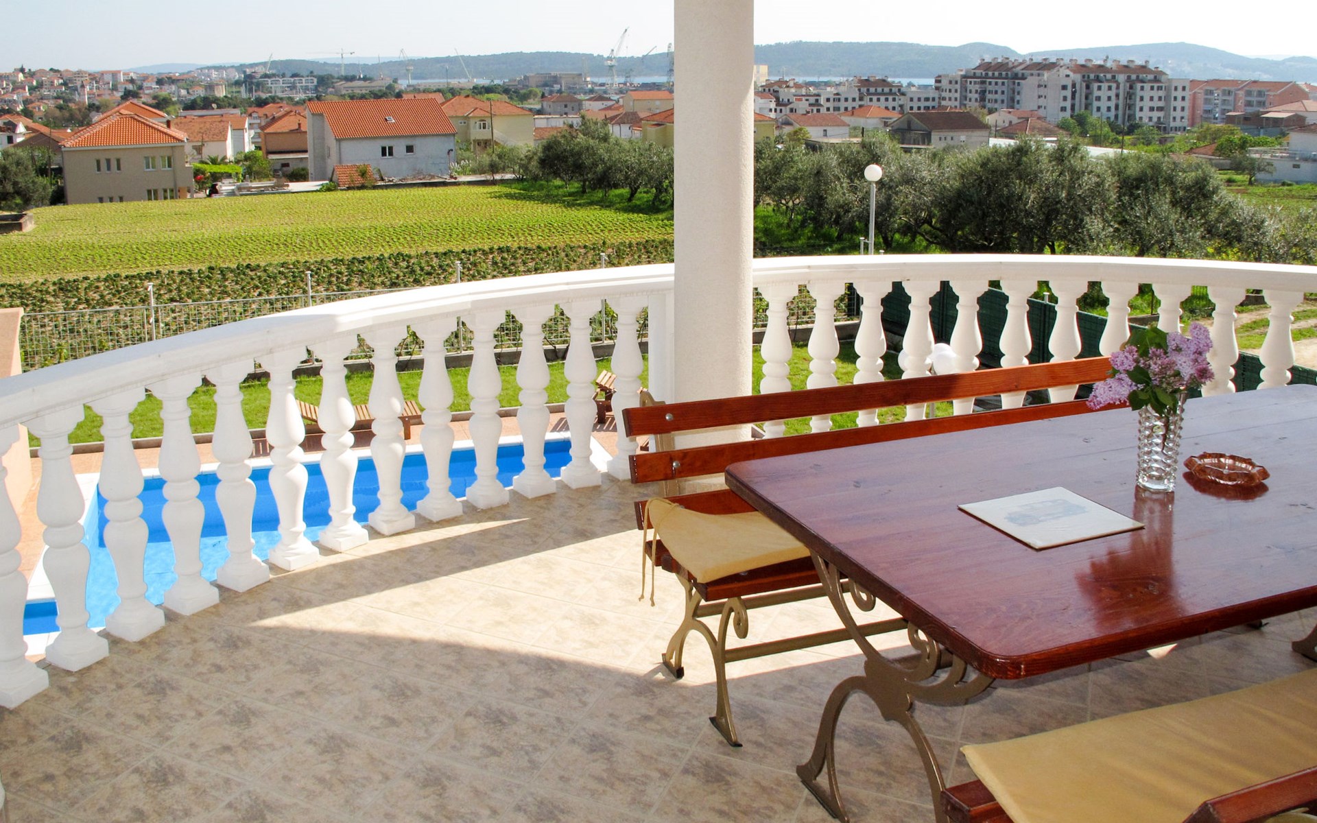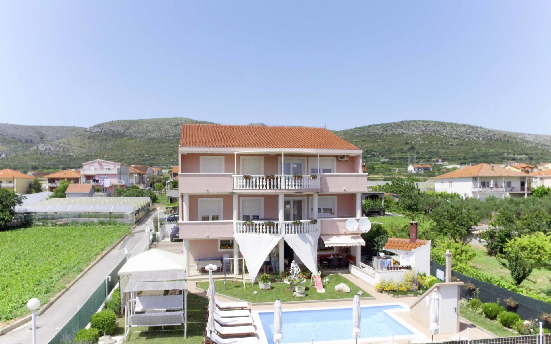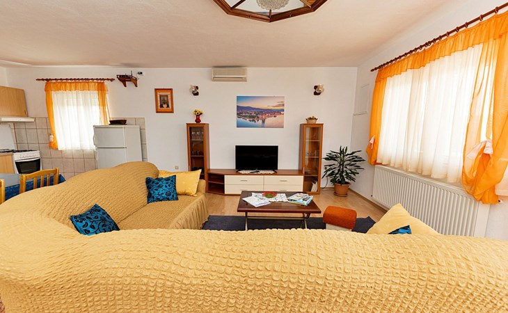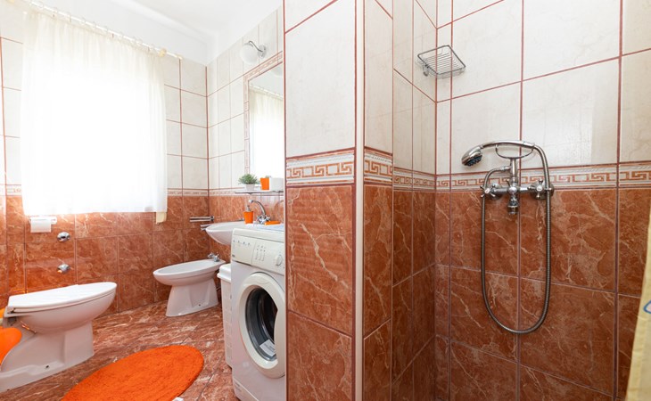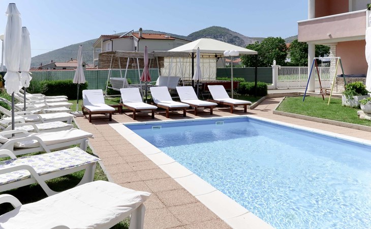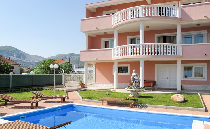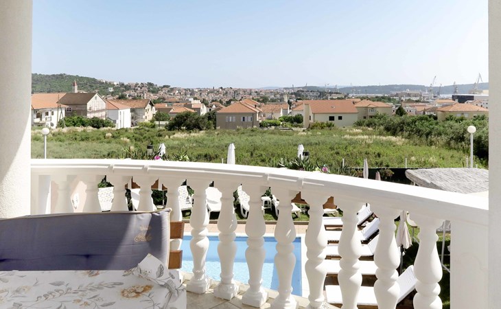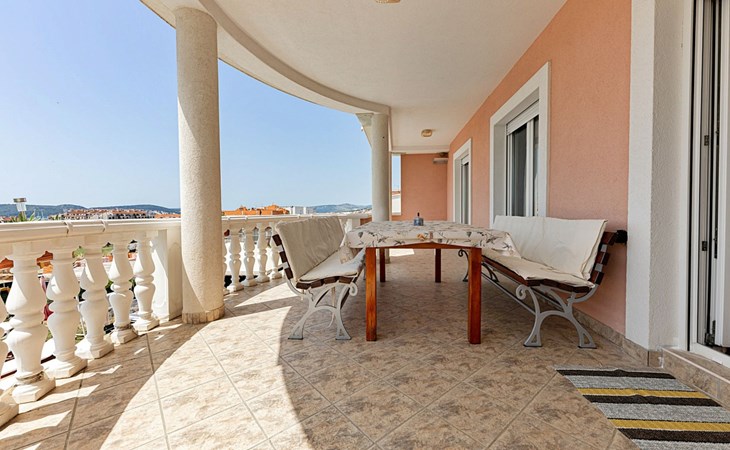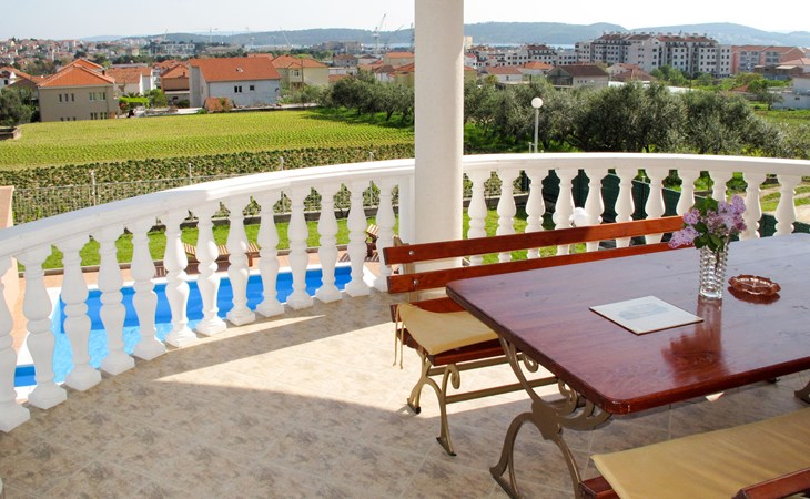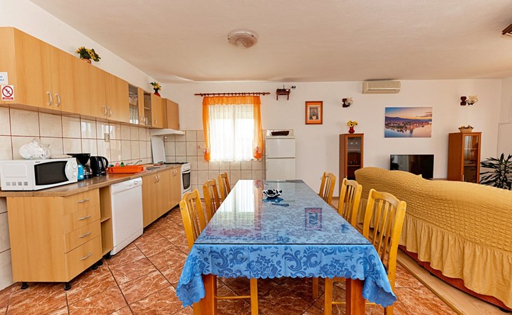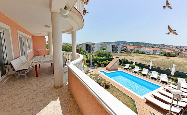 Dreifamilienhaus "Villa Saba". 800 m vom Zentrum von Trogir, 900 m vom Meer, 2.5 km vom Strand. Zur Mitbenutzung: Grundstück 700 m2 (eingezäunt) mit Rasen und Bäumen, Schwimmbad (6 x 4 m, 150 cm tief, saisonale Verfügbarkeit: 03.Apr. - 06.Nov.) mit Innentreppe. Aussendusche, Terrasse. Im Hause: Internetzugang. Parkplatz beim Haus auf dem Grundstück. Supermarkt 800 m, Bushaltestelle 950 m, Felsstrand 2.5 km. Keine Vermietung an Jugendgruppen.