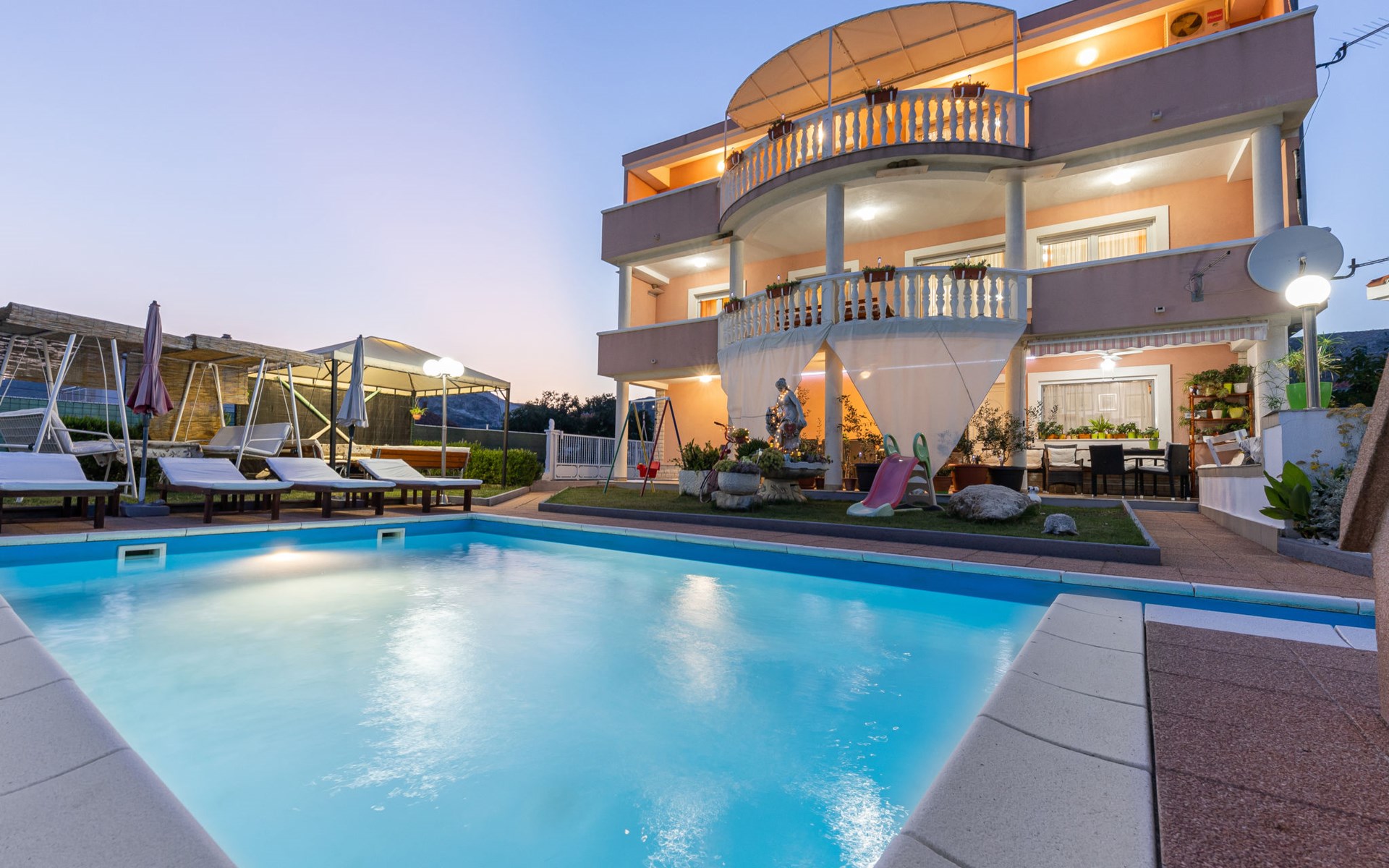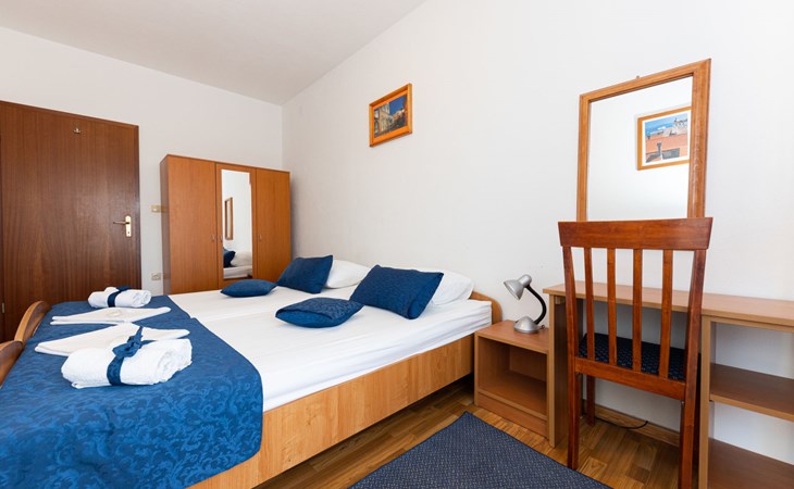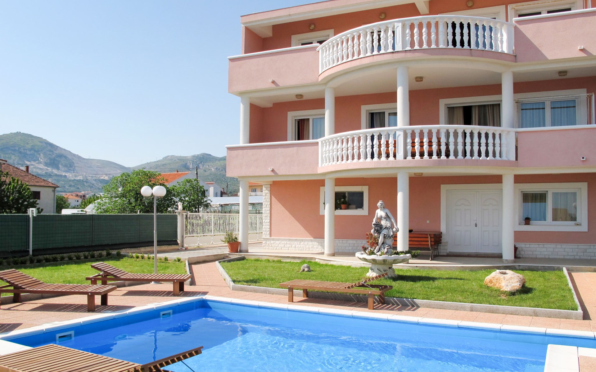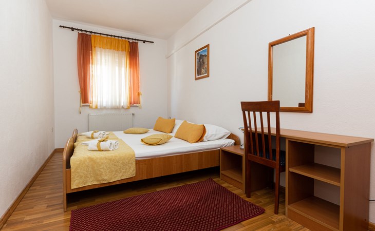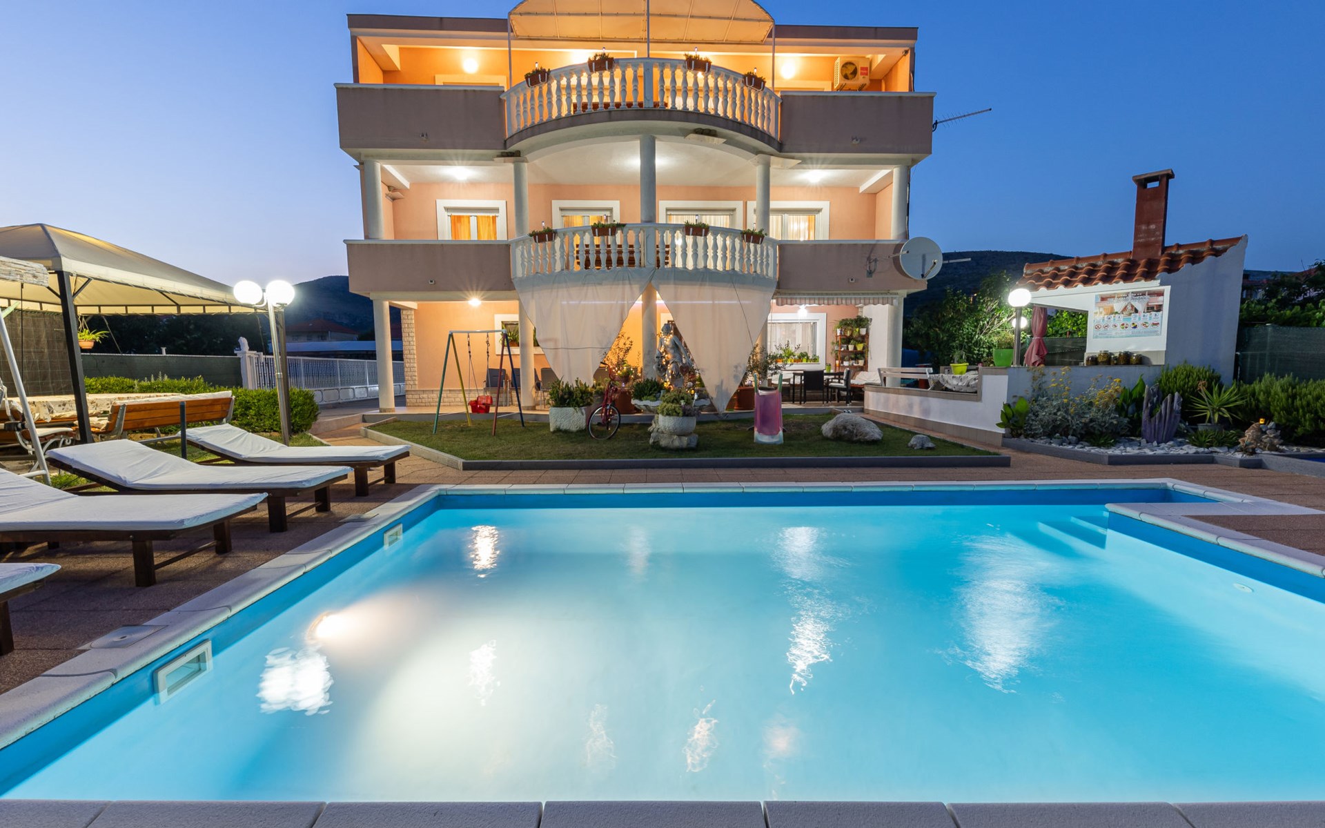 Dreifamilienhaus "Villa Saba". 800 m vom Zentrum von Trogir, 900 m vom Meer, 2.5 km vom Strand. Zur Mitbenutzung: Grundstück 700 m2 (eingezäunt) mit Rasen und Bäumen, Schwimmbad (6 x 4 m, 150 cm tief, saisonale Verfügbarkeit: 03.Apr. - 06.Nov.) mit Innentreppe. Aussendusche, Terrasse. Im Hause: Internetzugang. Parkplatz beim Haus auf dem Grundstück. Supermarkt 800 m, Bushaltestelle 950 m, Felsstrand 2.5 km. Keine Vermietung an Jugendgruppen.