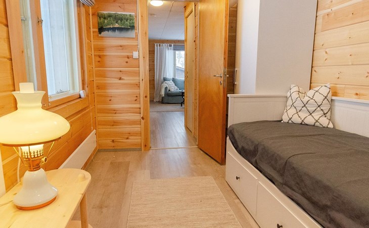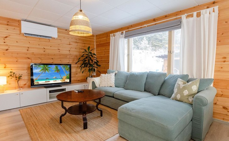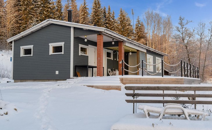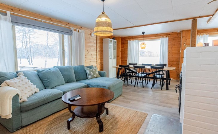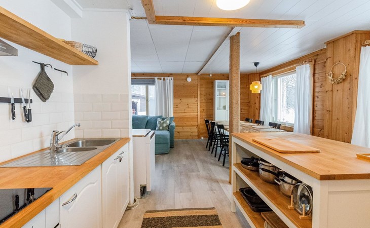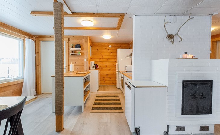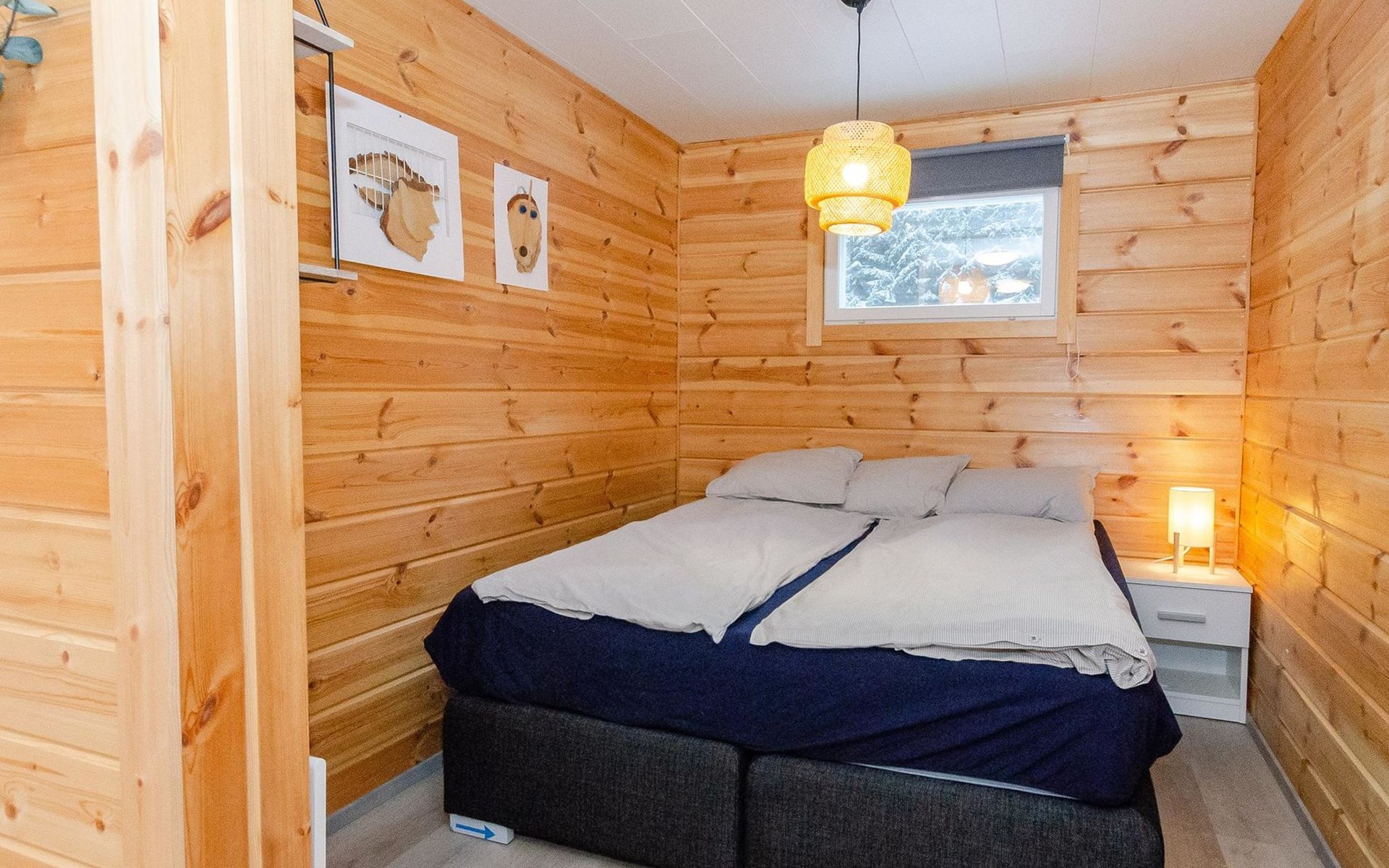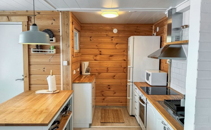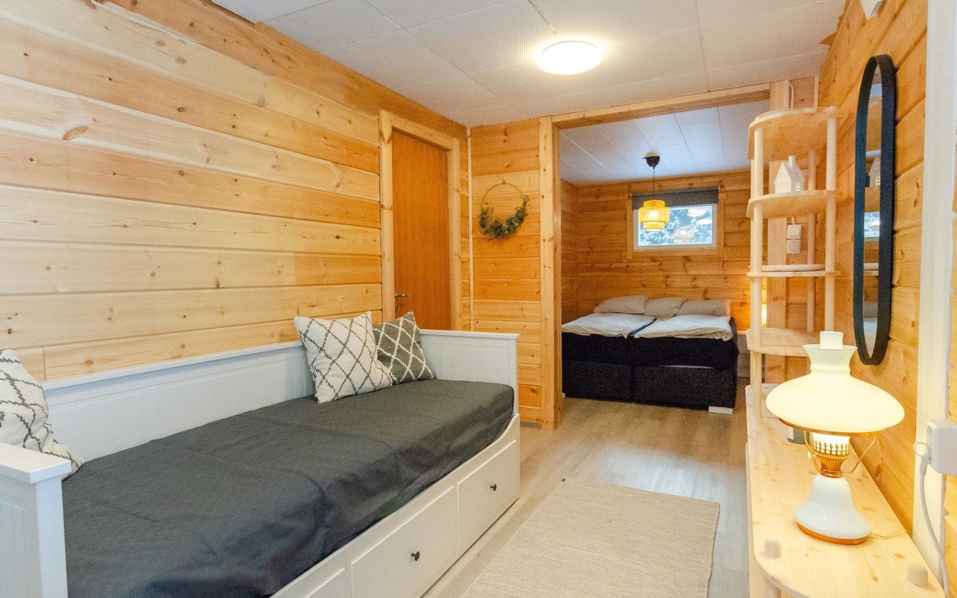 Holiday cabin, built in 1965 and fully renovated in 2023. The living room and bedroom both feature pull-out sofa beds, with an additional double bed in the bedroom alcove. Access from the bedroom to the bathroom and sauna, which has a wood-burning sauna stove. Terrace.