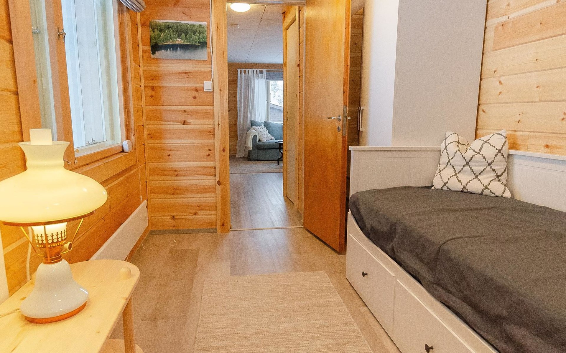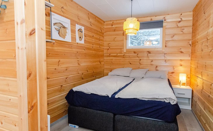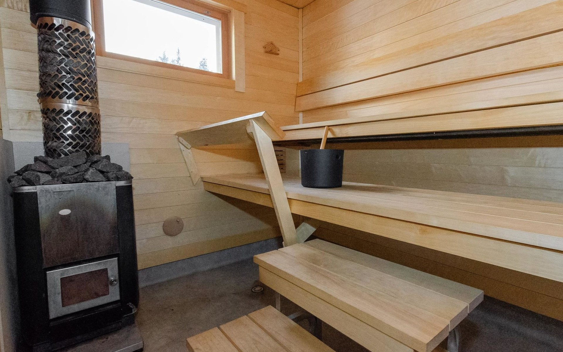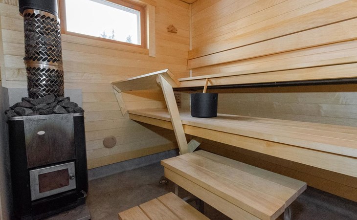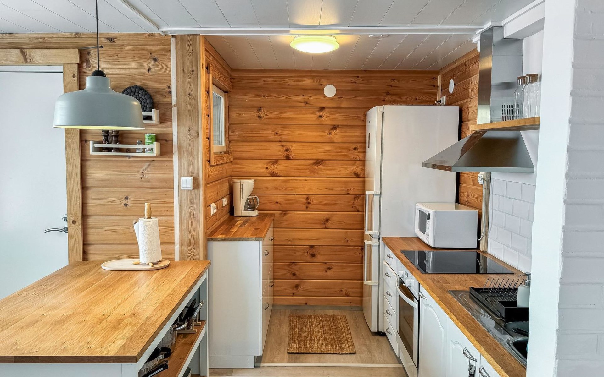 Holiday cabin, built in 1965 and fully renovated in 2023. The living room and bedroom both feature pull-out sofa beds, with an additional double bed in the bedroom alcove. Access from the bedroom to the bathroom and sauna, which has a wood-burning sauna stove. Terrace.
