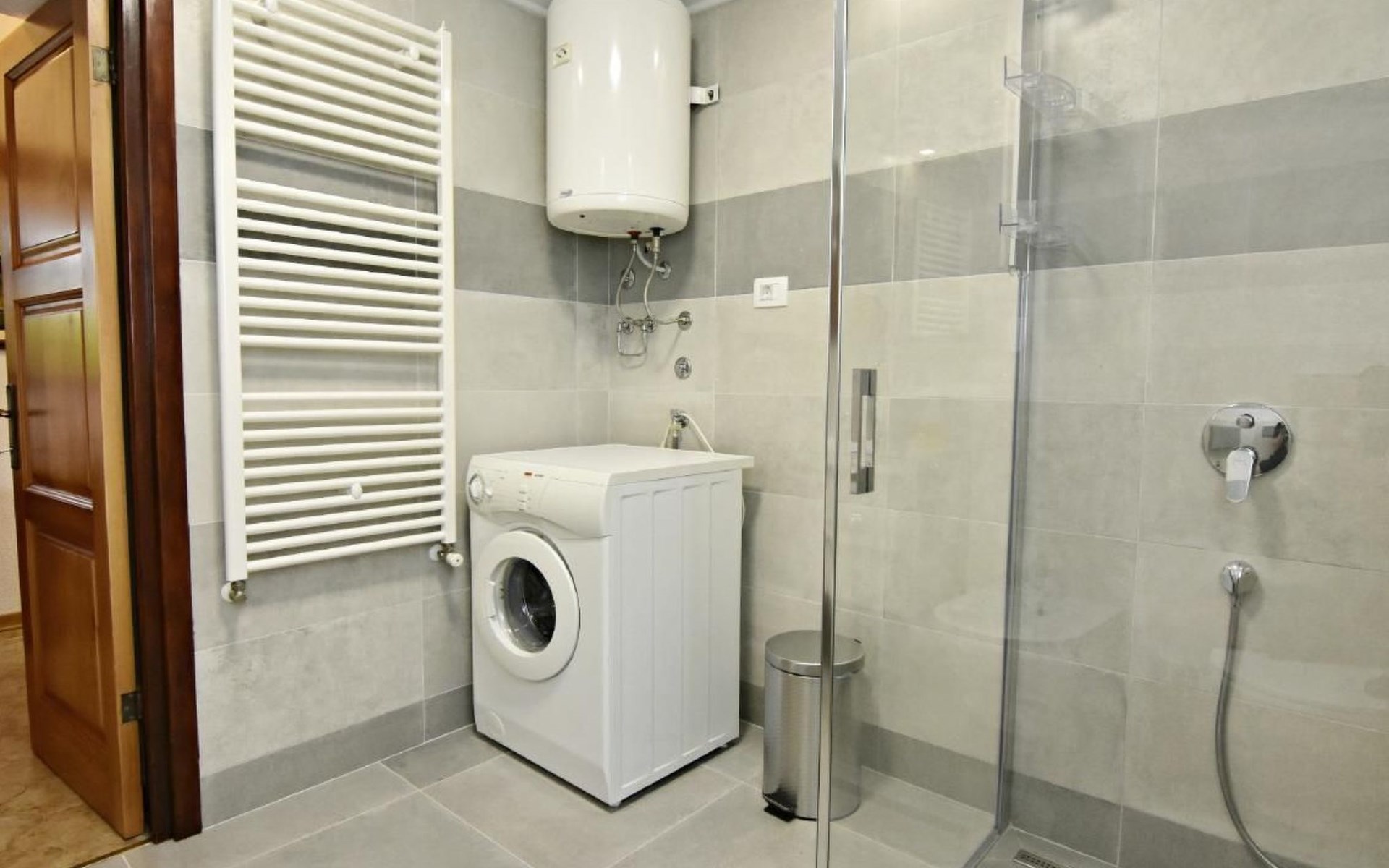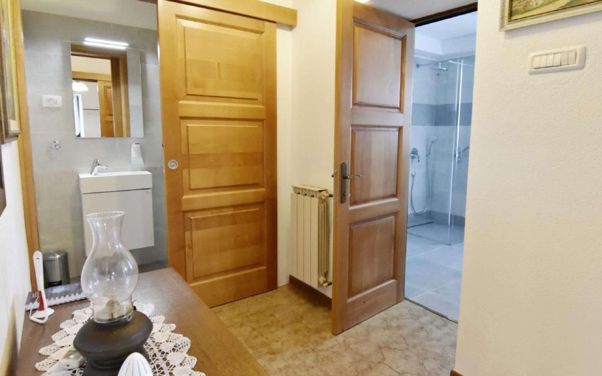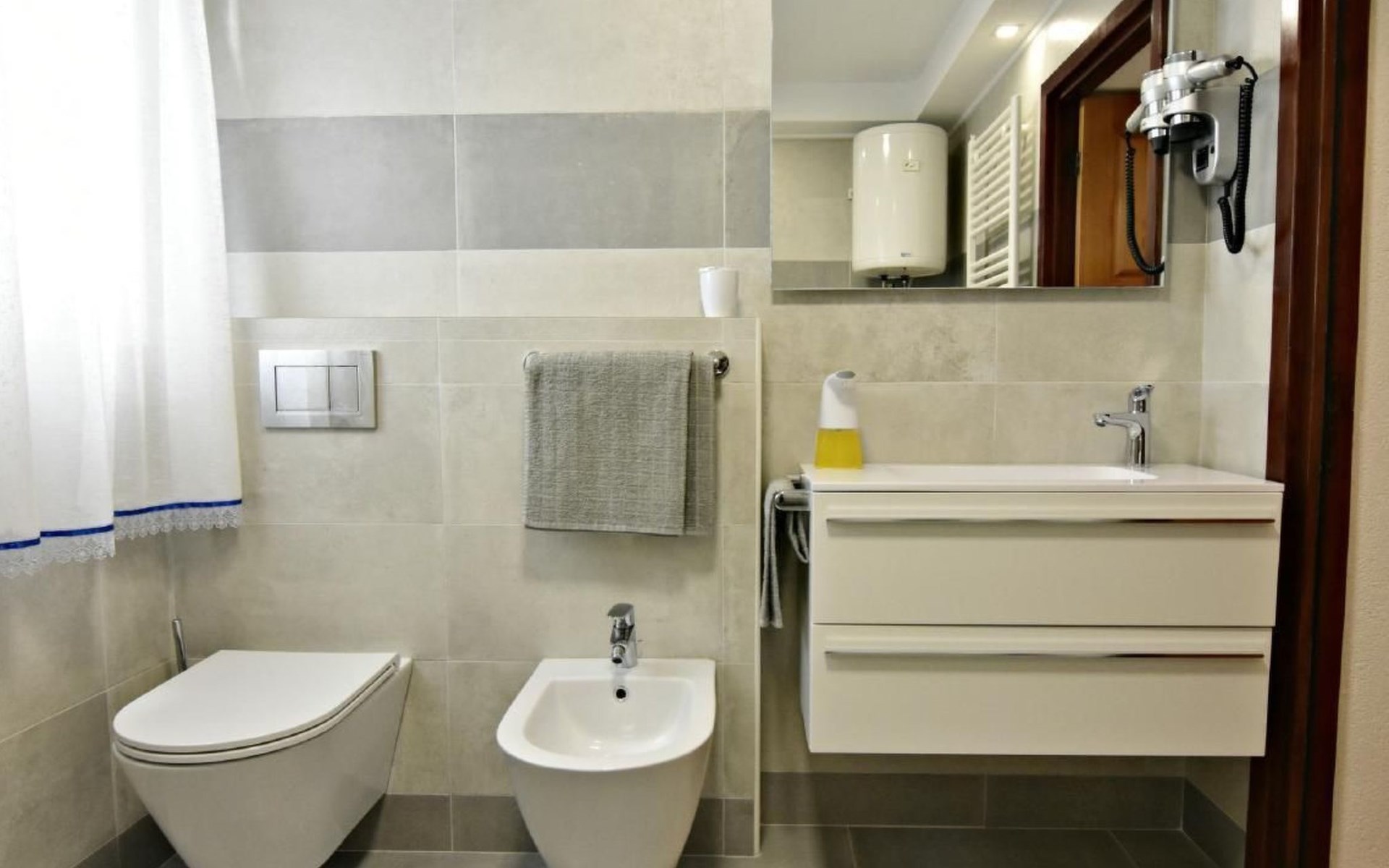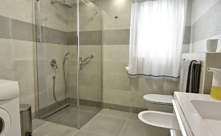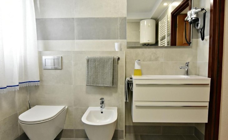 Das Badezimmer mit Dusche, Toilette, Waschbecken mit Schrank und Spiegel, Bidet, Waschmaschine, Haartrockner, Badetücher zwei pro Person sind vorhanden (wöchentlich gewechselt), noch ein separates Toilette mit Waschbecken mit Schrank und Spiegel.
