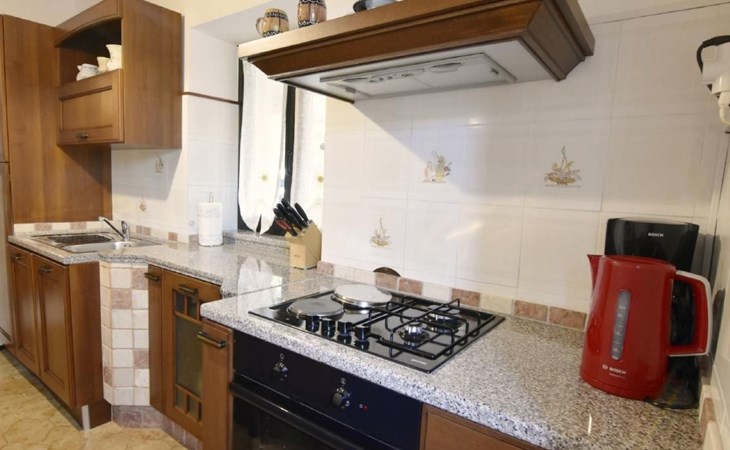Die voll ausgestattete Wohnküche verfügt über eine Mikrowelle, einen Wasserkocher, einen Backofen, einen Kühlschrank mit Gefrierfach, einen Herd mit zwei Gas und zwei elektrischen Brennern, eine Dunstabzugshaube, eine Kaffeemaschine, Geschirr und Besteck, Töpfe und einen Essbereich mit Esstisch und 4 Stühle.