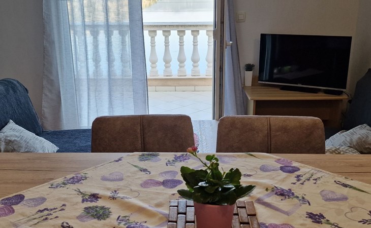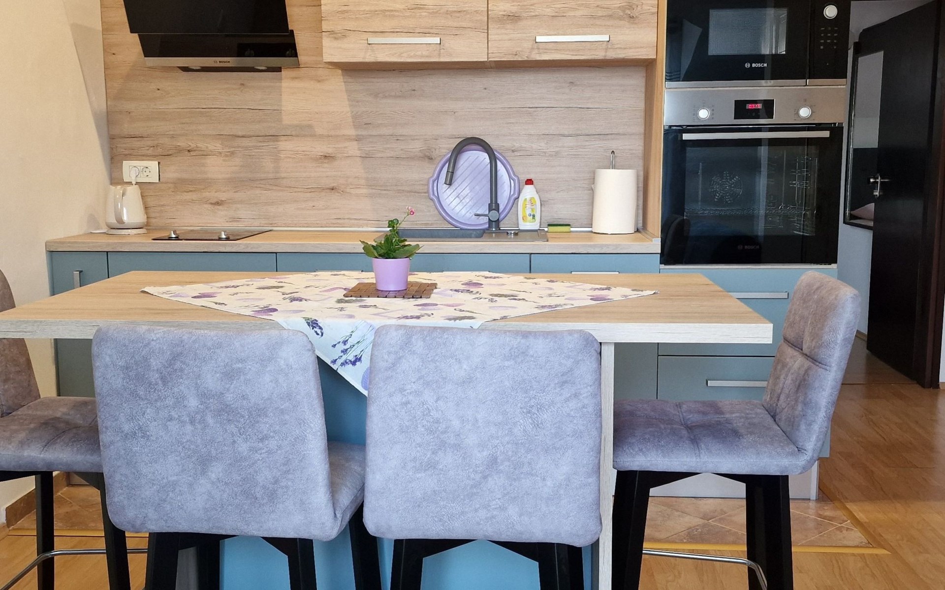 Im Inneren strahlt die Wohnung eine warme, einladende Atmosphäre aus. Sie verfügt über zwei Schlafzimmer und ein gut ausgestattetes Badezimmer mit Dusche, Toilette und Haartrockner für Ihren Komfort. Das Hauptschlafzimmer verfügt über ein Doppelbett (160x200) und ein Schlafsofa, während ein zusätzliches Einzelbett (90x200cm) in einer Nische in der geräumigen Wohnküche steht. Dieser offene Bereich ist mit einem 2-Platten-Herd, einem Wasserkocher, einem Kochfeld, einem Kühlschrank, einer Mikrowelle, einem Geschirrspüler und einer Essecke ausgestattet, so dass eine komfortable Selbstversorgung gewährleistet ist. Die Klimaanlage im gesamten Haus und die teilweise Fußbodenheizung sorgen für zusätzlichen Komfort, und die Waschmaschine steht zur alleinigen Nutzung zur Verfügung, so dass alle Ihre Bedürfnisse abgedeckt sind.