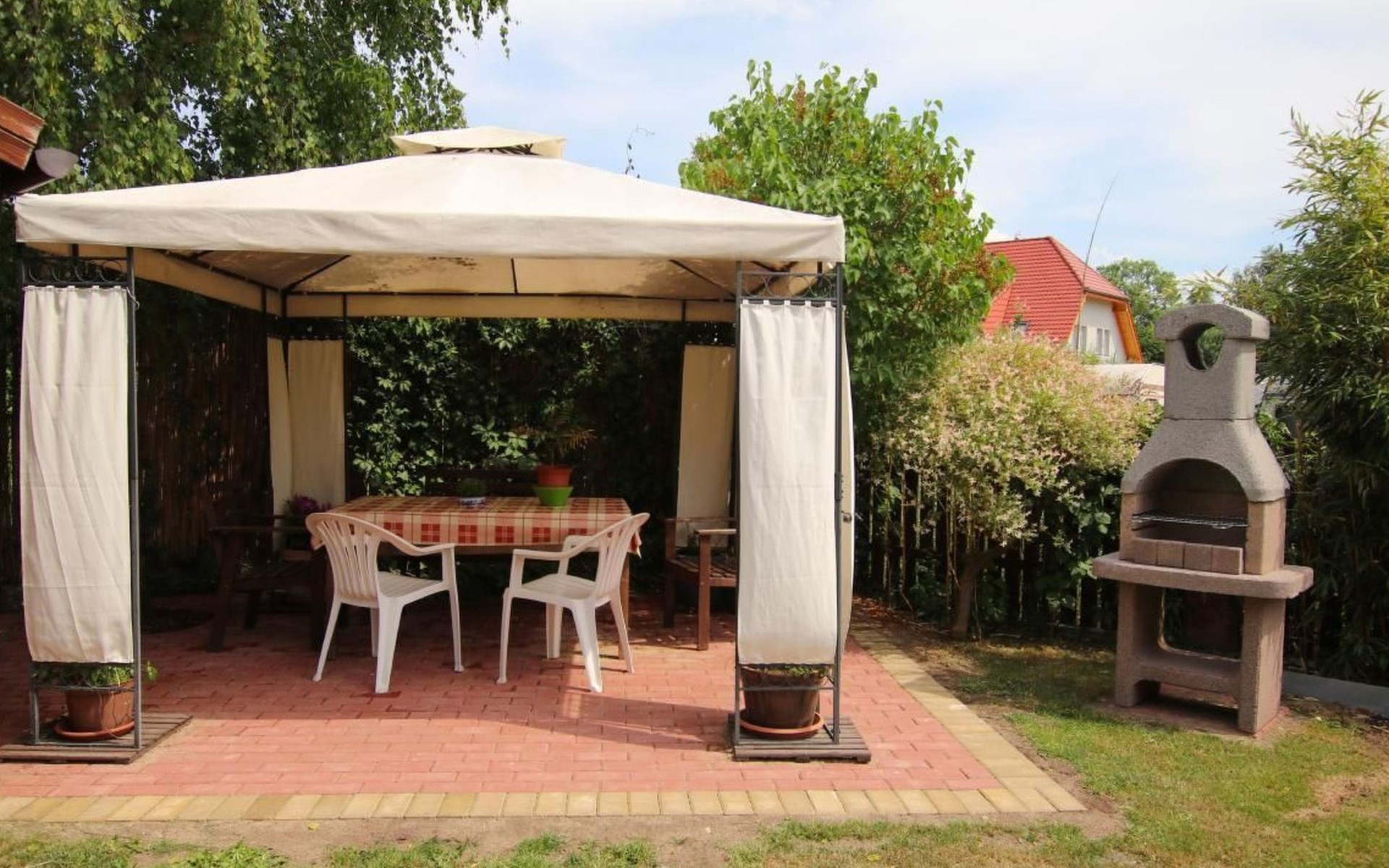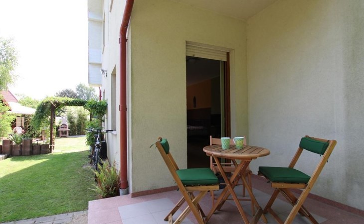 Im Außenbereich lädt eine Terrasse zum Verweilen ein, ideal, um in den frühen Morgenstunden einen Kaffee in der ruhigen Umgebung zu genießen oder in den Abendstunden entspannte Momente im Freien zu verbringen. Der Garten zur gemeinschaftlichen Nutzung bietet genügend Raum für Erholung und ist mit einem Grill ausgestattet, der für gemütliche Grillabende zur Verfügung steht.