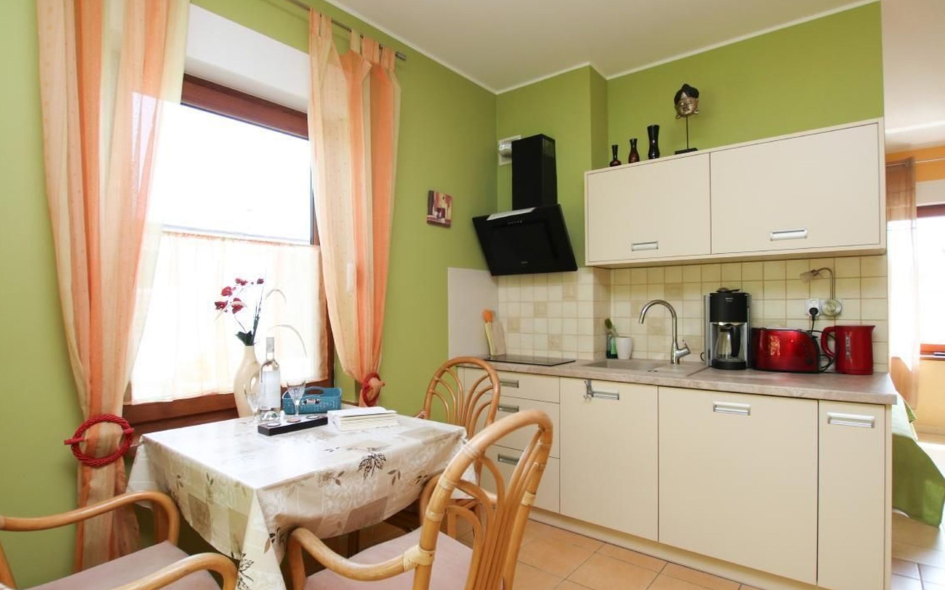 Die Wohnung ist praktisch und wohldurchdacht eingerichtet, um Ihnen einen komfortablen Aufenthalt zu garantieren. Eine kleine, aber feine Küchenzeile mit einem 2-Platten-Herd, Filter-Kaffeemaschine und Wasserkocher steht Ihnen zur Verfügung, um den Tag mit einem selbstgemachten Frühstück zu starten. Ferner gehört zur Wohnung ein Badezimmer mit Dusche, in dem Sie sich nach einem langen Tag am Strand erfrischen können.