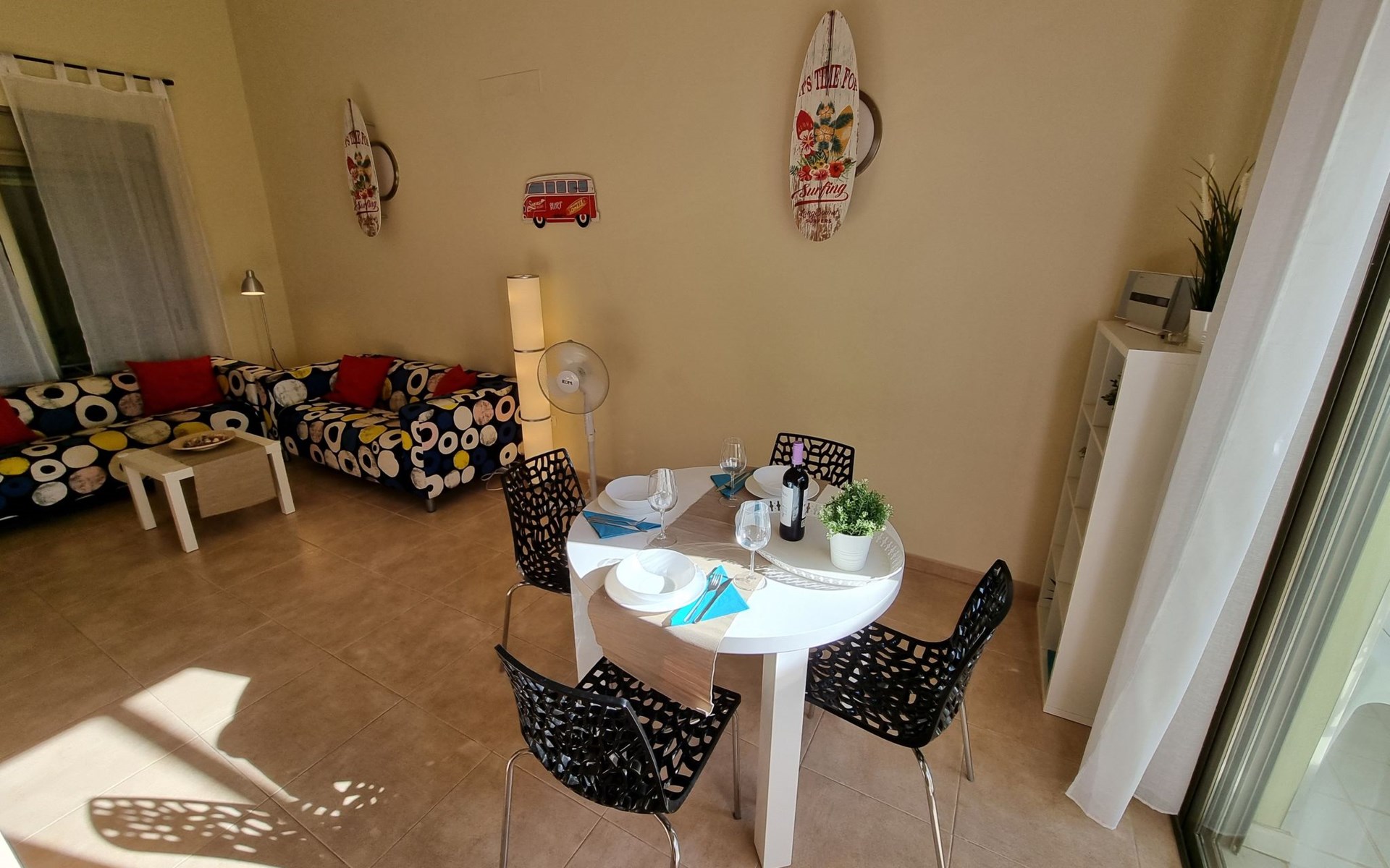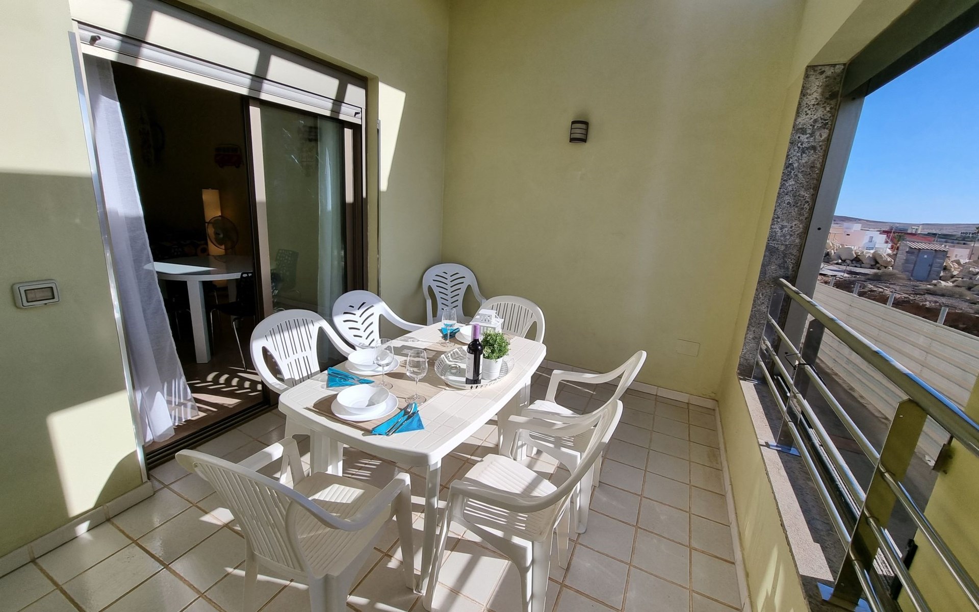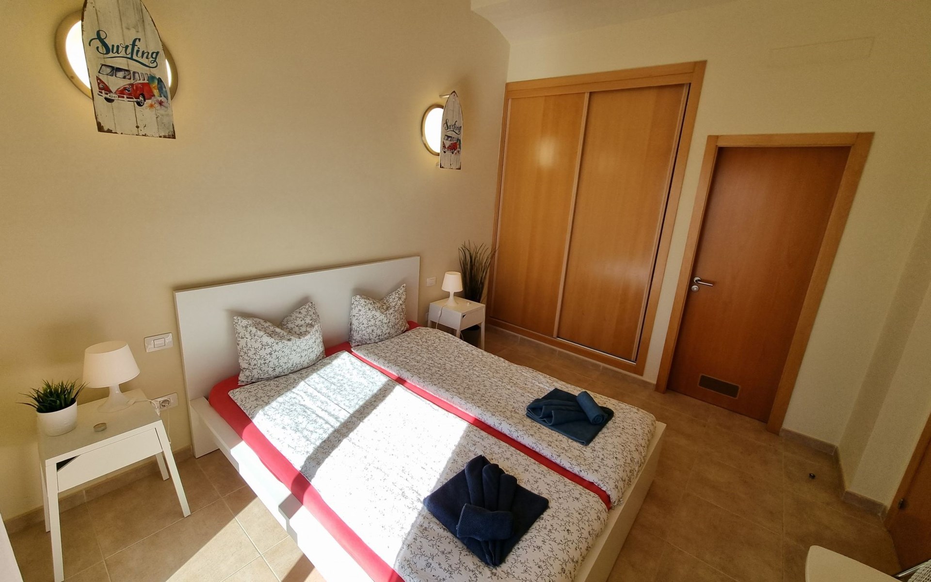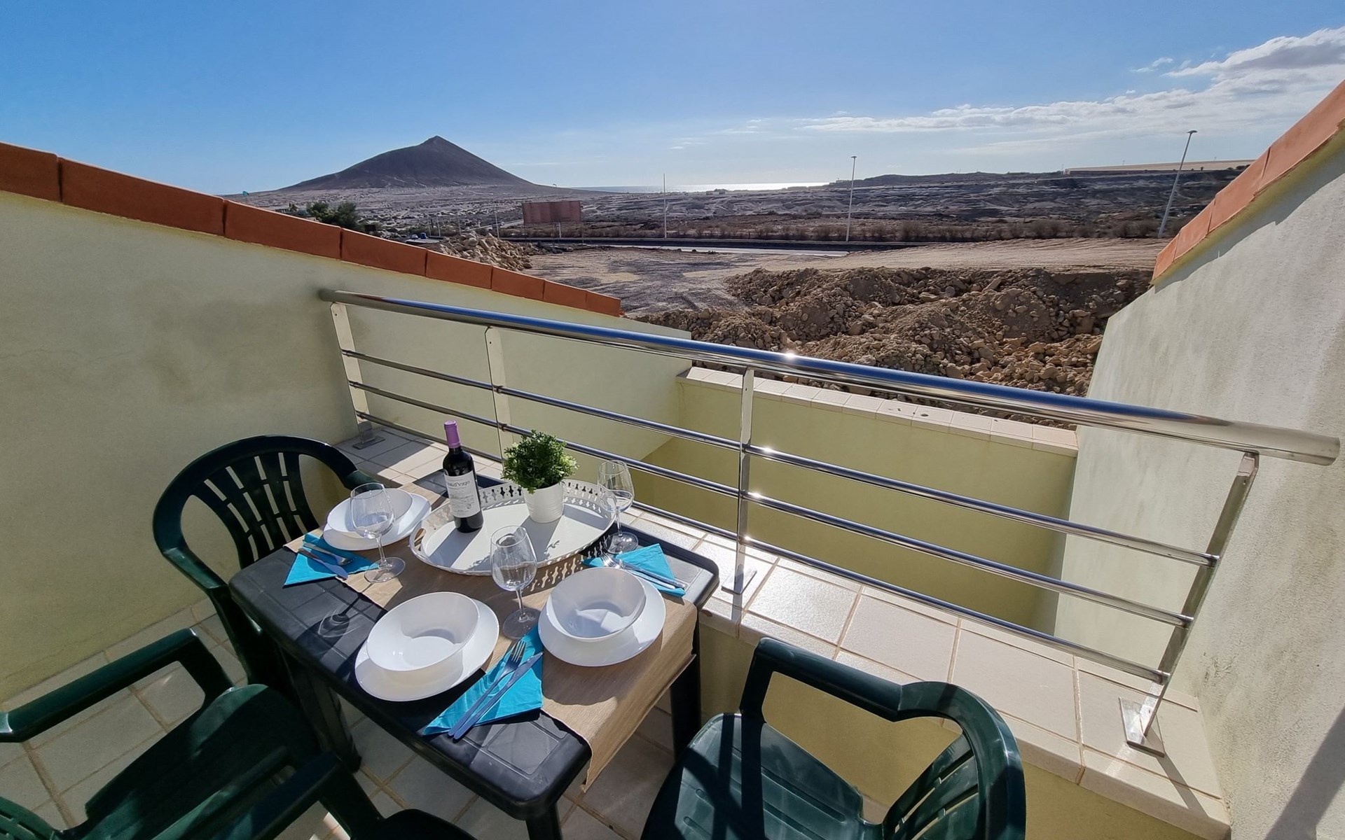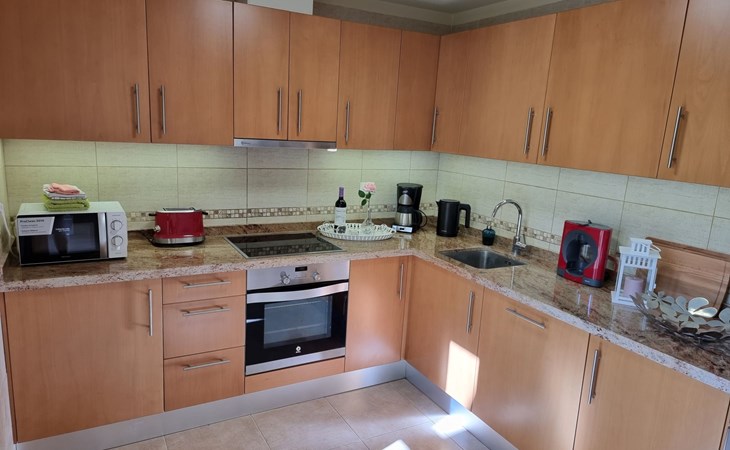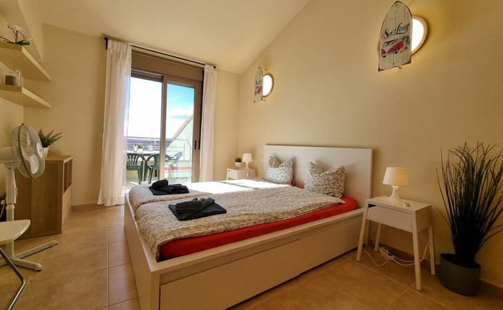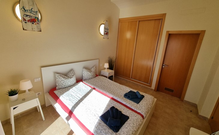 Die lichtdurchflutete moderne Villa Los Vientos bietet auf zwei Etagen viel Platz und Komfort mit einem schönem Balkon und großer Terrasse am Rande des weitläufigen Naturschutzgebiets von El Médano in unmittelbarer Strandnähe des Surfer- und Kiterhotspot.Das neu und modern eingerichtete Haus liegt nur etwa 100 Meter Fußweg vom beliebten Naturstrand El Médanos entfernt - besonders ideal für Surfer und alle Wassersportler, die den Strand mit ihren Boards in etwa 2 Minuten zu Fuß erreichen und ihre gesamte Ausrüstung auf der großen Terrasse des Hauses sicher unterbringen können. Aber auch für Familien mit Kindern ist das Haus sehr gut geeignet, da diese durch die hervorragende Lage des Hauses in Strandnähe schnell den Strand erreichen können und somit nicht auf ein Auto angewiesen sind. Und auch alle Geschäfte des täglichen Bedarfs kann man fußläufig in nur wenigen Gehminuten erreichen.Da in der gepflegten Wohnanlage vorwiegend Dauermieter leben, ist es immer schön ruhig und es gibt keine lauten Partyabende wie in vielen anderen Anlagen.Das offen gestaltete Haus verfügt über zwei Ebenen und ist für 5 Personen eingerichtet. Es ist 95 Quadratmeter groß und erscheint besonders groß und luftig, weil die Decken schräg nach oben verlaufen so dass es auch im Sommer nie heiß und stickig wird.In der oberen Etage des Hauses liegt das große Schlafzimmer mit einem riesigen Einbauschrank, ein helles und schönes Badezimmer en Suite mit Bidet sowie ein toller Balkon mit fantastischem Blick auf das Meer und den beeindruckenden roten Vulkanberg Montaña Roja.In der unteren Etage befindet sich das zweite Schlafzimmer (ebenfalls mit großem Einbauschrank) mit einem gegenüberliegendem Badezimmer, einem großen hellen Wohnzimmer mit 2 Sofas, SAT-Flachbildfernseher (mit internationalen TV-Kanälen) und einer gemütlichen Essecke. Hier befindet sich auch ein großer Abstellraum in dem man bequem alle Surf- und Strandutensilien unterbringen kann.Da die Schlafzimmer auf verschiedenen Ebenen liegen und jedes ein eigenes Bad hat, ist das Haus auch gut für ein befreundetes Paar als Ferienunterkunft geeignet.Die komplett neue offene und hochwertige große Echtholz-Küche zeichnet sich durch großzügige Granitarbeitsflächen aus und ist ausgestattet mit einem Induktionsherd mit Cerankochfeldern und Backofen, einem großen Kühlschrank mit mehreren Gefrierfächern, einer Spülmaschine, Mikrowelle, Toaster, Wasserkocher, Kaffeemaschine und einer Espressomaschine. Es sind ausreichend Teller, Gläser, Tassen, Töpfe und Pfannen in verschiedenen Größen vorhanden.Weiterhin verfügt das Haus über ein schnelles und stabiles Wifi-Netz mit Glasfaser-Geschwindigkeit, was für Gäste die zwischendurch arbeiten müssen sehr vorteilhaft ist. Außerdem gibt es eine Waschmaschine, Wäscheständer, Bügelbrett und Bügeleisen.Zum Entspannen steht eine große überdachte Sonnenterrasse mit Fensterschiebetüren zur Verfügung, von der aus man den herrlichen Meerblick bewundern kann. Hier kann man den Sonnenaufgang mit einer Tasse Kaffee, das Frühstück in gemütlicher Atmosphäre sowie das Abendessen bei einem schönen Sonnenuntergang genießen.Das Besondere an der Lage des Hauses ist - neben der unmittelbaren Nähe zum Strand und dem Blick auf die roten Vulkanberg Montaña Roja - der beeindruckende Blick auf den fast 3.900 m hohen Vulkanberg Teide. Dieser ist im Winter oft mit Schnee bedeckt und bietet dann einen einfach atemberaubenden Anblick!Bienvenidos und herzlich willkommen in El Médano!Einmal im Jahr findet der für Surfer sehr wichtige „Windsurf World Cup“ in Médano stattfindet. Zu dem Event kommen jährlich die besten Windsurfer aus aller Welt - und das Ereignis findet fast genau vor dem Haus statt!Nur zwei Häuser neben der Villa liegt auch der Kiteclub „El Médano Kiteclub“. An manchen Tagen kann man das Meeresrauschen hören.