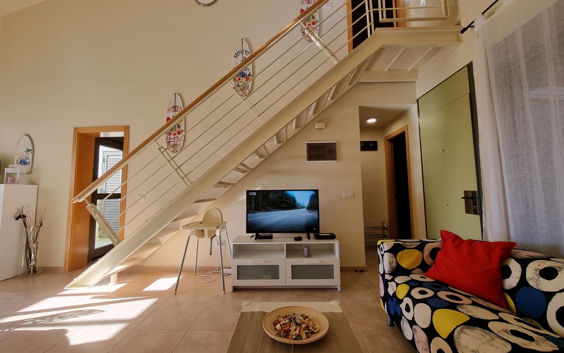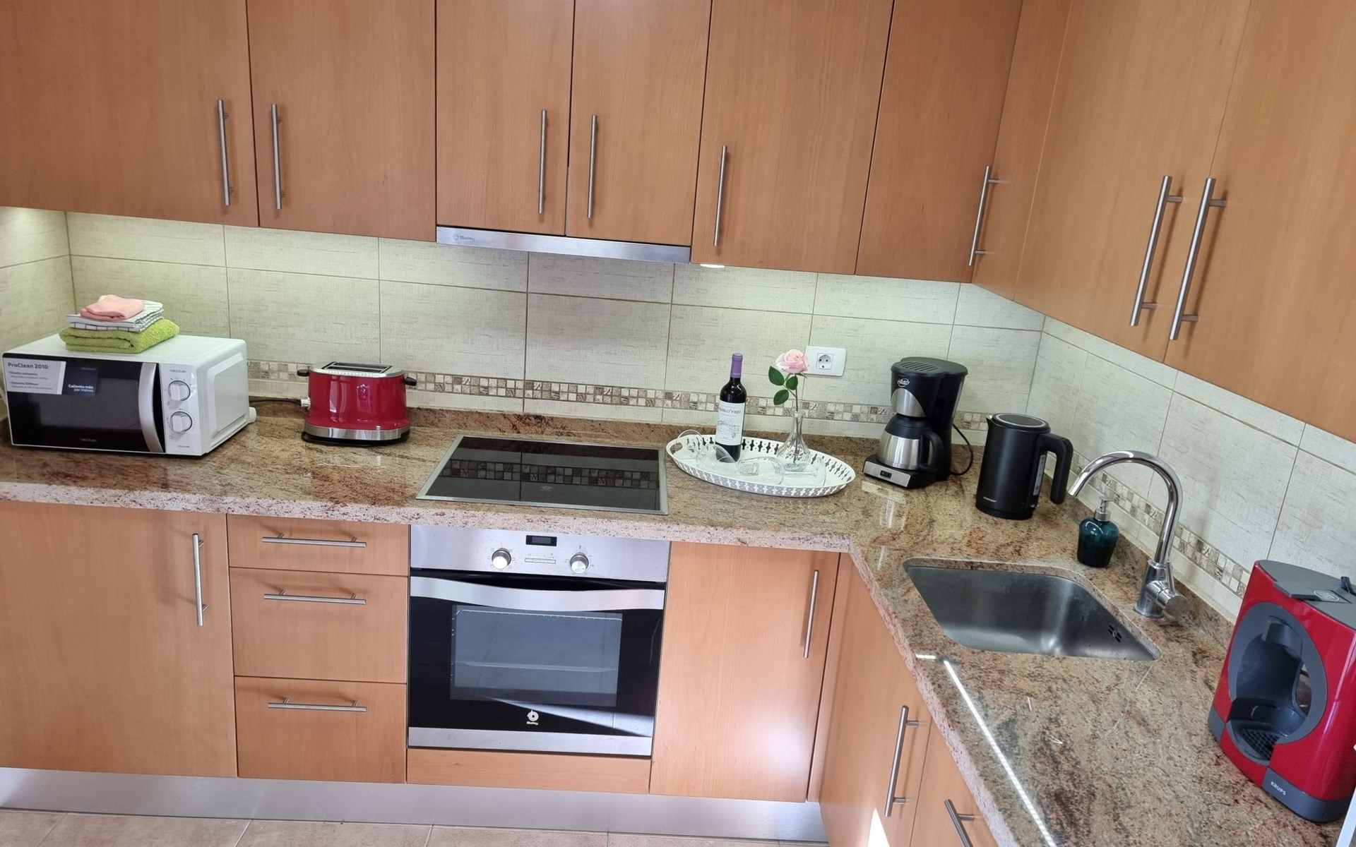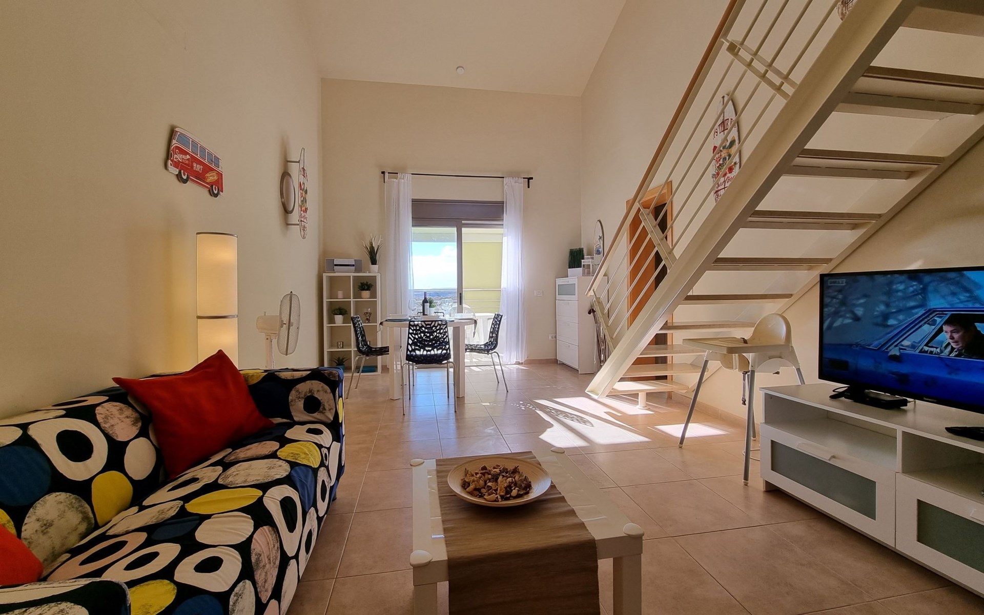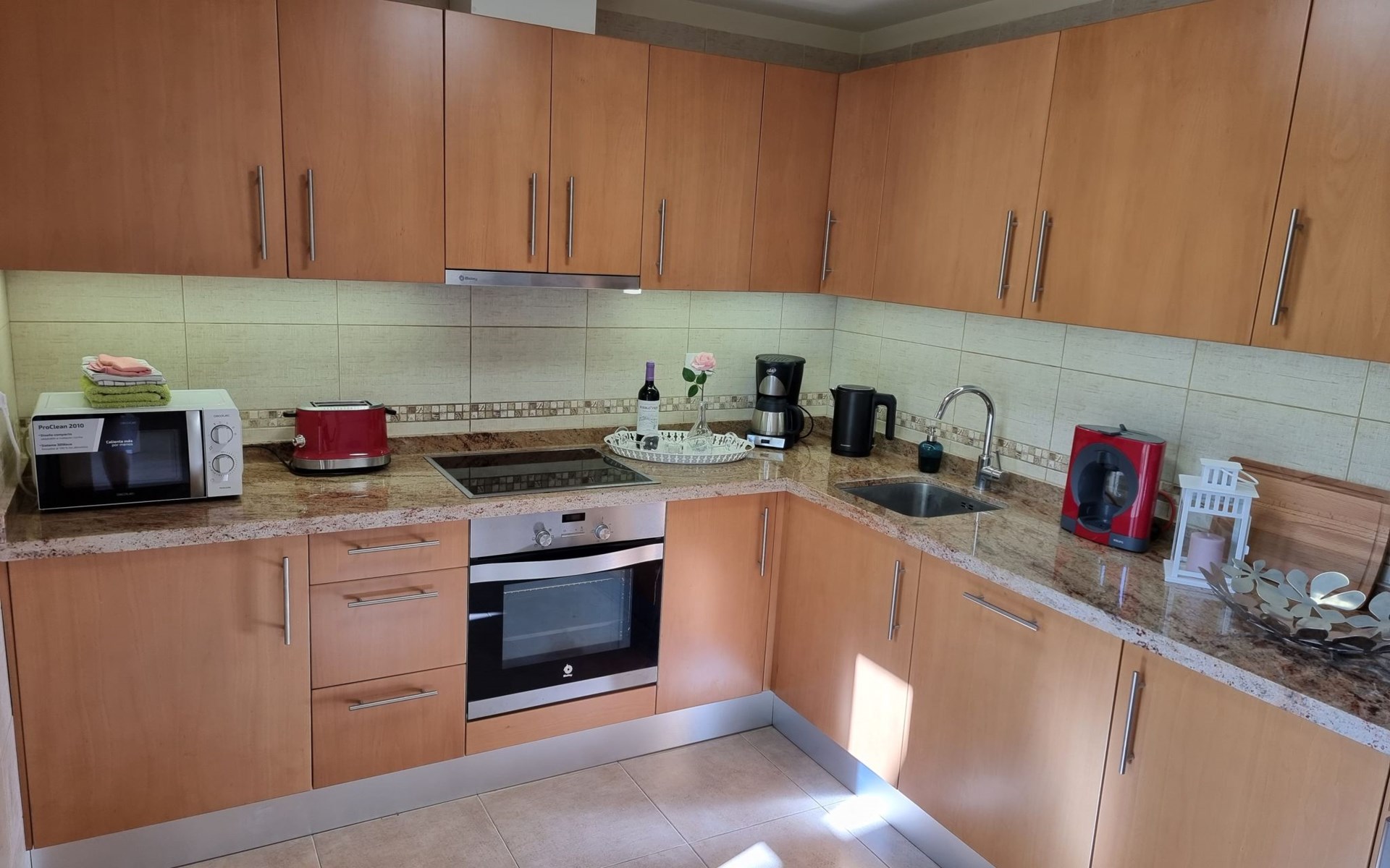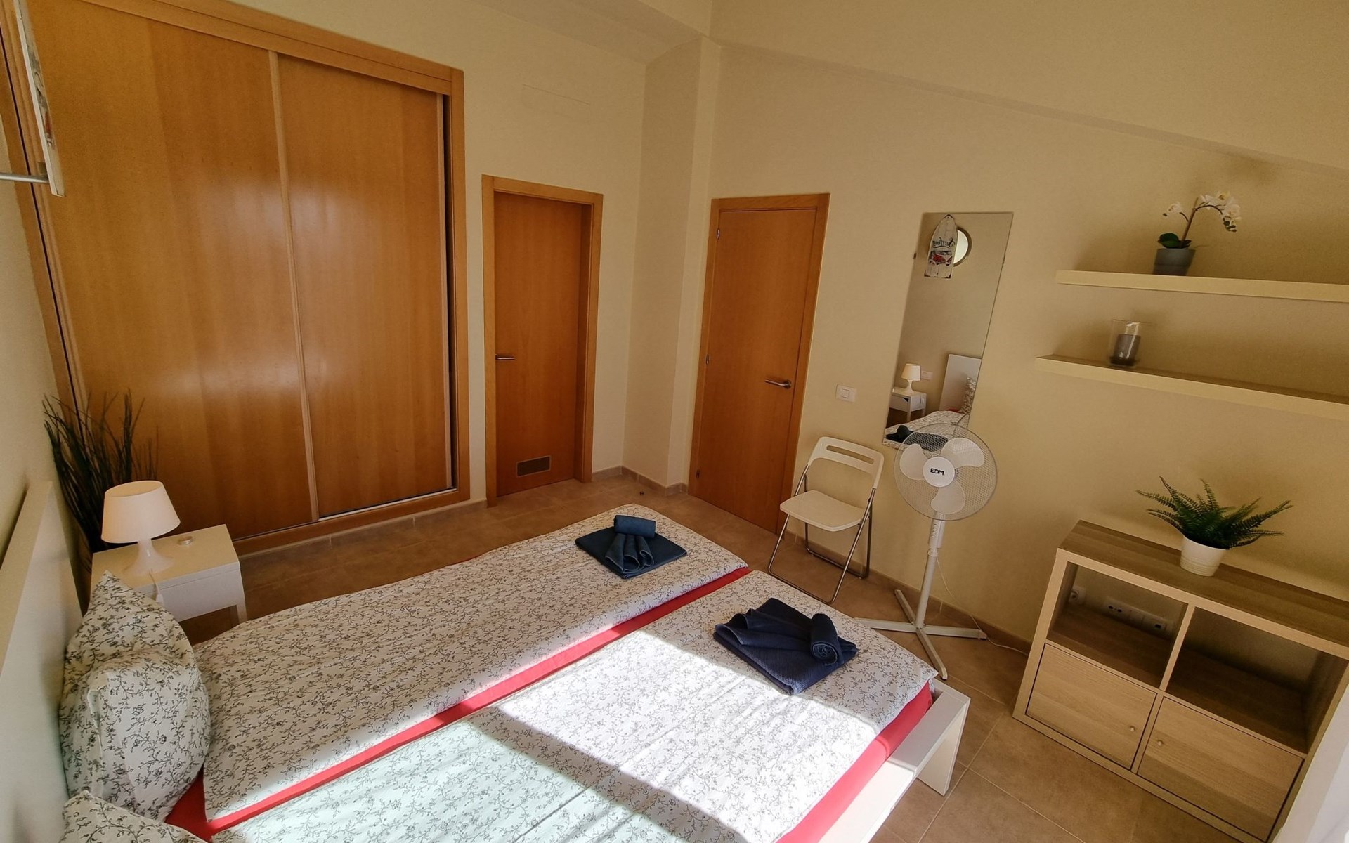 Die lichtdurchflutete moderne Villa Los Vientos bietet auf zwei Etagen viel Platz und Komfort mit einem schönem Balkon und großer Terrasse am Rande des weitläufigen Naturschutzgebiets von El Médano in unmittelbarer Strandnähe des Surfer- und Kiterhotspot.Das neu und modern eingerichtete Haus liegt nur etwa 100 Meter Fußweg vom beliebten Naturstrand El Médanos entfernt - besonders ideal für Surfer und alle Wassersportler, die den Strand mit ihren Boards in etwa 2 Minuten zu Fuß erreichen und ihre gesamte Ausrüstung auf der großen Terrasse des Hauses sicher unterbringen können. Aber auch für Familien mit Kindern ist das Haus sehr gut geeignet, da diese durch die hervorragende Lage des Hauses in Strandnähe schnell den Strand erreichen können und somit nicht auf ein Auto angewiesen sind. Und auch alle Geschäfte des täglichen Bedarfs kann man fußläufig in nur wenigen Gehminuten erreichen.Da in der gepflegten Wohnanlage vorwiegend Dauermieter leben, ist es immer schön ruhig und es gibt keine lauten Partyabende wie in vielen anderen Anlagen.Das offen gestaltete Haus verfügt über zwei Ebenen und ist für 5 Personen eingerichtet. Es ist 95 Quadratmeter groß und erscheint besonders groß und luftig, weil die Decken schräg nach oben verlaufen so dass es auch im Sommer nie heiß und stickig wird.In der oberen Etage des Hauses liegt das große Schlafzimmer mit einem riesigen Einbauschrank, ein helles und schönes Badezimmer en Suite mit Bidet sowie ein toller Balkon mit fantastischem Blick auf das Meer und den beeindruckenden roten Vulkanberg Montaña Roja.In der unteren Etage befindet sich das zweite Schlafzimmer (ebenfalls mit großem Einbauschrank) mit einem gegenüberliegendem Badezimmer, einem großen hellen Wohnzimmer mit 2 Sofas, SAT-Flachbildfernseher (mit internationalen TV-Kanälen) und einer gemütlichen Essecke. Hier befindet sich auch ein großer Abstellraum in dem man bequem alle Surf- und Strandutensilien unterbringen kann.Da die Schlafzimmer auf verschiedenen Ebenen liegen und jedes ein eigenes Bad hat, ist das Haus auch gut für ein befreundetes Paar als Ferienunterkunft geeignet.Die komplett neue offene und hochwertige große Echtholz-Küche zeichnet sich durch großzügige Granitarbeitsflächen aus und ist ausgestattet mit einem Induktionsherd mit Cerankochfeldern und Backofen, einem großen Kühlschrank mit mehreren Gefrierfächern, einer Spülmaschine, Mikrowelle, Toaster, Wasserkocher, Kaffeemaschine und einer Espressomaschine. Es sind ausreichend Teller, Gläser, Tassen, Töpfe und Pfannen in verschiedenen Größen vorhanden.Weiterhin verfügt das Haus über ein schnelles und stabiles Wifi-Netz mit Glasfaser-Geschwindigkeit, was für Gäste die zwischendurch arbeiten müssen sehr vorteilhaft ist. Außerdem gibt es eine Waschmaschine, Wäscheständer, Bügelbrett und Bügeleisen.Zum Entspannen steht eine große überdachte Sonnenterrasse mit Fensterschiebetüren zur Verfügung, von der aus man den herrlichen Meerblick bewundern kann. Hier kann man den Sonnenaufgang mit einer Tasse Kaffee, das Frühstück in gemütlicher Atmosphäre sowie das Abendessen bei einem schönen Sonnenuntergang genießen.Das Besondere an der Lage des Hauses ist - neben der unmittelbaren Nähe zum Strand und dem Blick auf die roten Vulkanberg Montaña Roja - der beeindruckende Blick auf den fast 3.900 m hohen Vulkanberg Teide. Dieser ist im Winter oft mit Schnee bedeckt und bietet dann einen einfach atemberaubenden Anblick!Bienvenidos und herzlich willkommen in El Médano!Einmal im Jahr findet der für Surfer sehr wichtige „Windsurf World Cup“ in Médano stattfindet. Zu dem Event kommen jährlich die besten Windsurfer aus aller Welt - und das Ereignis findet fast genau vor dem Haus statt!Nur zwei Häuser neben der Villa liegt auch der Kiteclub „El Médano Kiteclub“. An manchen Tagen kann man das Meeresrauschen hören.
