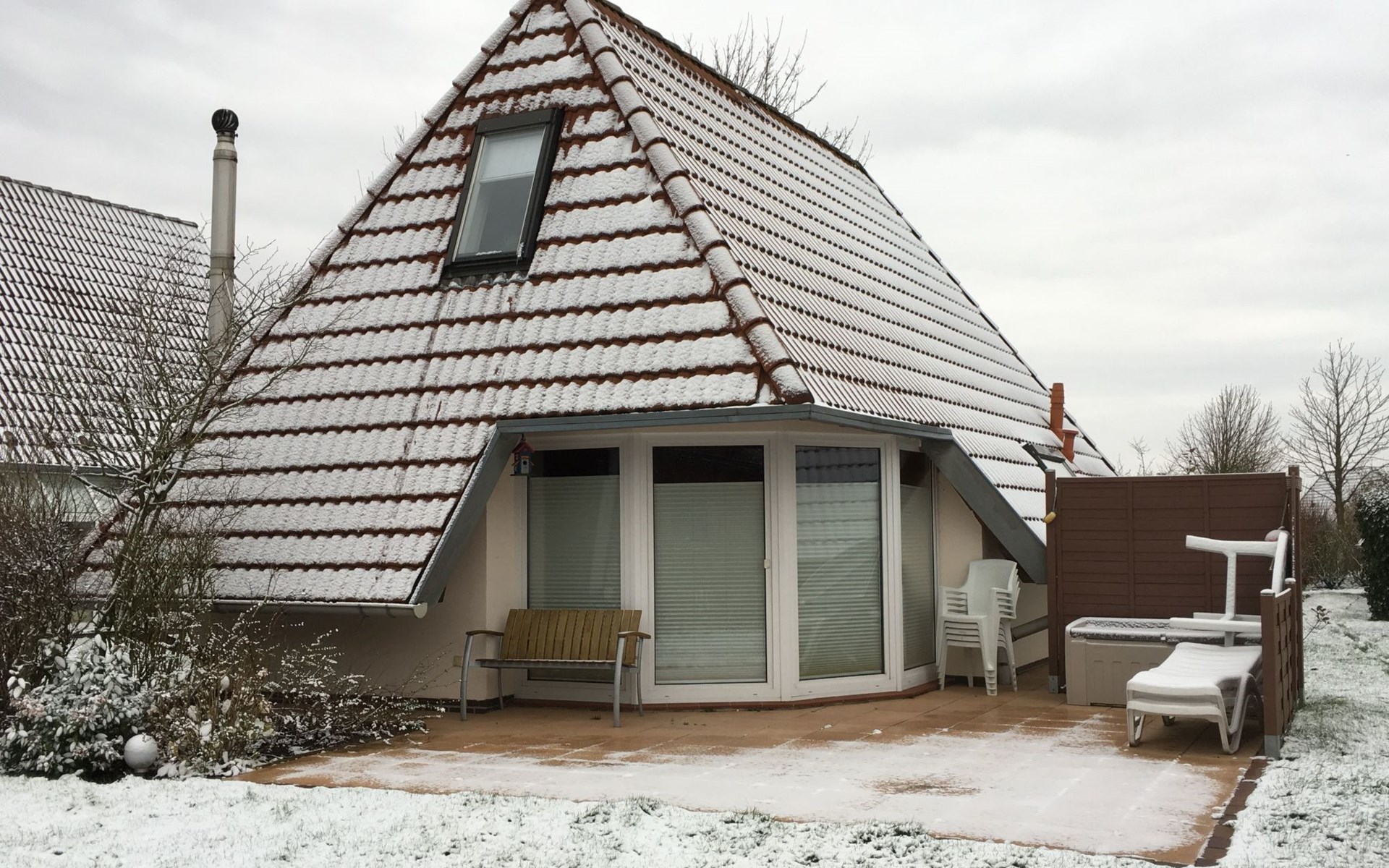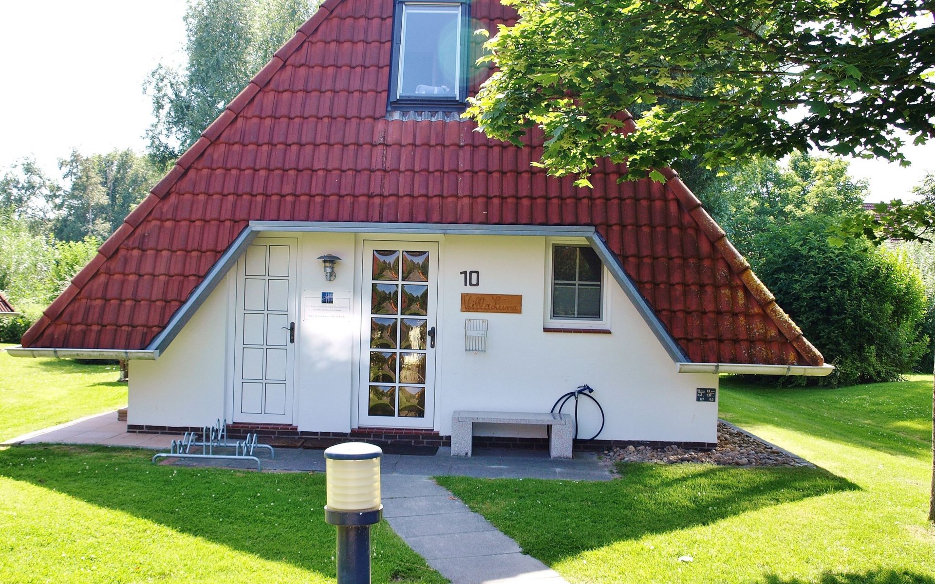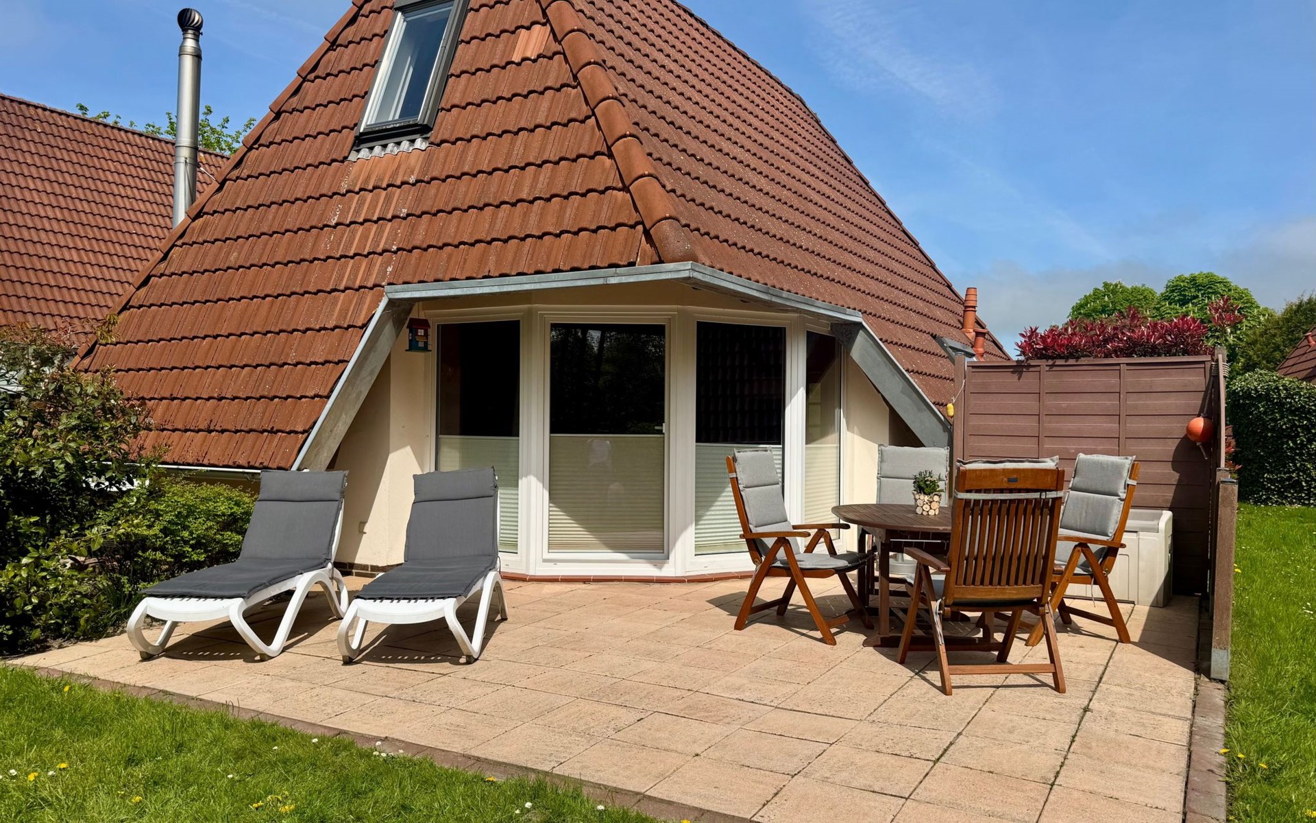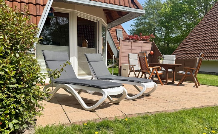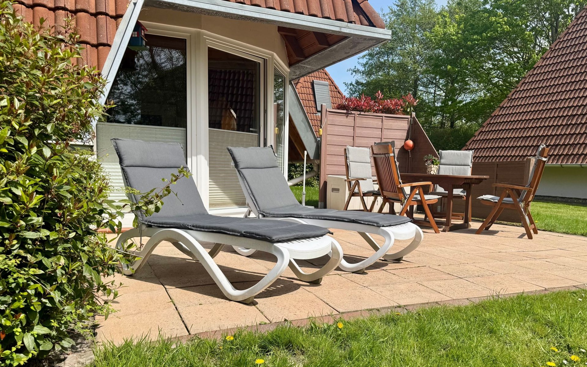 Um die Villa herum finden Sie eine Rasenfläche, die zum Verweilen einlädt. Da die Terrasse Südausrichtung hat, scheint den ganzen Tag die Sonne auf Terrasse und Garten. Der Garten- und Terrassenbereich ist nicht einsehbar, so dass Sie dort in Ruhe entspannen können.