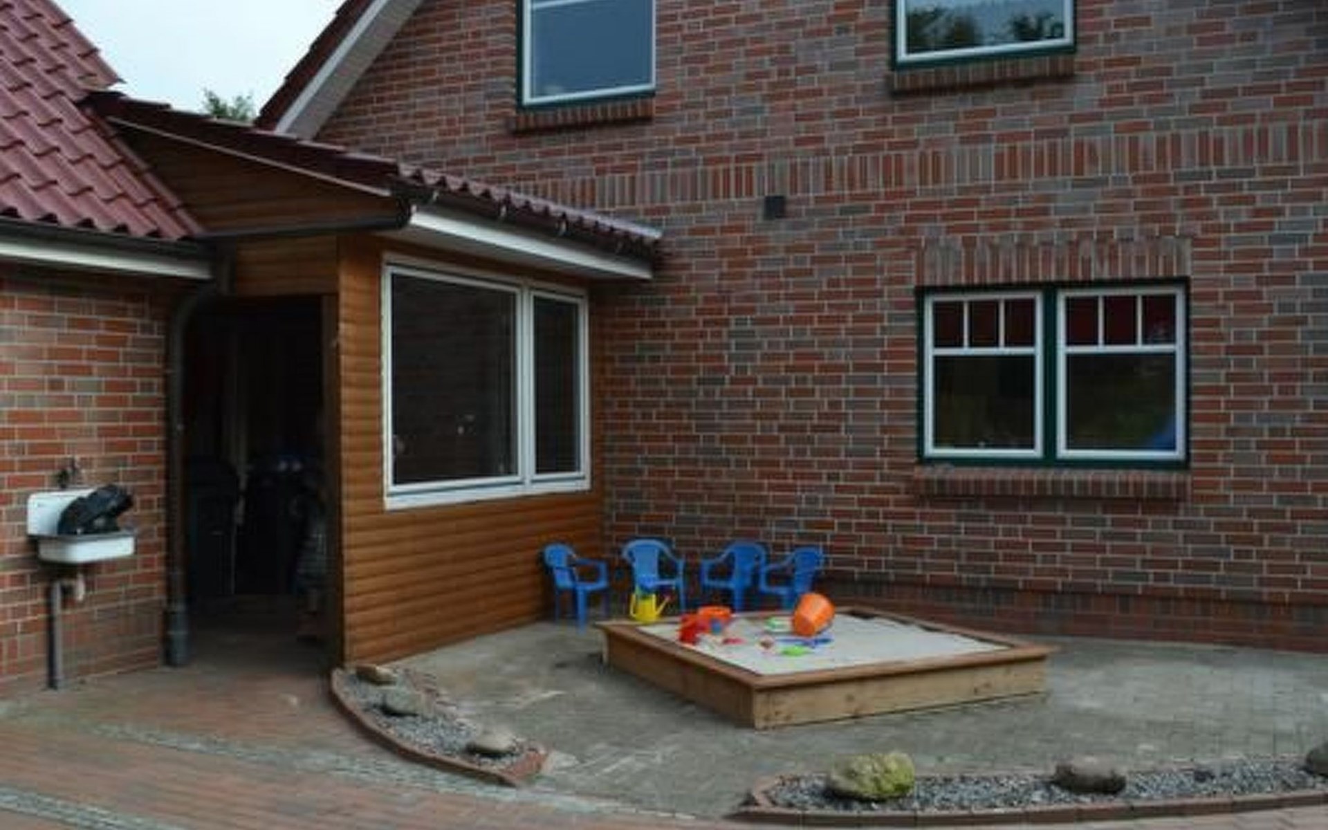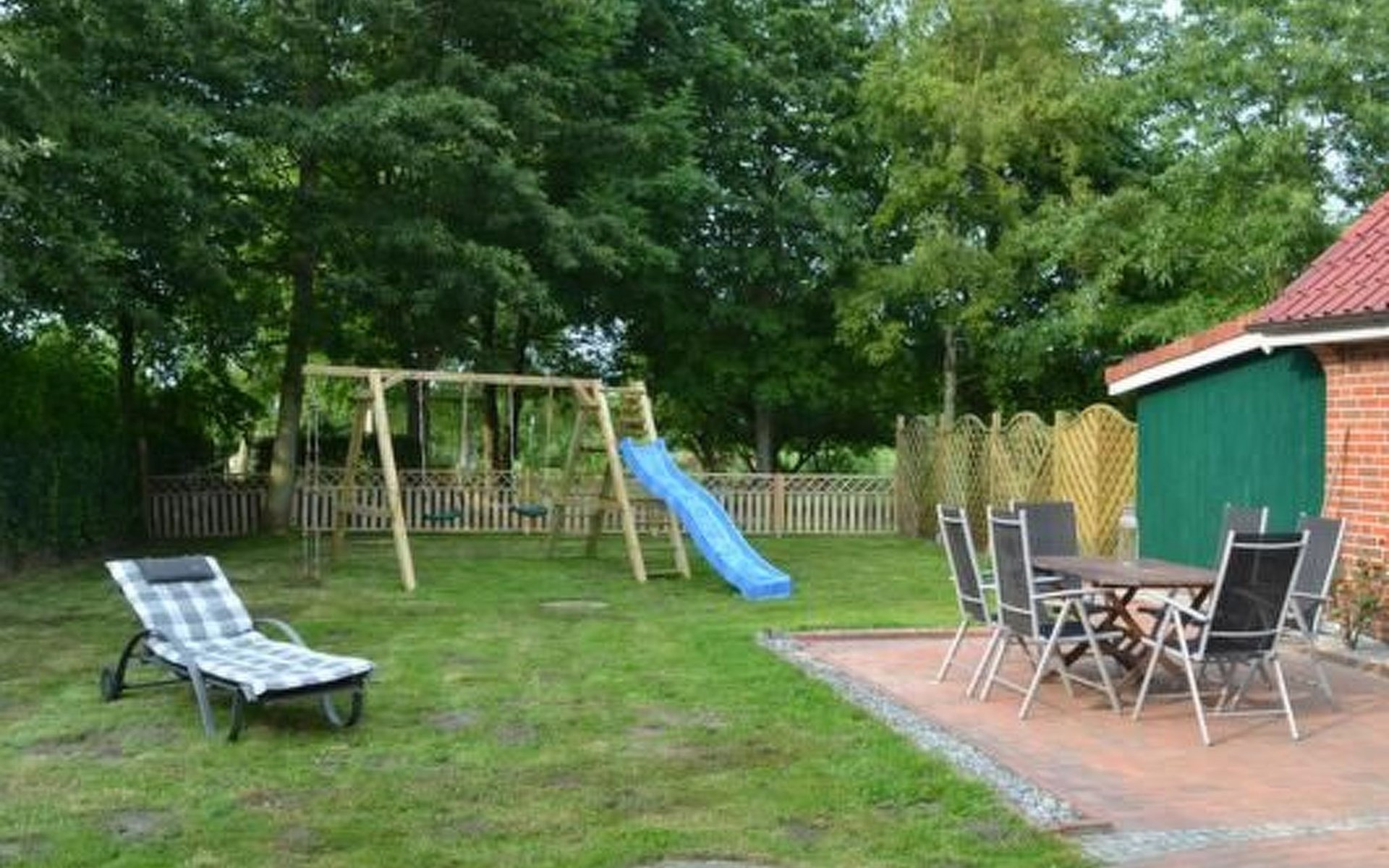 Der Außenbereich des Ferienhauses ist von einem eingezäunten Garten umgeben, der besonders familienfreundlich mit Schaukel, Rutsche und Sandkasten gestaltet ist. Ein Grill steht für unvergessliche Sommerabende bereit. Genießen Sie die Privatsphäre und Ruhe, während Ihre Kinder sicher spielen.