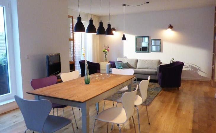Sonstige Wohnzimmerausstattung : Das Wohn- und Esszimmer ist der zentrale Raum des Appartments und auf die angrenzende Terrasse mit Blick auf den Hafen orientiert. Die Ausstattung mit Holzboden, Teppich und unterschiedlichen Möbeln ist modern und mit Designanspruch ausgewählt.