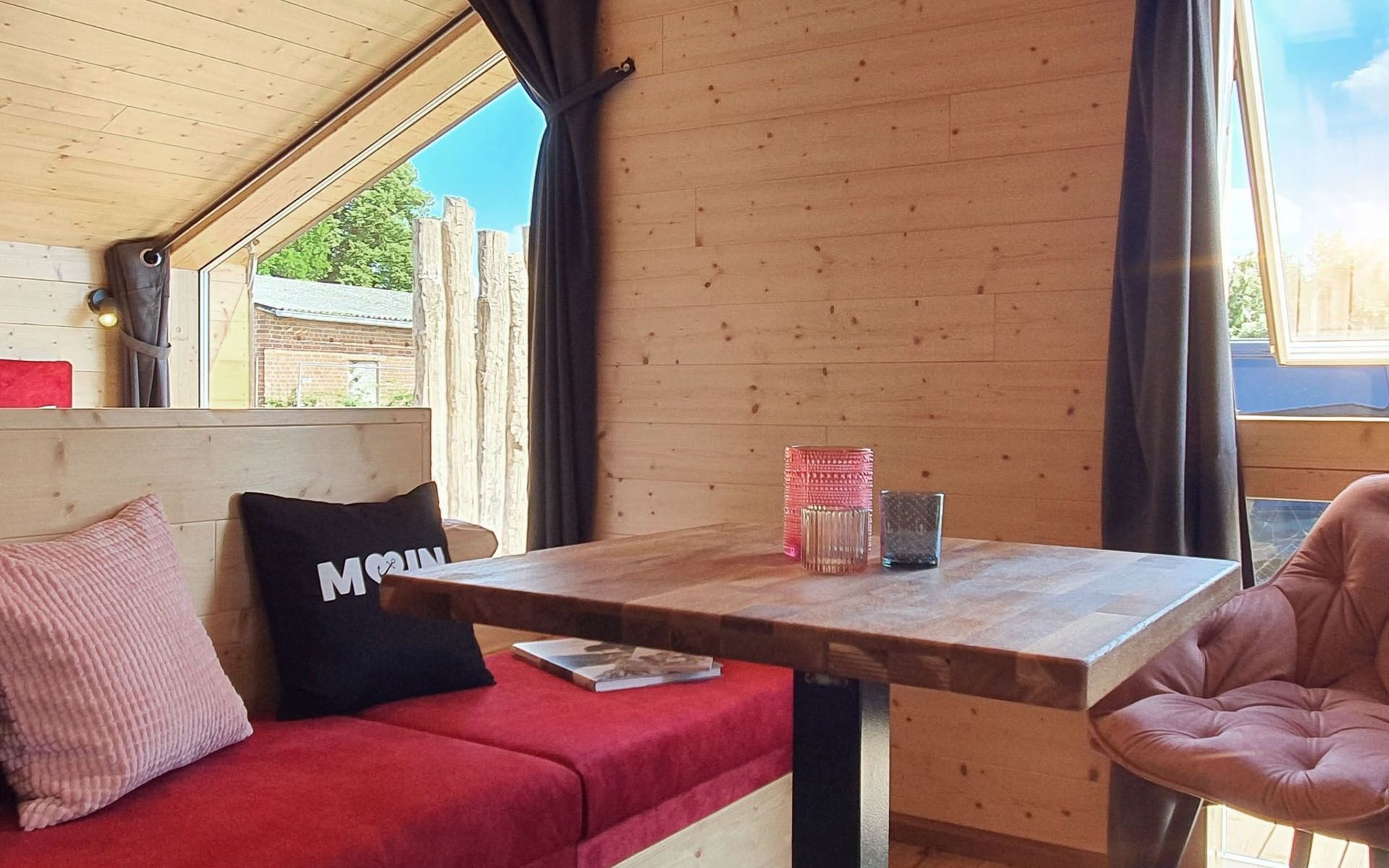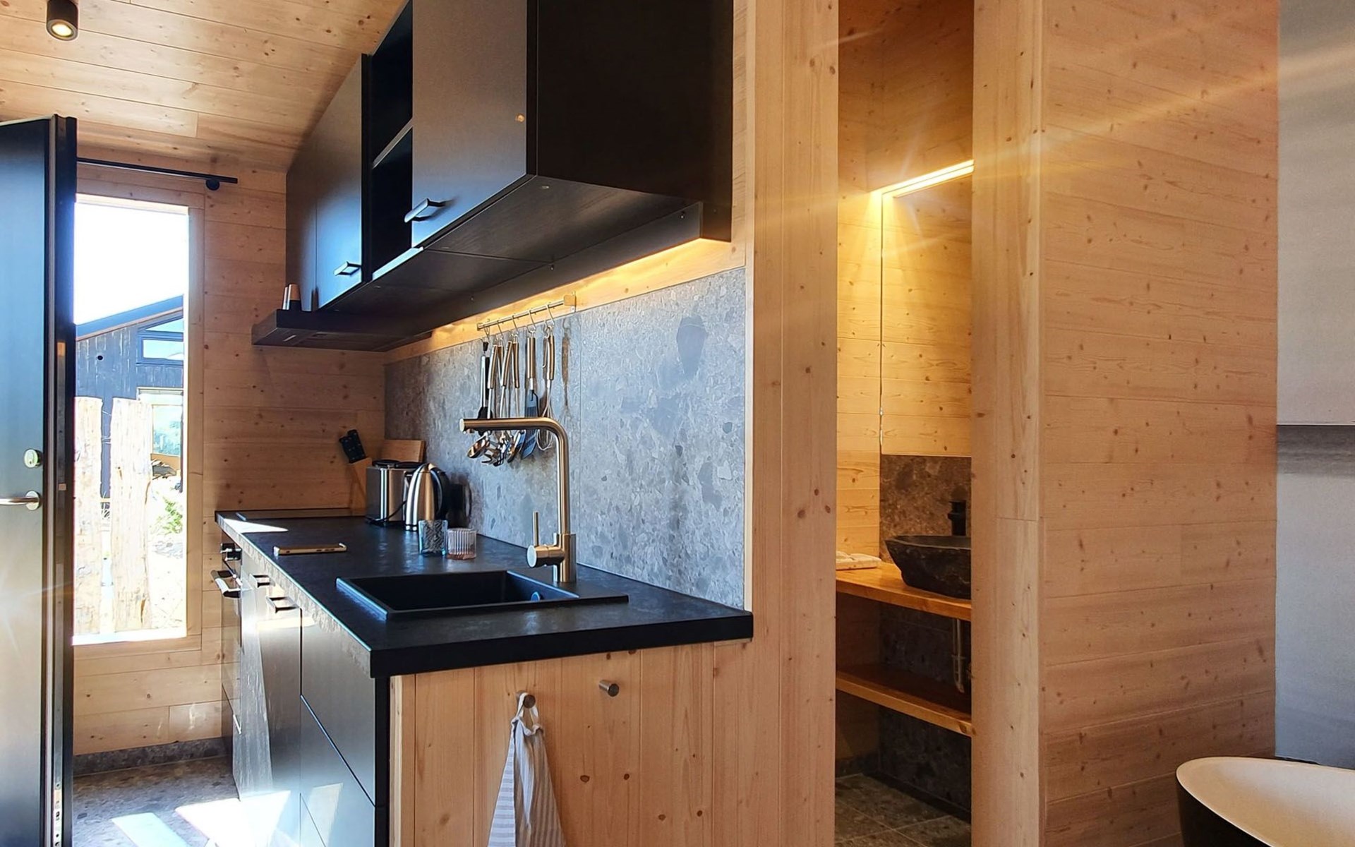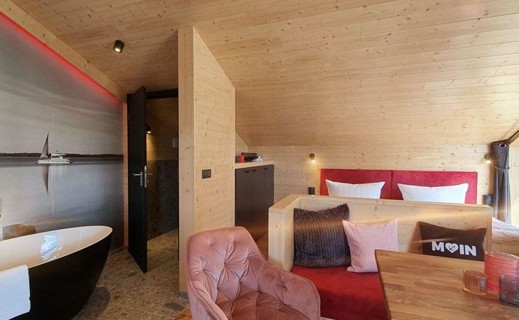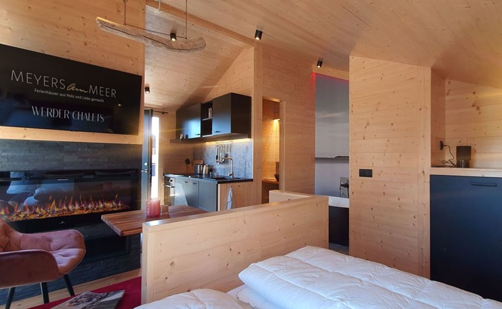 Der Innenraum unseres Ferienhauses verzaubert mit modernem Komfort und liebevollen Details. Ein großes Kingsize-Bett lädt zu kuscheligen Netflix-Nächten ein, während die kleine, fein ausgestattete Küche Selbstversorgung zum Vergnügen macht. Ein absolutes Highlight ist die freistehende Badewanne, die zusammen mit der Walk-In-Dusche für echtes Spa-Feeling sorgt. Abgerundet wird das Angebot durch den Elektrokamin, der an kühlen Abenden für behagliche Wärme und Romantik sorgt.