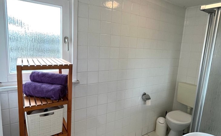 Das helle Badezimmer mit Dusche bietet alle Annehmlichkeiten, die Sie benötigen, um sich zu erfrischen und zu entspannen.