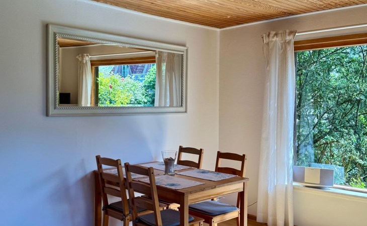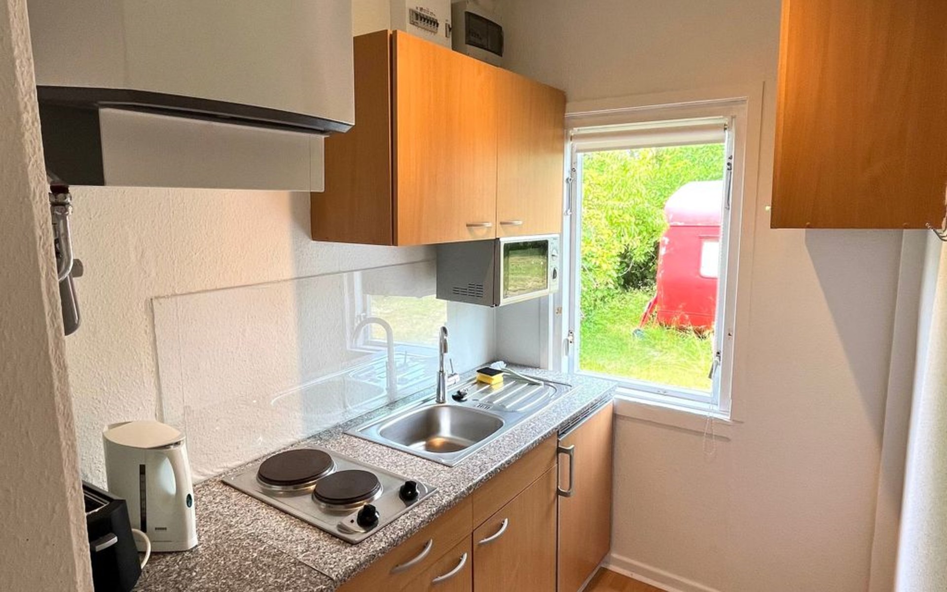 Die Küche ist mit einem 2 Plattenherd und Kühlschrank ausgestattet und bietet Ihnen die Möglichkeit, kleine Mahlzeiten zuzubereiten. Genießen Sie Ihre Mahlzeiten am Esstisch für vier Personen und lassen Sie sich von dem herrlichen Blick auf den Garten verzaubern.