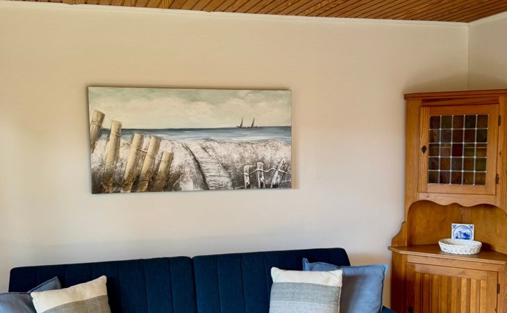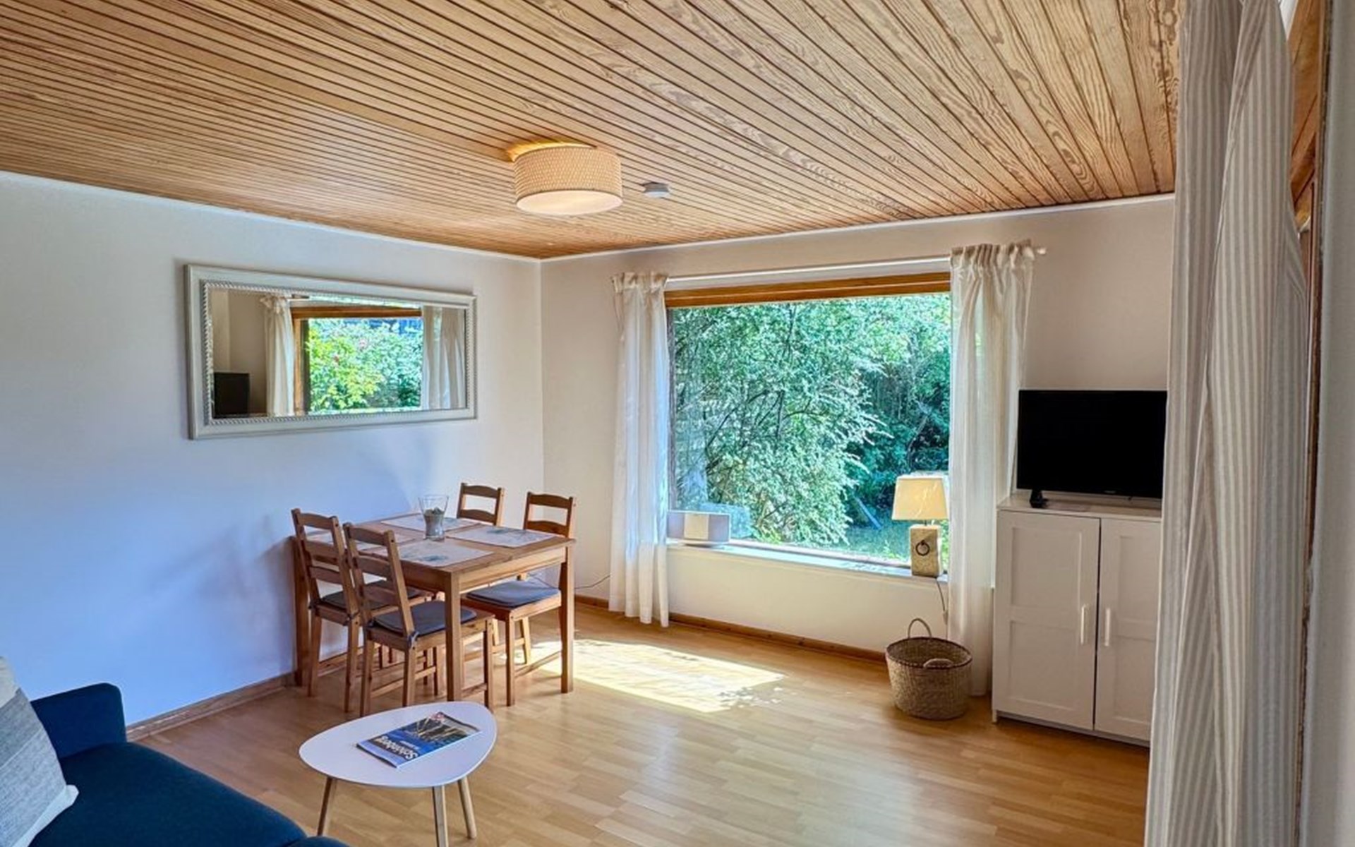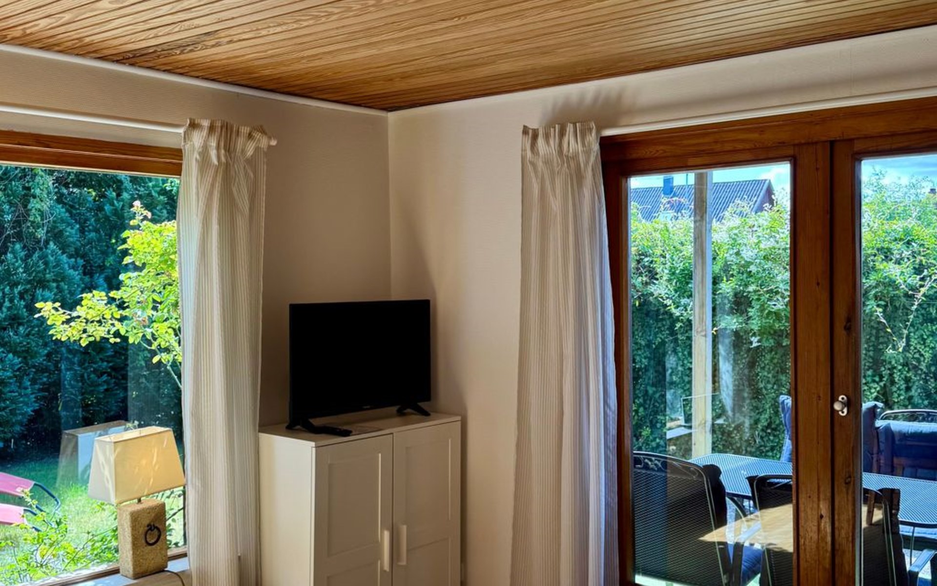 Der Wohnraum lädt zum Entspannen ein und ist mit einer bequemen Schlafcouch ausgestattet, die zusätzlichen Schlafplatz bietet. Hier können Sie sich zurücklehnen, fernsehen und die Aussicht auf den Garten genießen. Die großzügigen Fenster lassen viel Tageslicht herein und schaffen eine angenehme Atmosphäre.