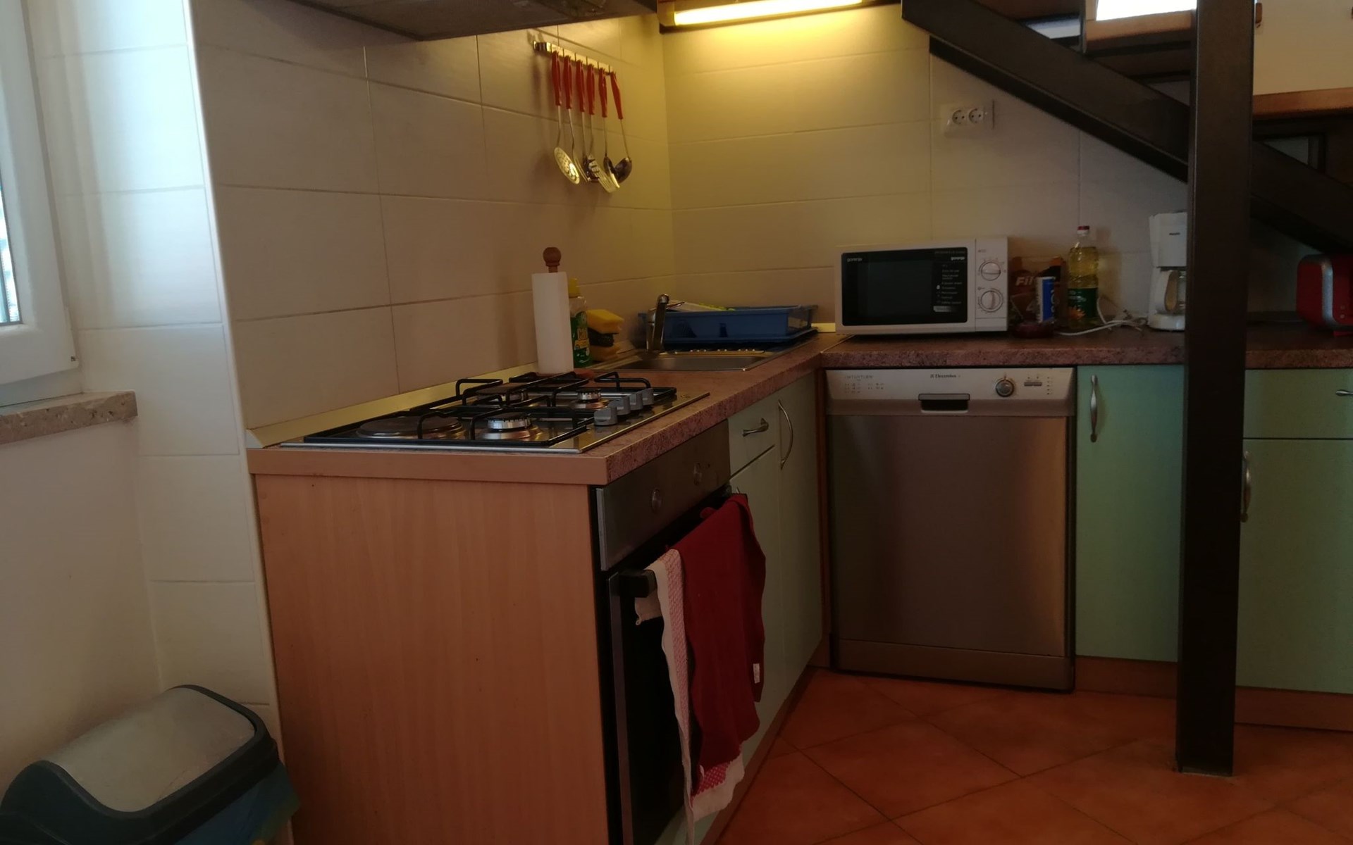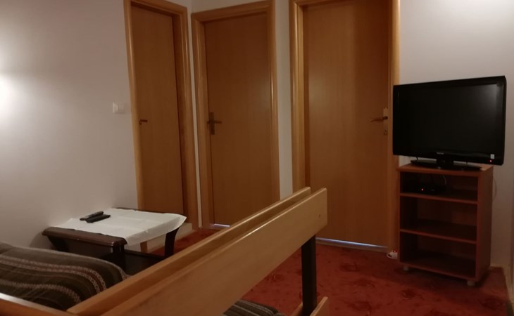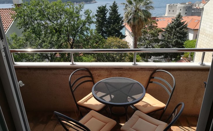 Die Wohnung erstreckt sich über 2 Ebenen: Die Eingangsebene ist ca. 45 qm groß und besteht aus einer gut ausgestatteten Küche (Herd mit Elektrobackofen, kombinierte Elektro- und Gasplatten, Mikrowelle, Toaster, Filterkaffeemaschine, Geschirrspüler, Kühlschrank, Tiefkühltruhe), Wohn-Essbereich, einem Bad mit Dusche/WC, sowie dem Schlafzimmer (1 Doppelbett +1 Einzelbett) mit Balkon. Das Obergeschoss ist ca. 40 qm groß und besteht aus einem Vorraum mit Couch, kleinem Tisch und dem Flachbild-Satelliten-TV, 2 Schlafzimmern (1/2 Zimmer und 1 Einzelzimmer) sowie einem Badezimmer (Dusche, WC, Waschmaschine). Von den Dachfenstern aus reicht der Blick von den Inseln im Osten bis zum westlichen Teil Dubrovniks mit den Festungen Minceta und St. Lawrence.