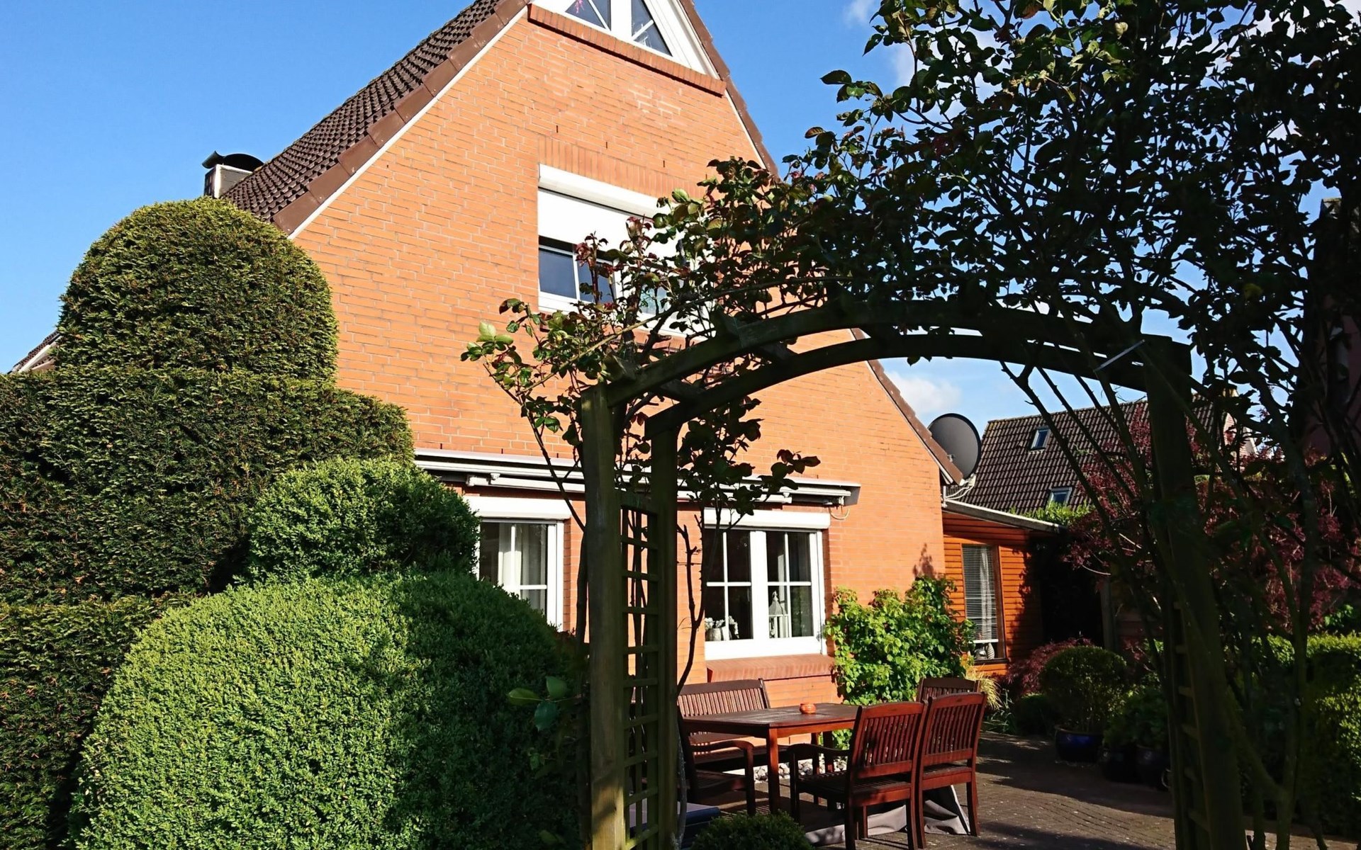 Unsere Ferienwohnung verfügt über eine großzügige Terrasse mit Sonnenschirm, Markise und Sonnenliegen.