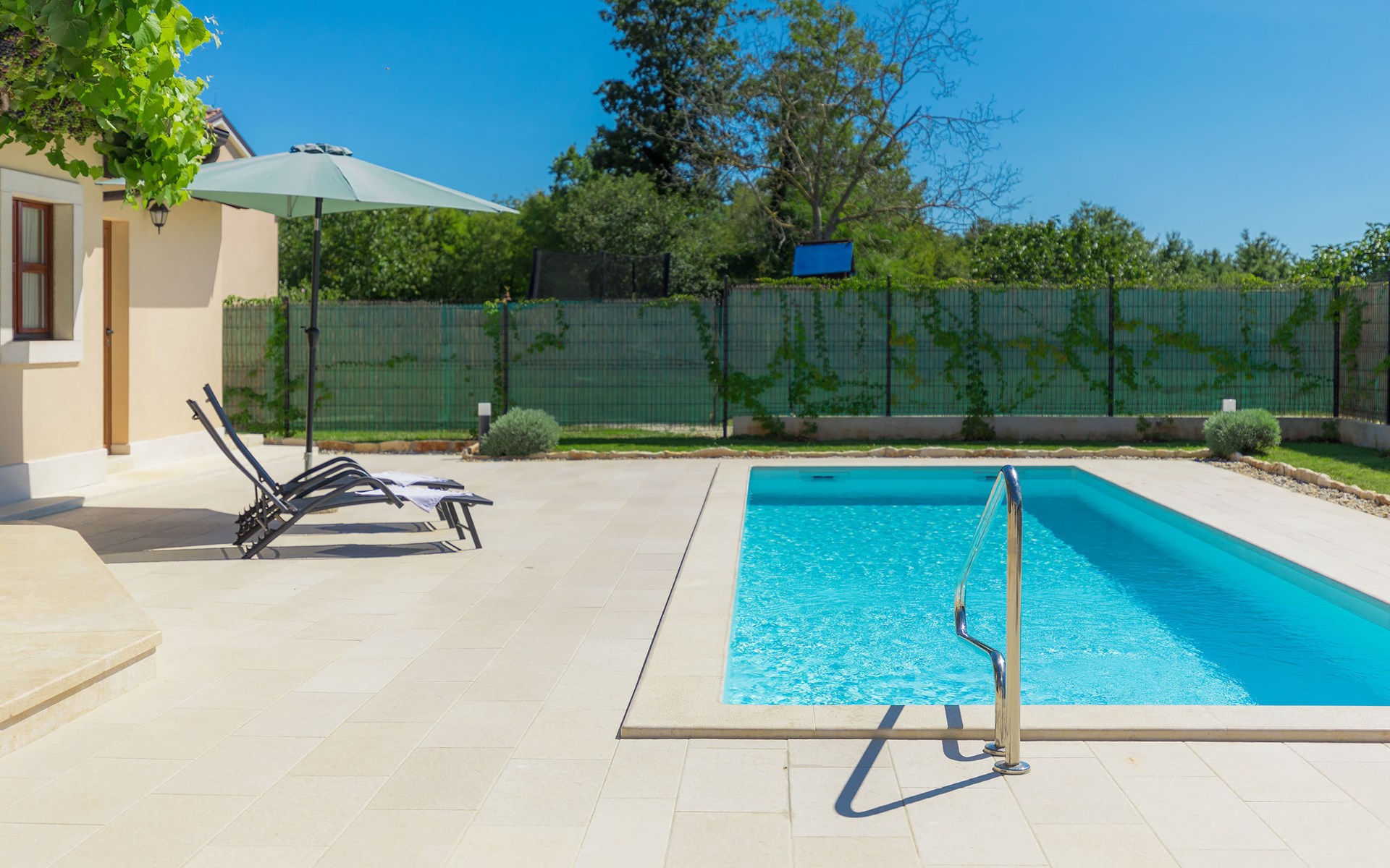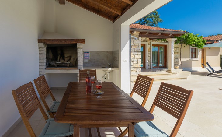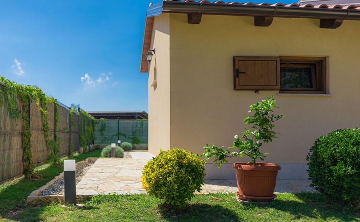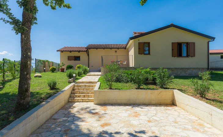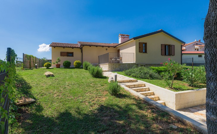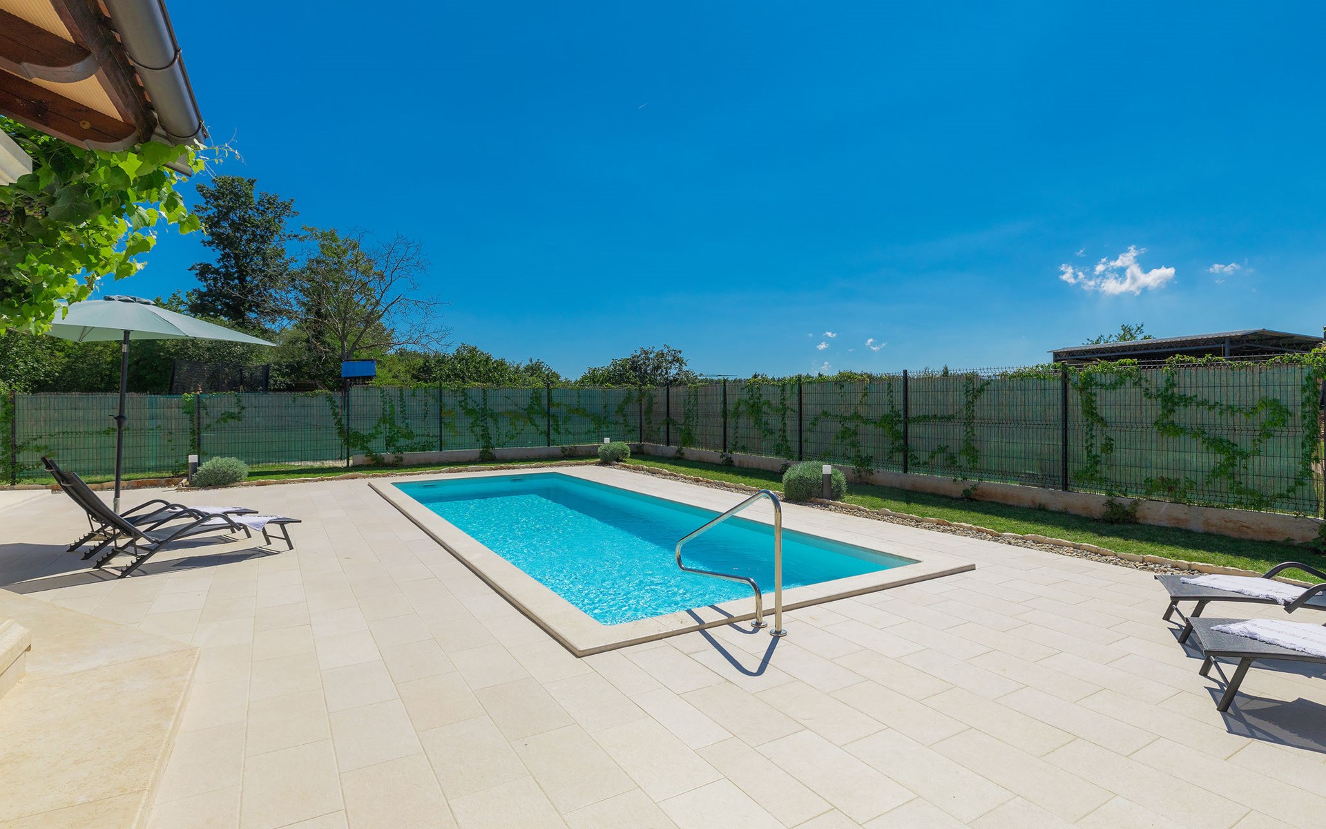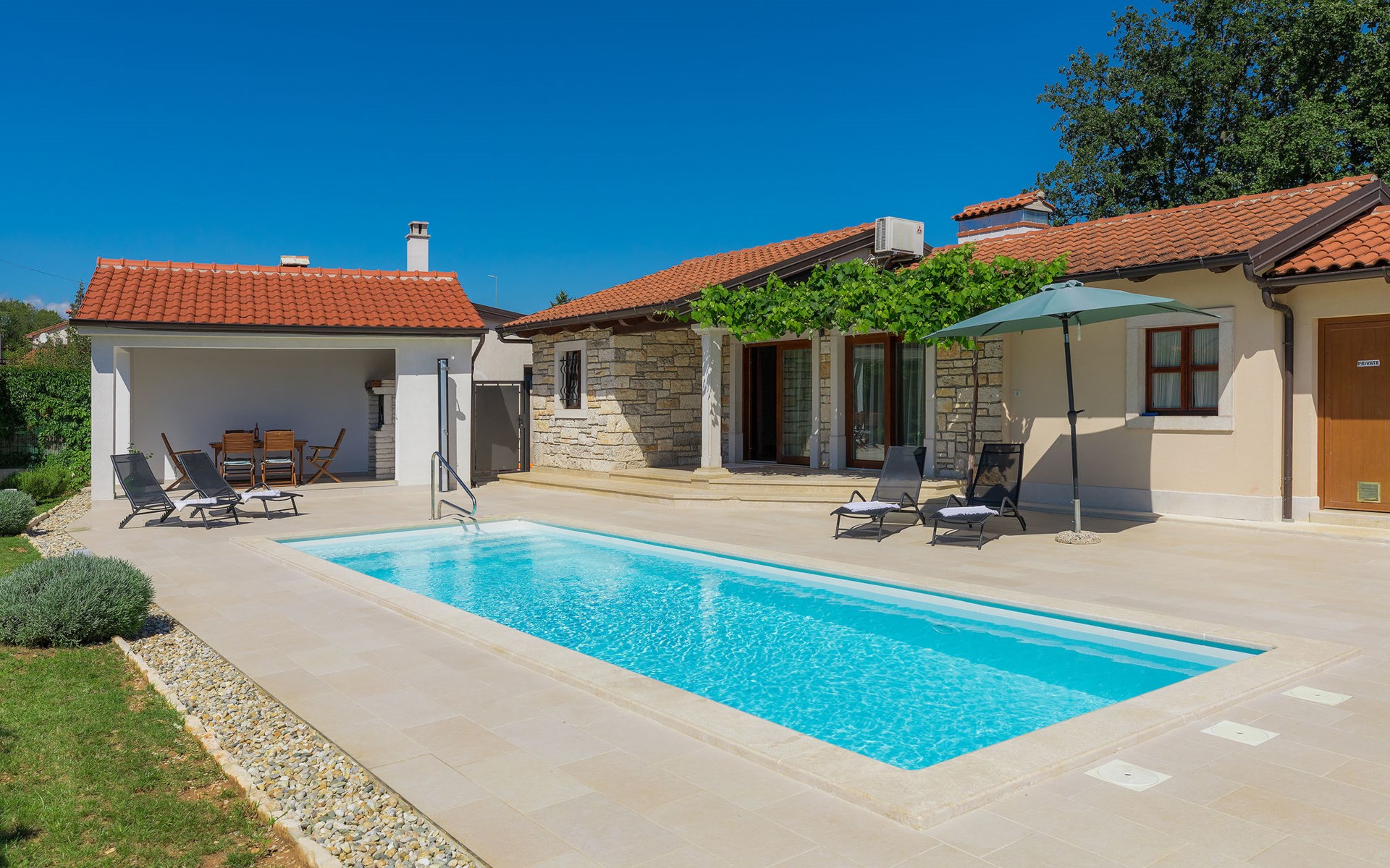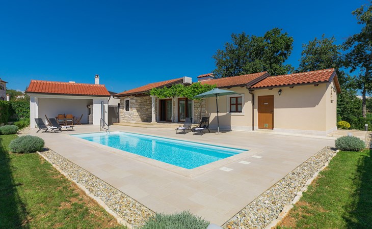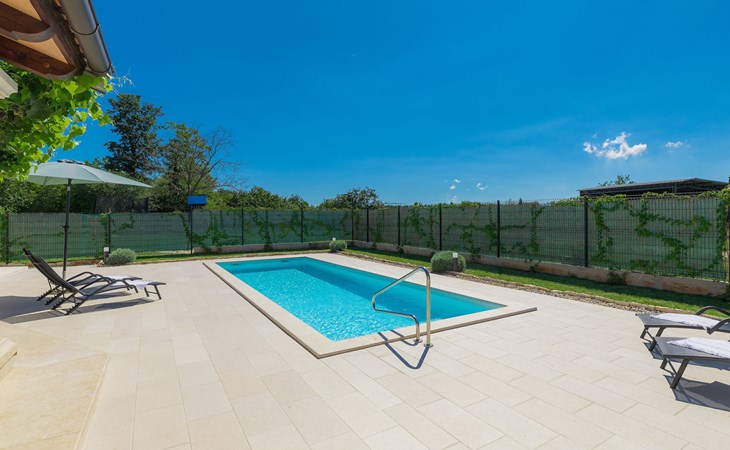 Sveti Petar u Šumi 28 km von Rovinj: Einfamilienhaus "Florens". 300 m vom Zentrum von Sveti Petar u Šumi, 7 km vom Zentrum von Žminj, 28 km vom Meer. Zur Alleinbenutzung: Grundstück 400 m2 (eingezäunt), Rasen und Bäumen, Schwimmbad eckig (9 x 3 m, saisonale Verfügbarkeit: 01.Mai. - 01.Okt.) mit Innentreppe. Aussendusche, Terrasse, Gartenmöbel, Grill. Im Hause: Internetzugang, Waschmaschine. Parkplatz (für 2 Autos) auf dem Grundstück. Einkaufsgeschäft 500 m, Supermarkt 7 km, Bushaltestelle 6.6 km, Kieselstrand 28 km, Felsstrand 28 km.