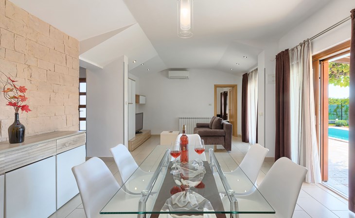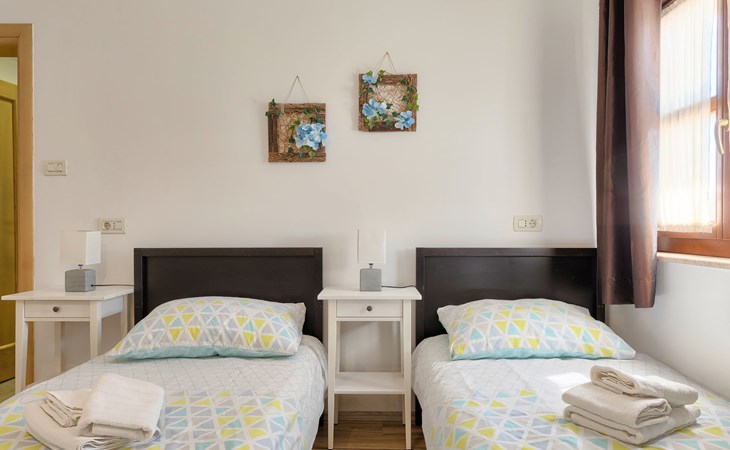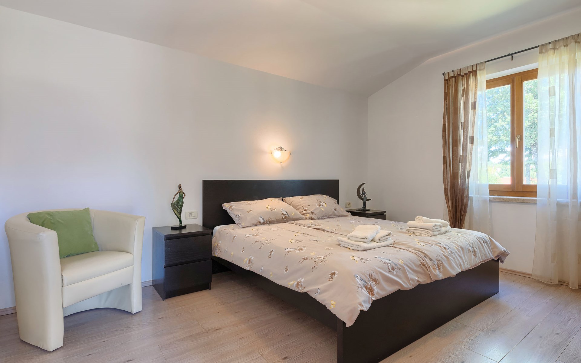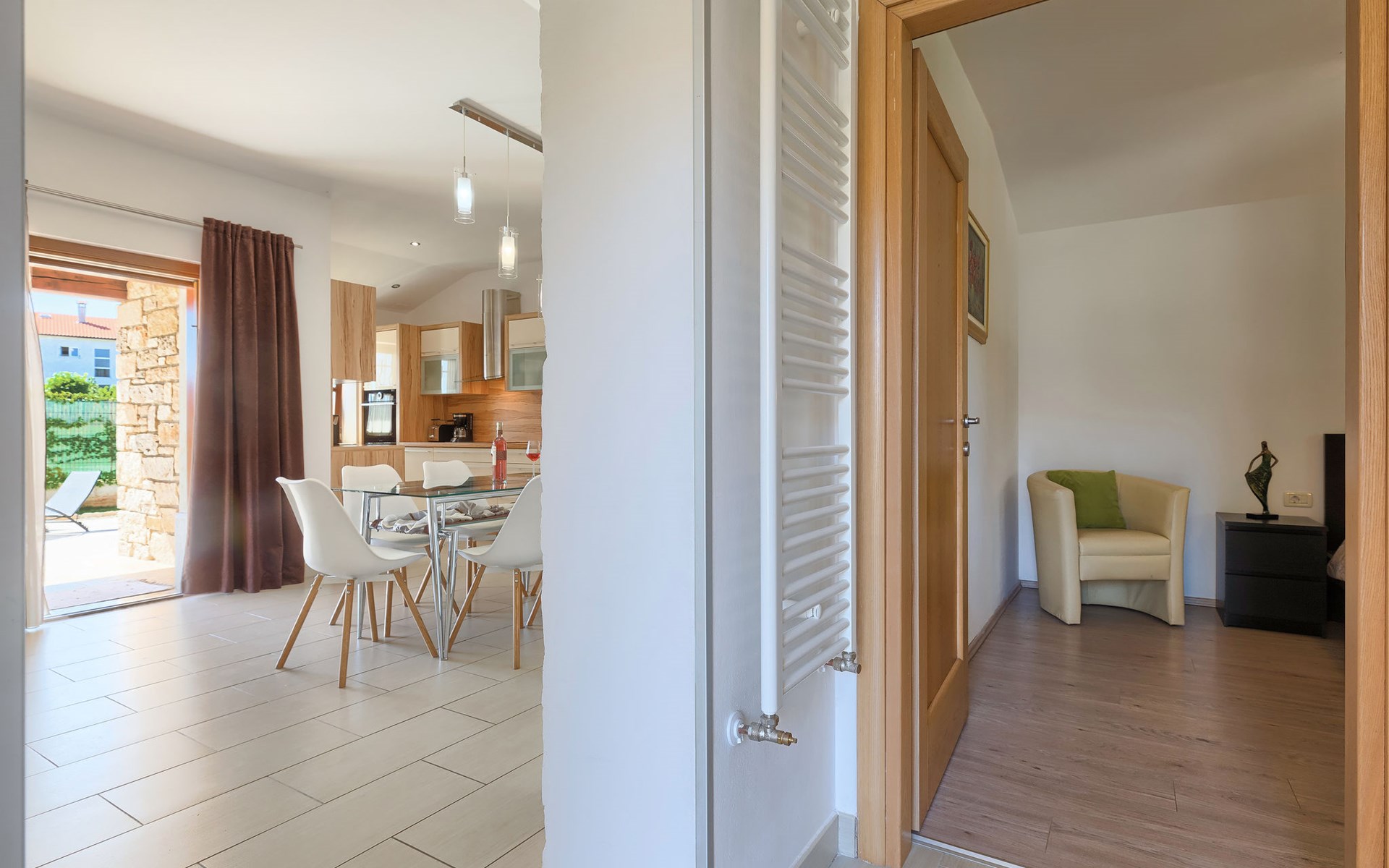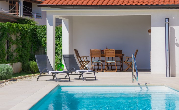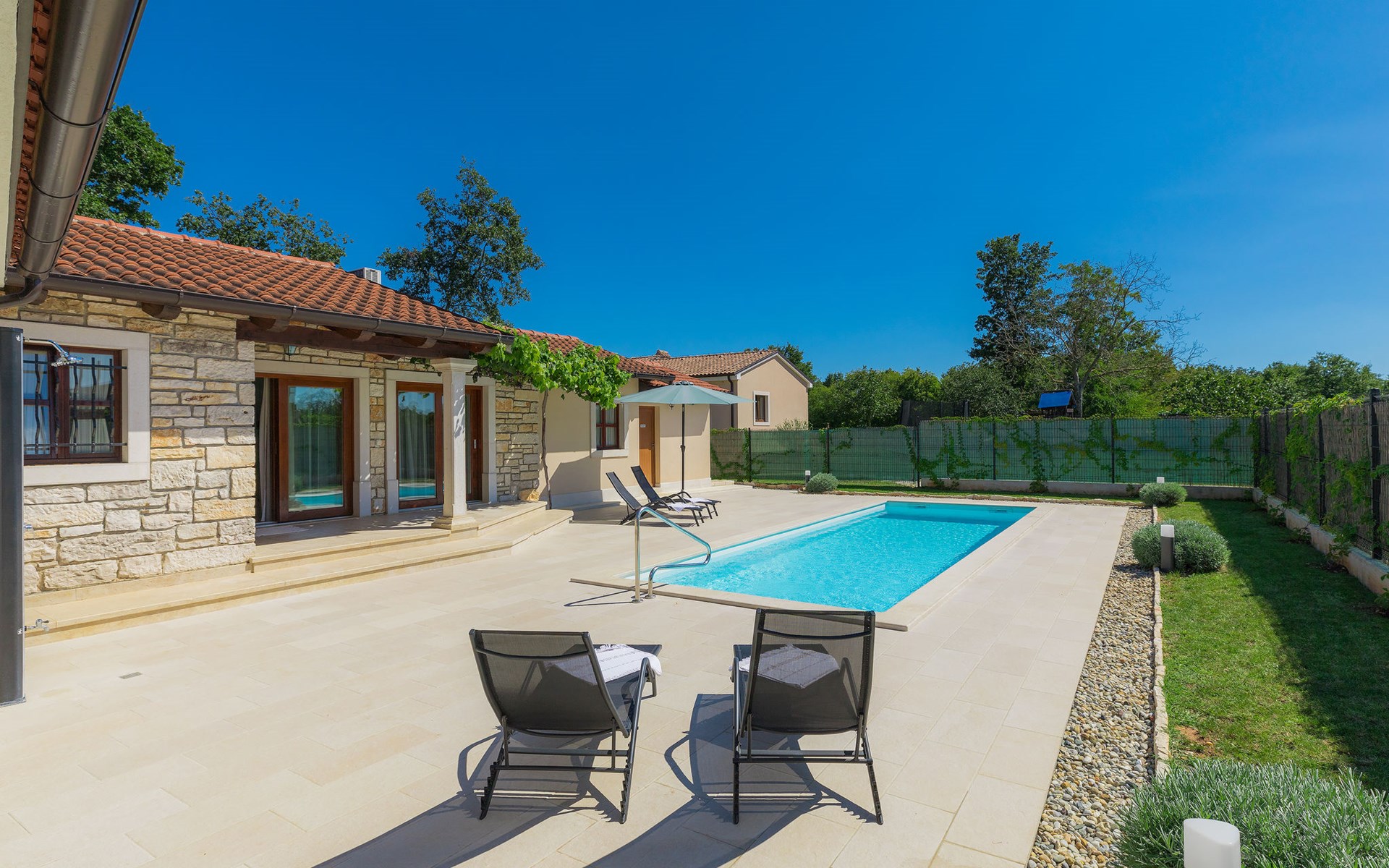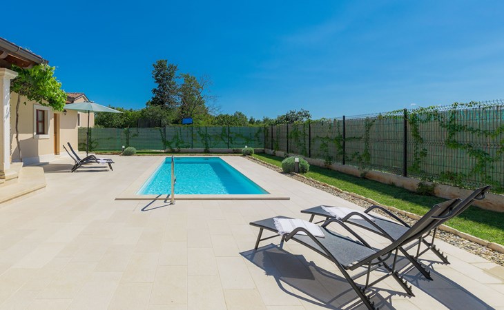 Sveti Petar u Šumi 28 km von Rovinj: Einfamilienhaus "Florens". 300 m vom Zentrum von Sveti Petar u Šumi, 7 km vom Zentrum von Žminj, 28 km vom Meer. Zur Alleinbenutzung: Grundstück 400 m2 (eingezäunt), Rasen und Bäumen, Schwimmbad eckig (9 x 3 m, saisonale Verfügbarkeit: 01.Mai. - 01.Okt.) mit Innentreppe. Aussendusche, Terrasse, Gartenmöbel, Grill. Im Hause: Internetzugang, Waschmaschine. Parkplatz (für 2 Autos) auf dem Grundstück. Einkaufsgeschäft 500 m, Supermarkt 7 km, Bushaltestelle 6.6 km, Kieselstrand 28 km, Felsstrand 28 km.
