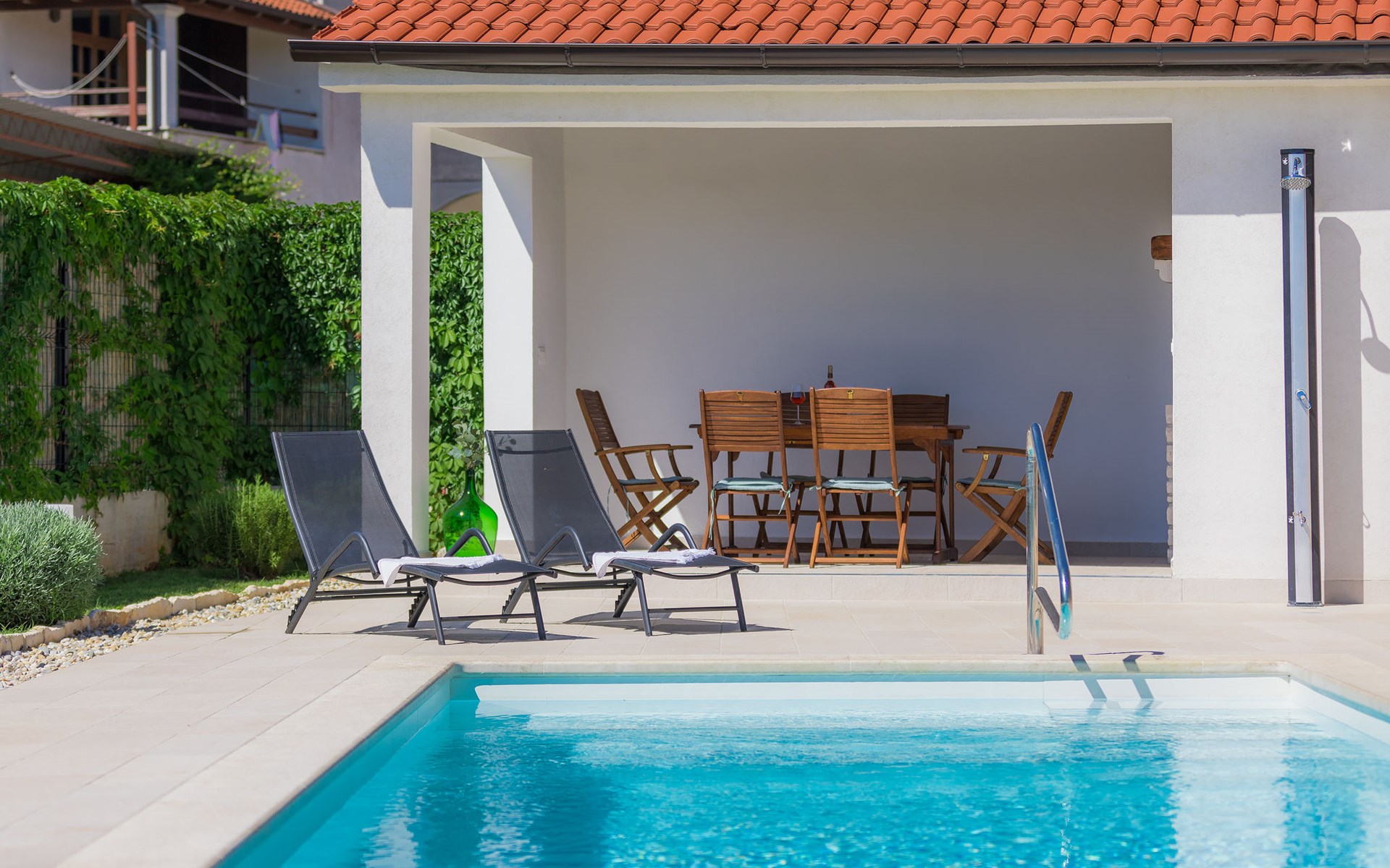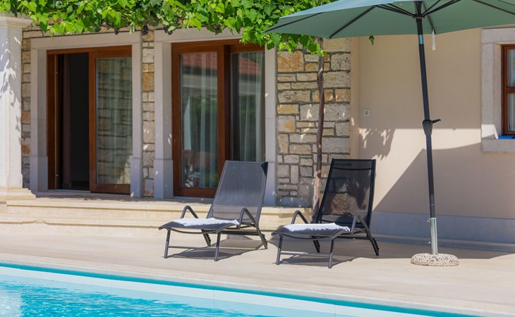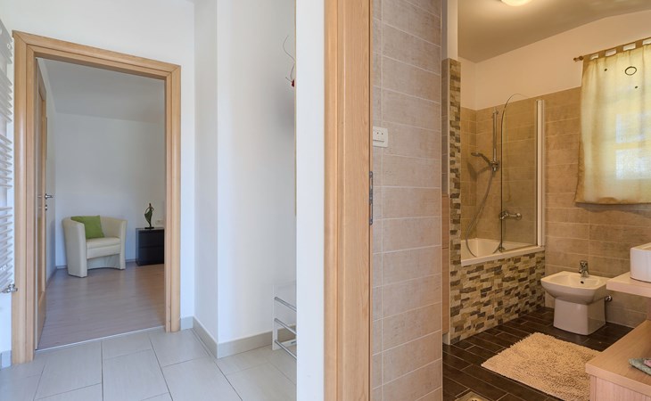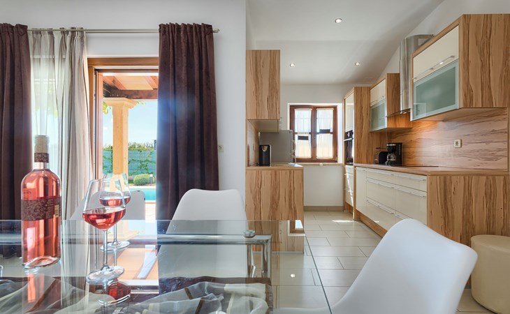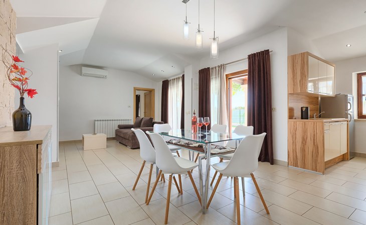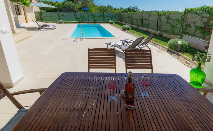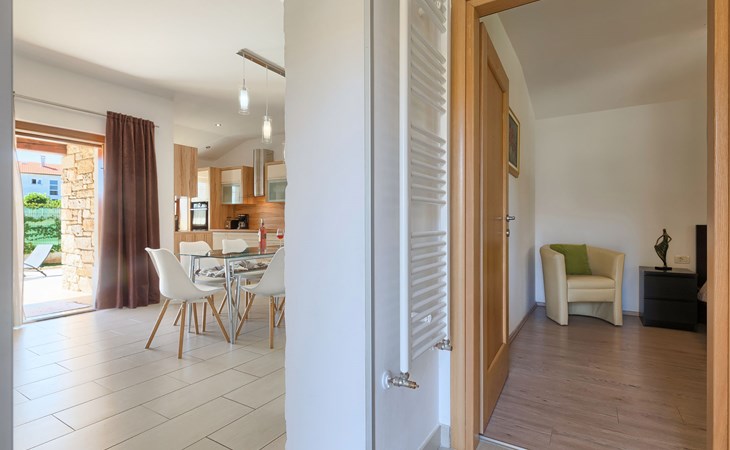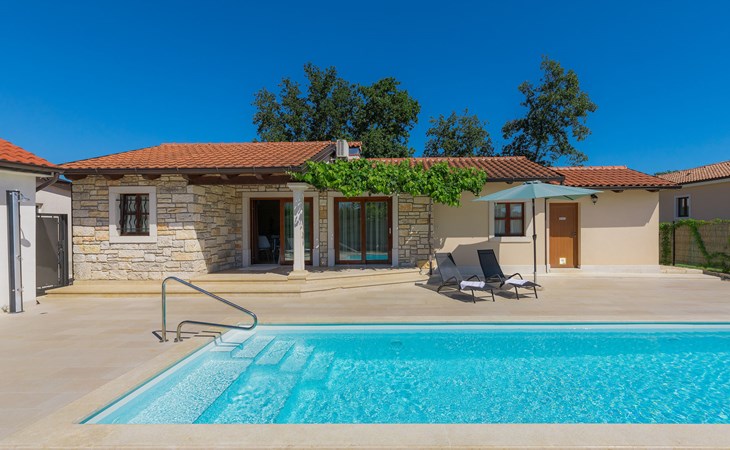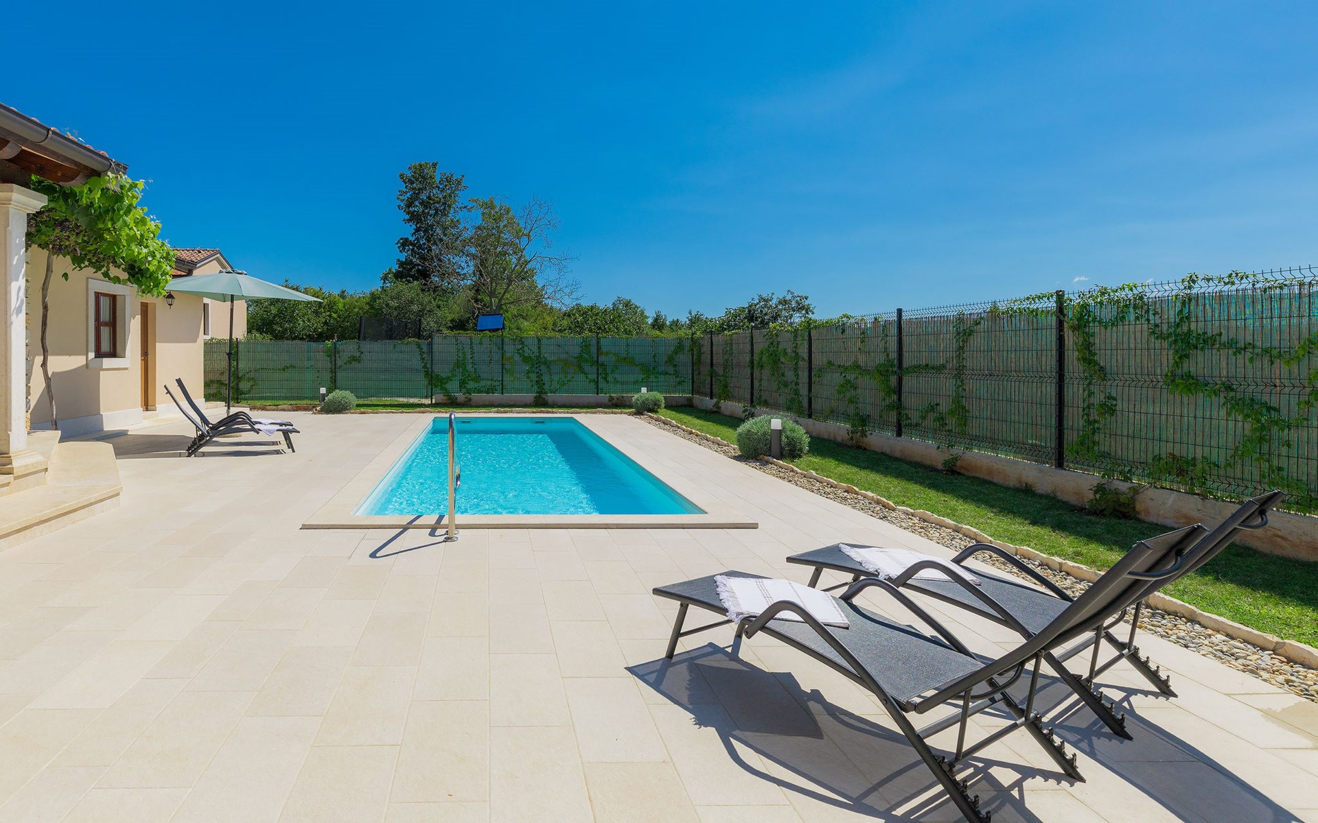 Sveti Petar u Šumi 28 km von Rovinj: Einfamilienhaus "Florens". 300 m vom Zentrum von Sveti Petar u Šumi, 7 km vom Zentrum von Žminj, 28 km vom Meer. Zur Alleinbenutzung: Grundstück 400 m2 (eingezäunt), Rasen und Bäumen, Schwimmbad eckig (9 x 3 m, saisonale Verfügbarkeit: 01.Mai. - 01.Okt.) mit Innentreppe. Aussendusche, Terrasse, Gartenmöbel, Grill. Im Hause: Internetzugang, Waschmaschine. Parkplatz (für 2 Autos) auf dem Grundstück. Einkaufsgeschäft 500 m, Supermarkt 7 km, Bushaltestelle 6.6 km, Kieselstrand 28 km, Felsstrand 28 km.