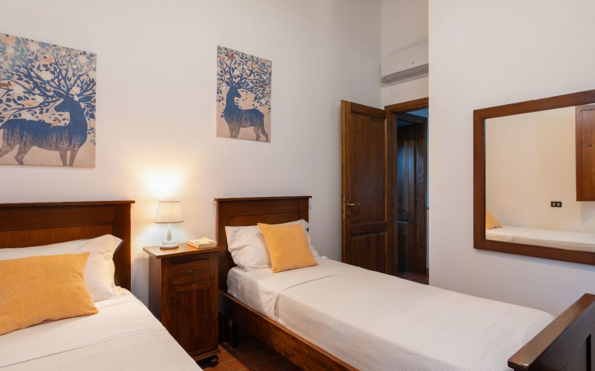 Im Inneren ist die Villa mit allem ausgestattet, was Sie für einen komfortablen und erholsamen Aufenthalt benötigen. Mit zwei Schlafzimmern, eines mit zwei Einzelbetten und eines mit einem Doppelbett, ist sie ideal für bis zu vier Personen. Eine gut ausgestattete Küche mit 3-Flammen-Herd, Geschirrspüler, Kaffeemaschine, Wasserkocher und Minibackofen, ein gemütliches Wohnzimmer mit Kamin für kuschelige Abende und ein Bad mit Dusche im ersten Stock runden die Ausstattung ab. Außerdem steht Ihnen eine Waschmaschine zur alleinigen Nutzung zur Verfügung.