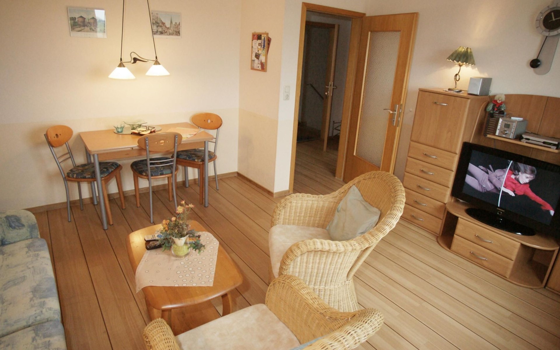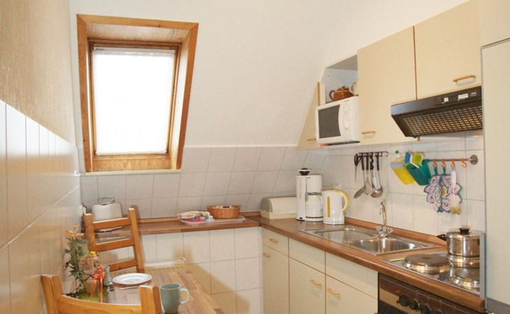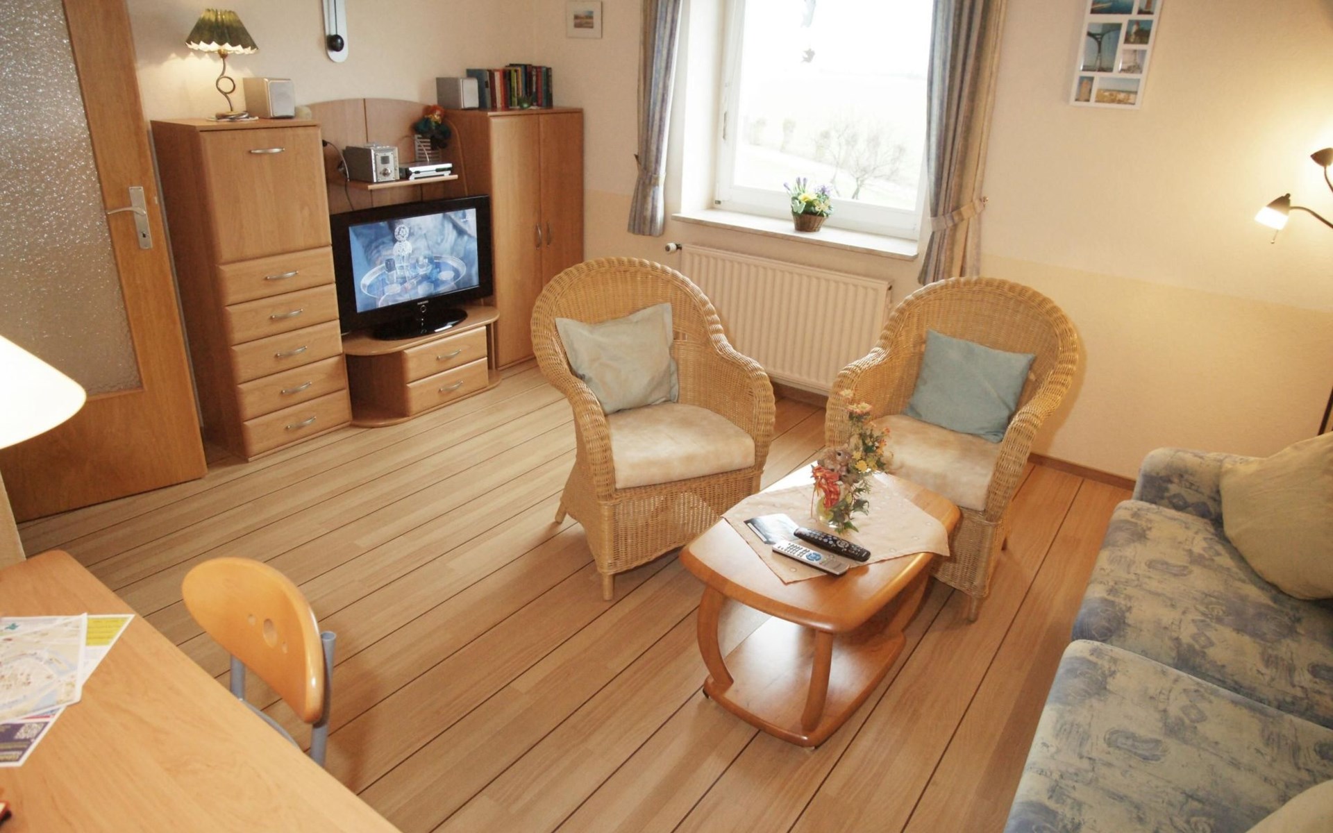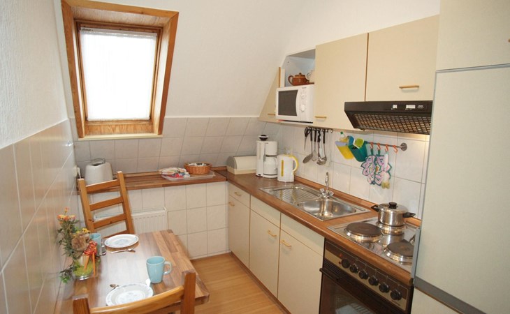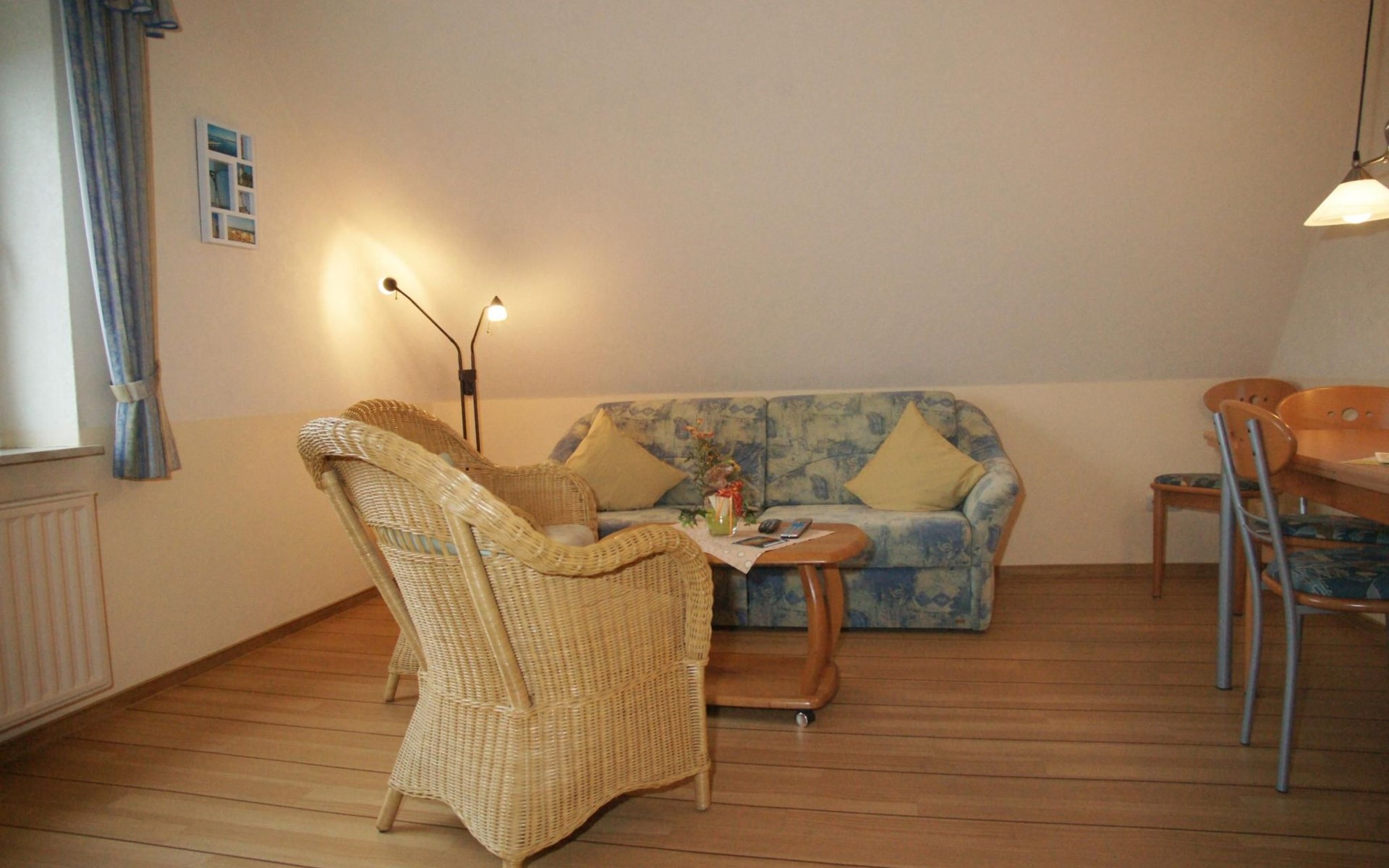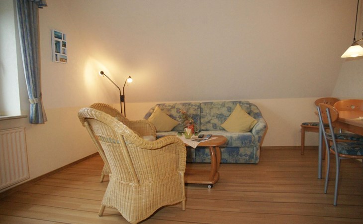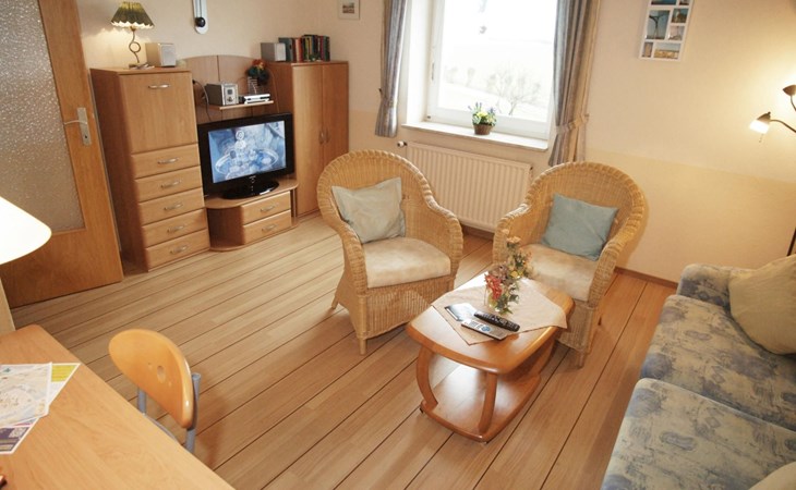 Sie besteht aus einem Schlafzimmer, einem Wohnzimmer mit mehreren Schlafmöglichkeiten, einem Duschbad und einer Küche. Diese Wohnung ist im Winter 2012 renoviert und modernisiert worden. Das Schlafzimmer ist ausgestattet mit einem Doppelbett und verstellbarem Lattenrost. Im Wohnzimmer ist genügend Platz für gemütliche Stunden vor dem Fernseher, mit einer Couch und zwei Sessel. Die Küche ist separat. Das Bad ist mit einer Dusche ausgestattet und Fön sowie Schminkspiegel sind vorhanden. Kein Teppichboden.
