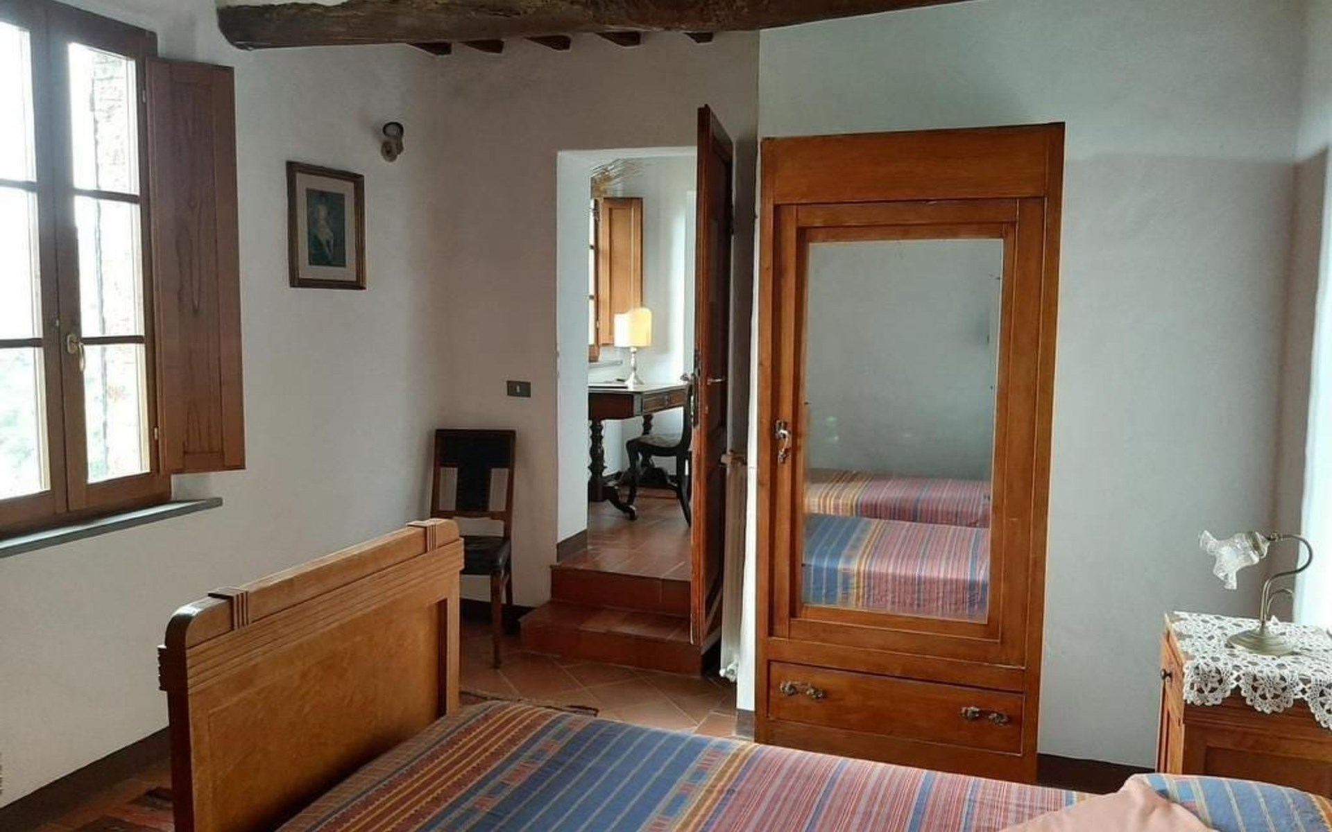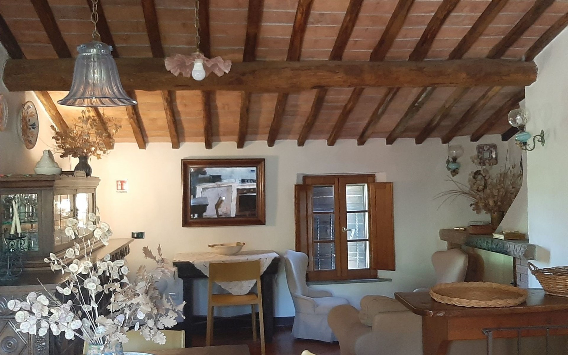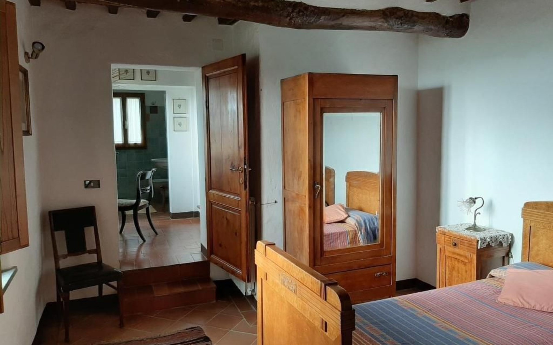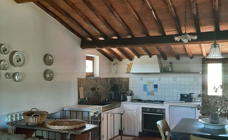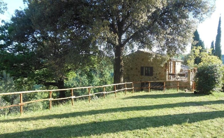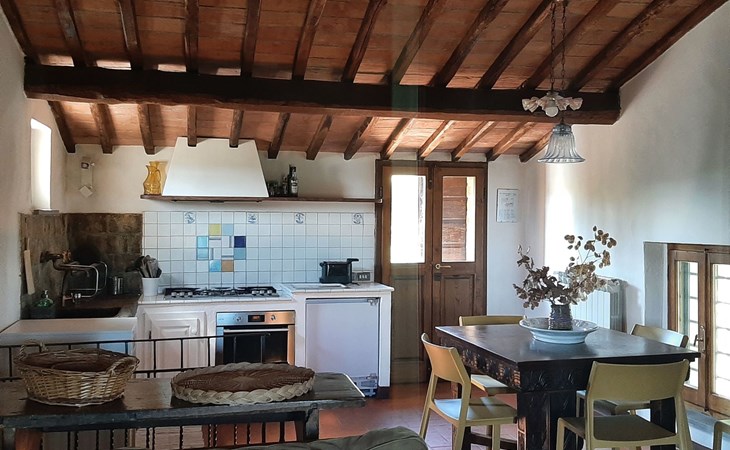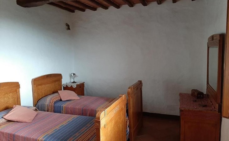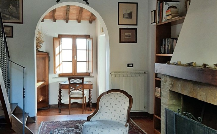 Eingebettet in die hügelige Landschaft, mit einem schönen Blick auf die Skyline von Montepulciano, ist das Haus auf zwei Ebenen. Im Erdgeschoss bildet ein Wohnzimmer mit Kamin das Zentrum des Hauses. Von hier aus haben Sie Zugang zu den drei Schlafzimmern: eines mit einem Doppelbett, ein weiteres mit zwei Einzelbetten und das dritte mit zwei Einzelbetten und angrenzender Dusche. Die Einzelbetten können zusammengeschoben werden. Über eine Holztreppe gelangt man in das Zwischengeschoss, wo sich eine große Küche/Esszimmer mit einem Kamin für Grillabende befindet. Von hier aus gelangt man auf eine Terrasse mit einem Eisentisch und Stühlen. Eine weitere Terrasse, ebenfalls mit Eisentisch und -stühlen, die von zwei alten Eichen beschattet wird, bietet einen Blick auf das Tal. Das Haus, das mit Möbeln aus der Zeit der Familie eingerichtet ist, ist komplett für 6 Personen ausgestattet. Trinkwasser aus der öffentlichen Versorgung, warmes Wasser, Zentralheizung, Kinderbett und Hochstuhl. Grillen in der Küche möglich, Moskitonetze an allen Fenstern. Stereoanlage und Bücher. WI-FI.