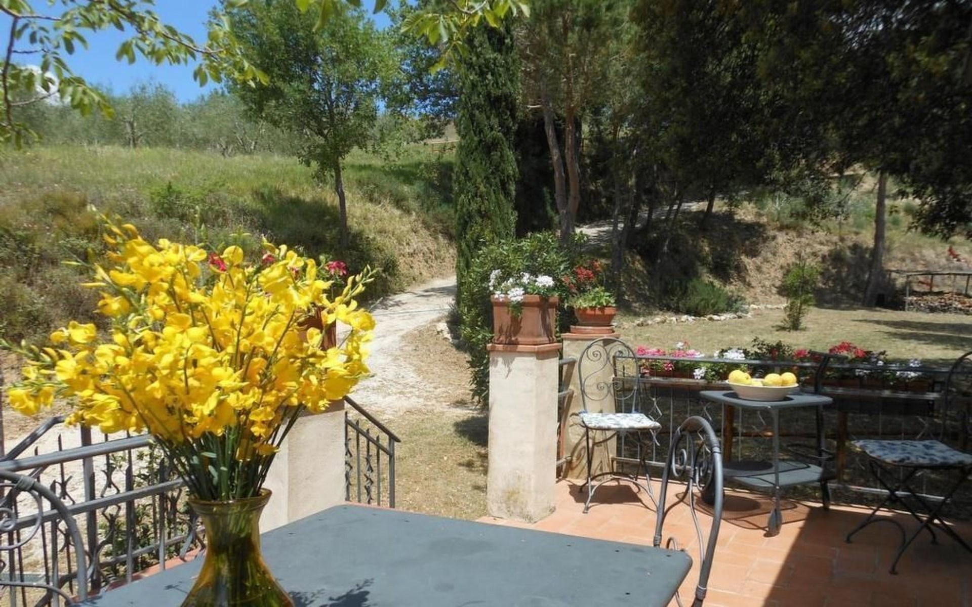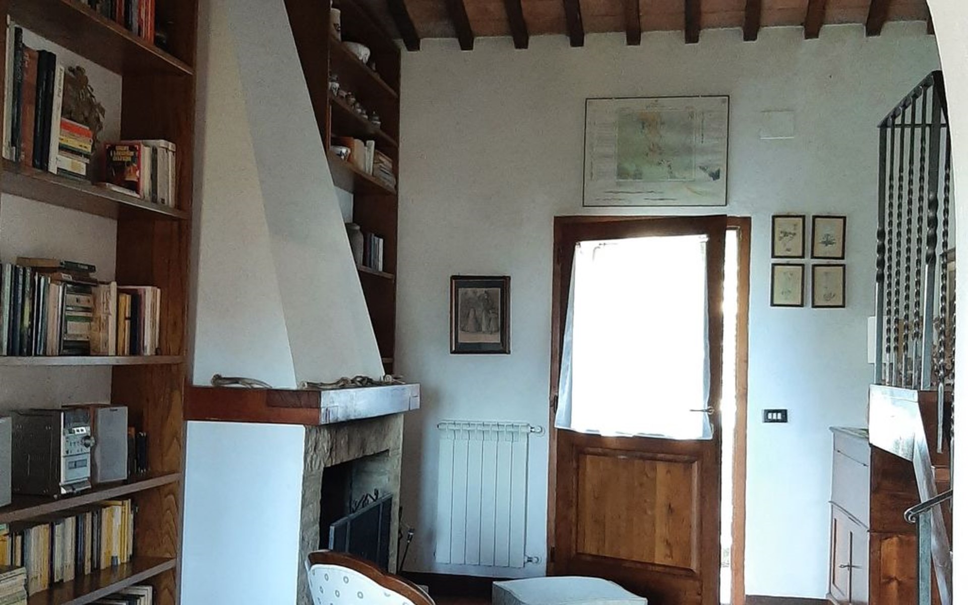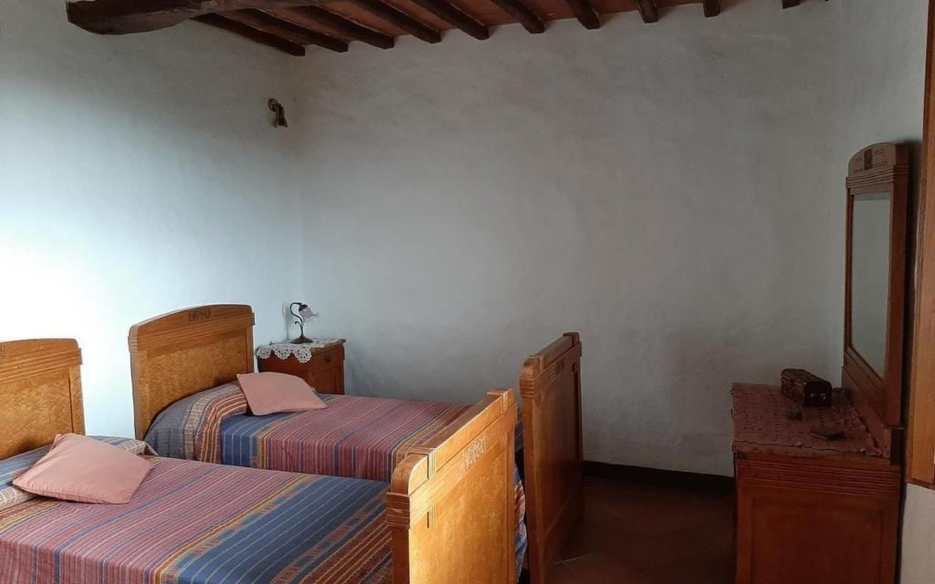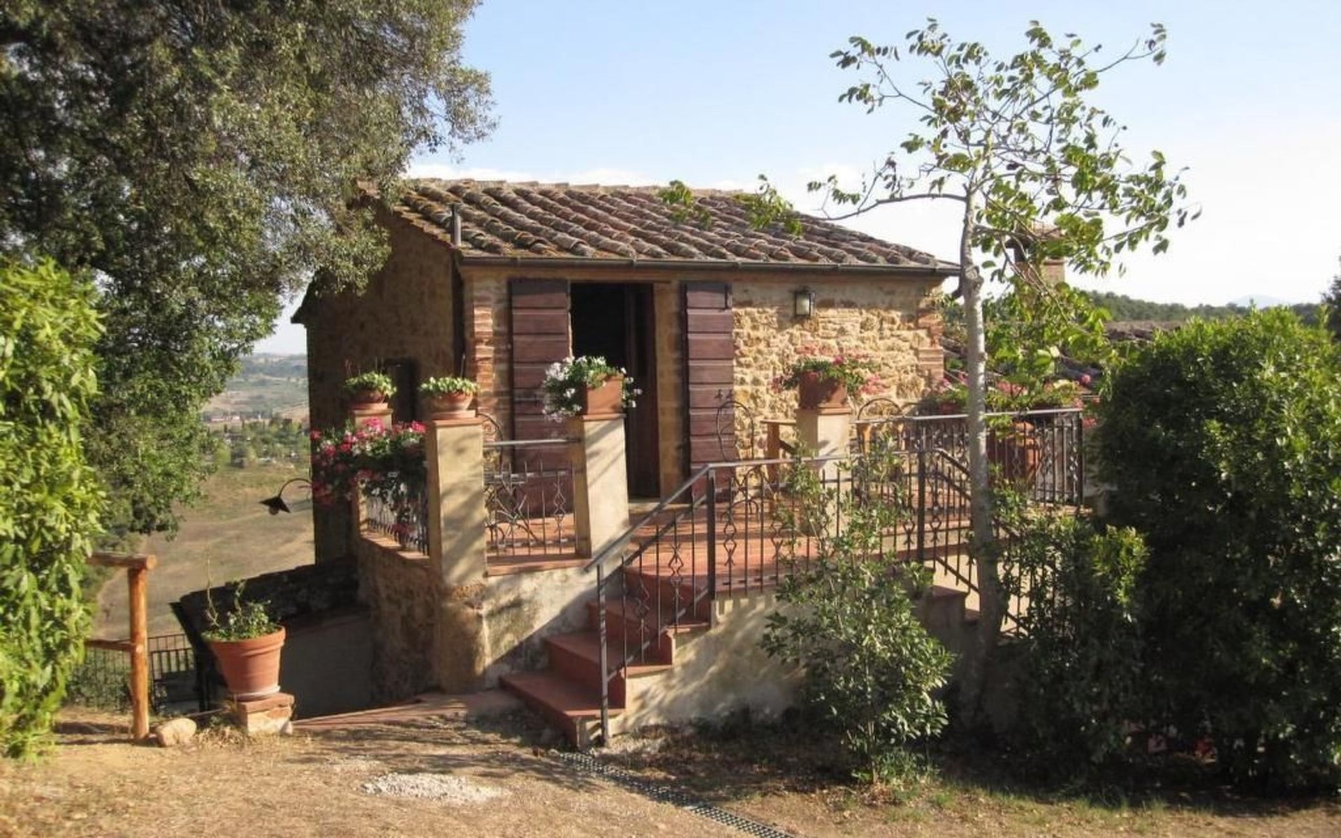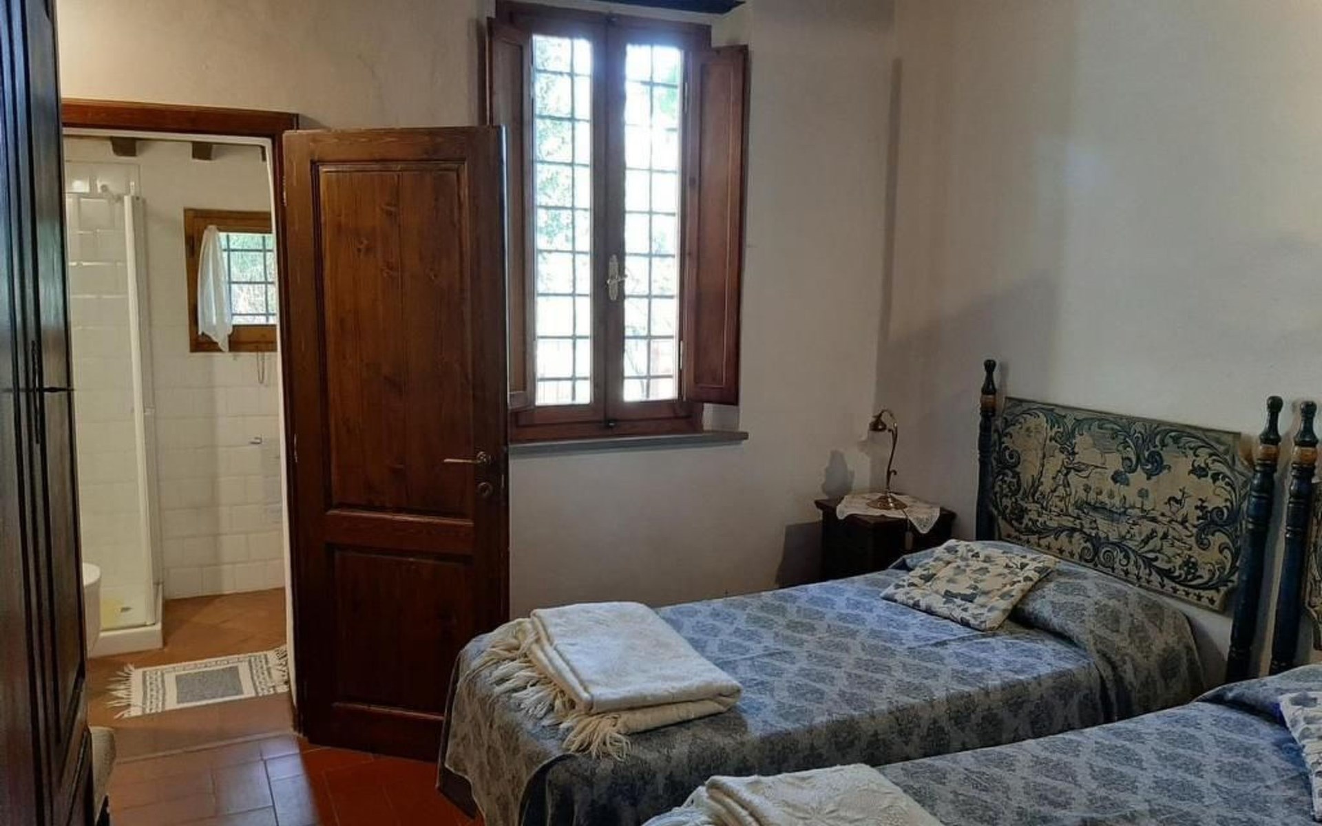 Eingebettet in die hügelige Landschaft, mit einem schönen Blick auf die Skyline von Montepulciano, ist das Haus auf zwei Ebenen. Im Erdgeschoss bildet ein Wohnzimmer mit Kamin das Zentrum des Hauses. Von hier aus haben Sie Zugang zu den drei Schlafzimmern: eines mit einem Doppelbett, ein weiteres mit zwei Einzelbetten und das dritte mit zwei Einzelbetten und angrenzender Dusche. Die Einzelbetten können zusammengeschoben werden. Über eine Holztreppe gelangt man in das Zwischengeschoss, wo sich eine große Küche/Esszimmer mit einem Kamin für Grillabende befindet. Von hier aus gelangt man auf eine Terrasse mit einem Eisentisch und Stühlen. Eine weitere Terrasse, ebenfalls mit Eisentisch und -stühlen, die von zwei alten Eichen beschattet wird, bietet einen Blick auf das Tal. Das Haus, das mit Möbeln aus der Zeit der Familie eingerichtet ist, ist komplett für 6 Personen ausgestattet. Trinkwasser aus der öffentlichen Versorgung, warmes Wasser, Zentralheizung, Kinderbett und Hochstuhl. Grillen in der Küche möglich, Moskitonetze an allen Fenstern. Stereoanlage und Bücher. WI-FI.