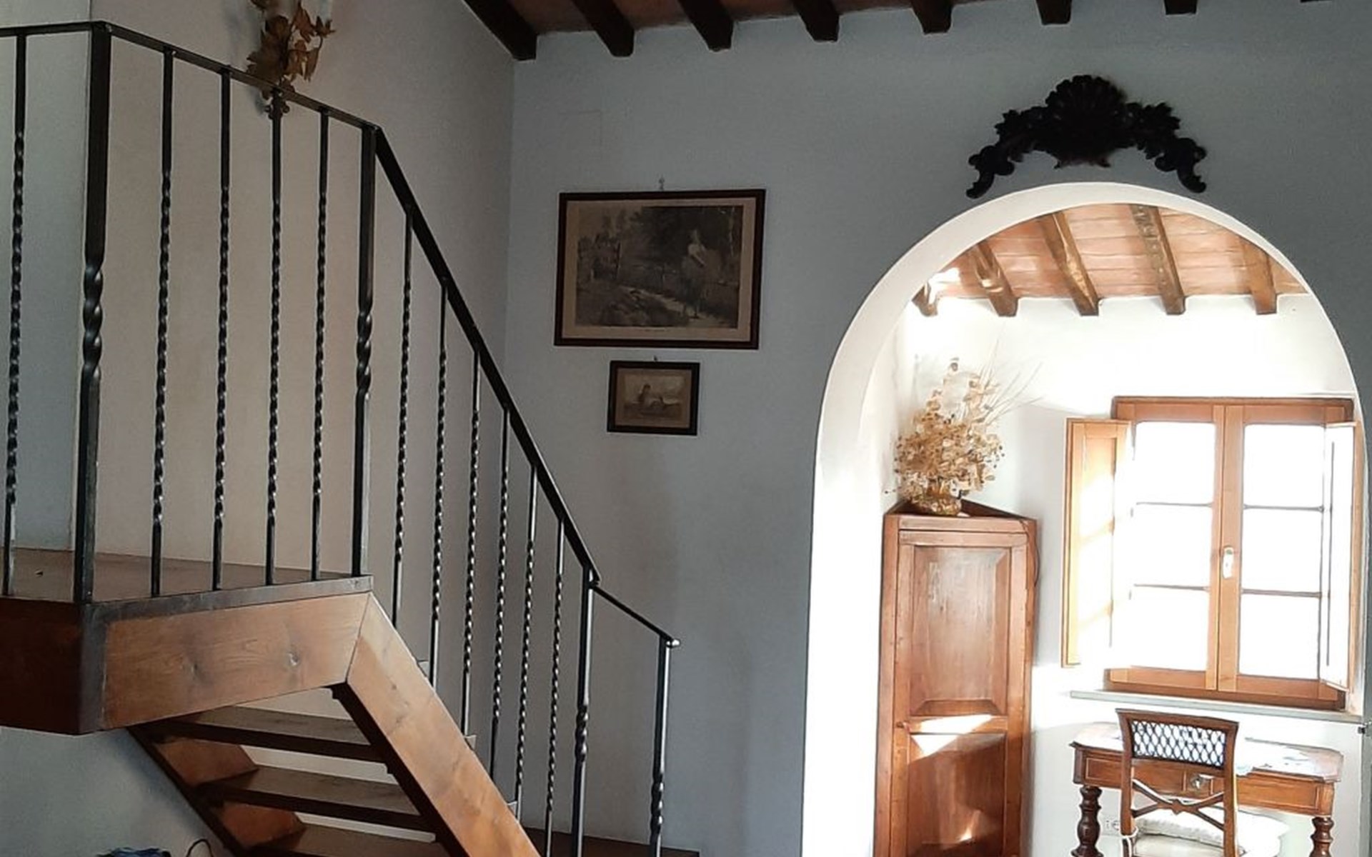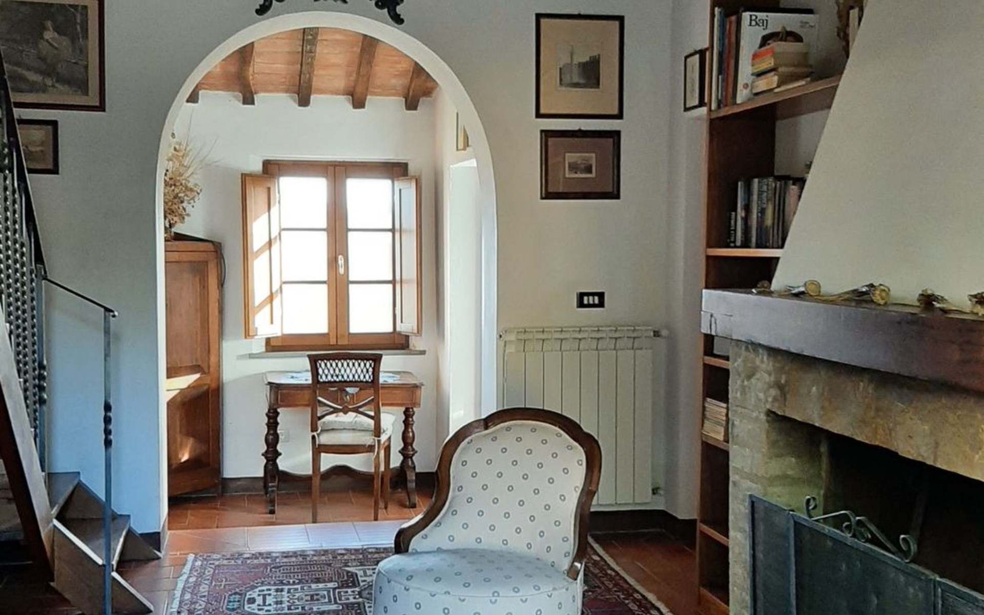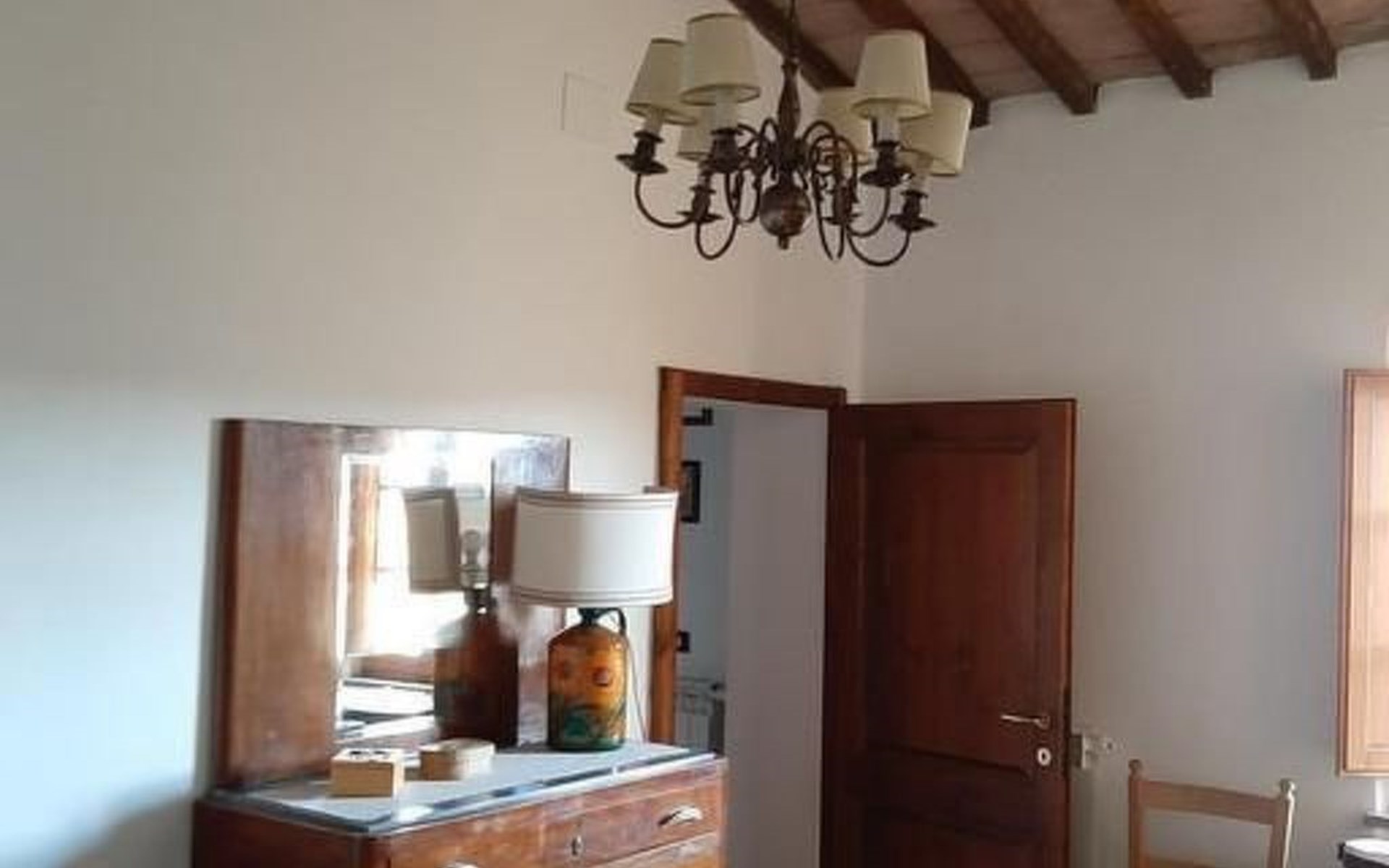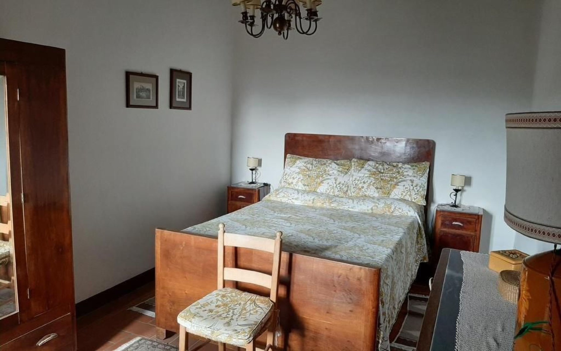 Eingebettet in die hügelige Landschaft, mit einem schönen Blick auf die Skyline von Montepulciano, ist das Haus auf zwei Ebenen. Im Erdgeschoss bildet ein Wohnzimmer mit Kamin das Zentrum des Hauses. Von hier aus haben Sie Zugang zu den drei Schlafzimmern: eines mit einem Doppelbett, ein weiteres mit zwei Einzelbetten und das dritte mit zwei Einzelbetten und angrenzender Dusche. Die Einzelbetten können zusammengeschoben werden. Über eine Holztreppe gelangt man in das Zwischengeschoss, wo sich eine große Küche/Esszimmer mit einem Kamin für Grillabende befindet. Von hier aus gelangt man auf eine Terrasse mit einem Eisentisch und Stühlen. Eine weitere Terrasse, ebenfalls mit Eisentisch und -stühlen, die von zwei alten Eichen beschattet wird, bietet einen Blick auf das Tal. Das Haus, das mit Möbeln aus der Zeit der Familie eingerichtet ist, ist komplett für 6 Personen ausgestattet. Trinkwasser aus der öffentlichen Versorgung, warmes Wasser, Zentralheizung, Kinderbett und Hochstuhl. Grillen in der Küche möglich, Moskitonetze an allen Fenstern. Stereoanlage und Bücher. WI-FI.