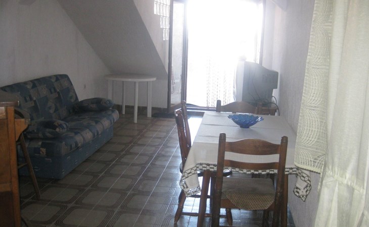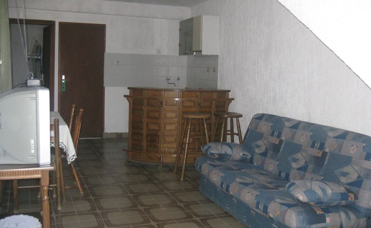 Das Innere der 40 m² großen Wohnung ist durchdacht eingerichtet, um einen komfortablen Aufenthalt zu gewährleisten. Das Schlafzimmer ist mit einem gemütlichen Doppelbett ausgestattet, das für erholsame Nächte nach einem Tag voller Entdeckungen oder Entspannung am Meer sorgt. Für zusätzliche Gäste bietet das Wohnzimmer ein Schlafsofa, das Funktionalität und Komfort nahtlos miteinander verbindet. Die kombinierte Wohnküche ist mit einem Fernseher und einem Esstisch mit Stühlen ausgestattet und schafft ein gemütliches Ambiente. Die Küche ist komplett ausgestattet und verfügt über einen Gasherd und eine praktische Theke mit Barhockern, ideal für zwanglose Mahlzeiten oder den Morgenkaffee. Ein Badezimmer mit Dusche rundet die Ausstattung ab und bietet alles, was man für einen problemlosen Aufenthalt braucht.