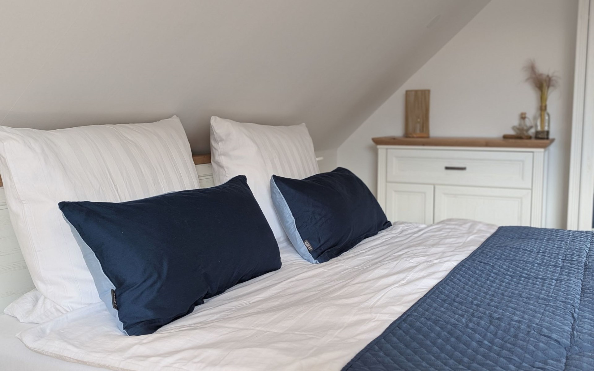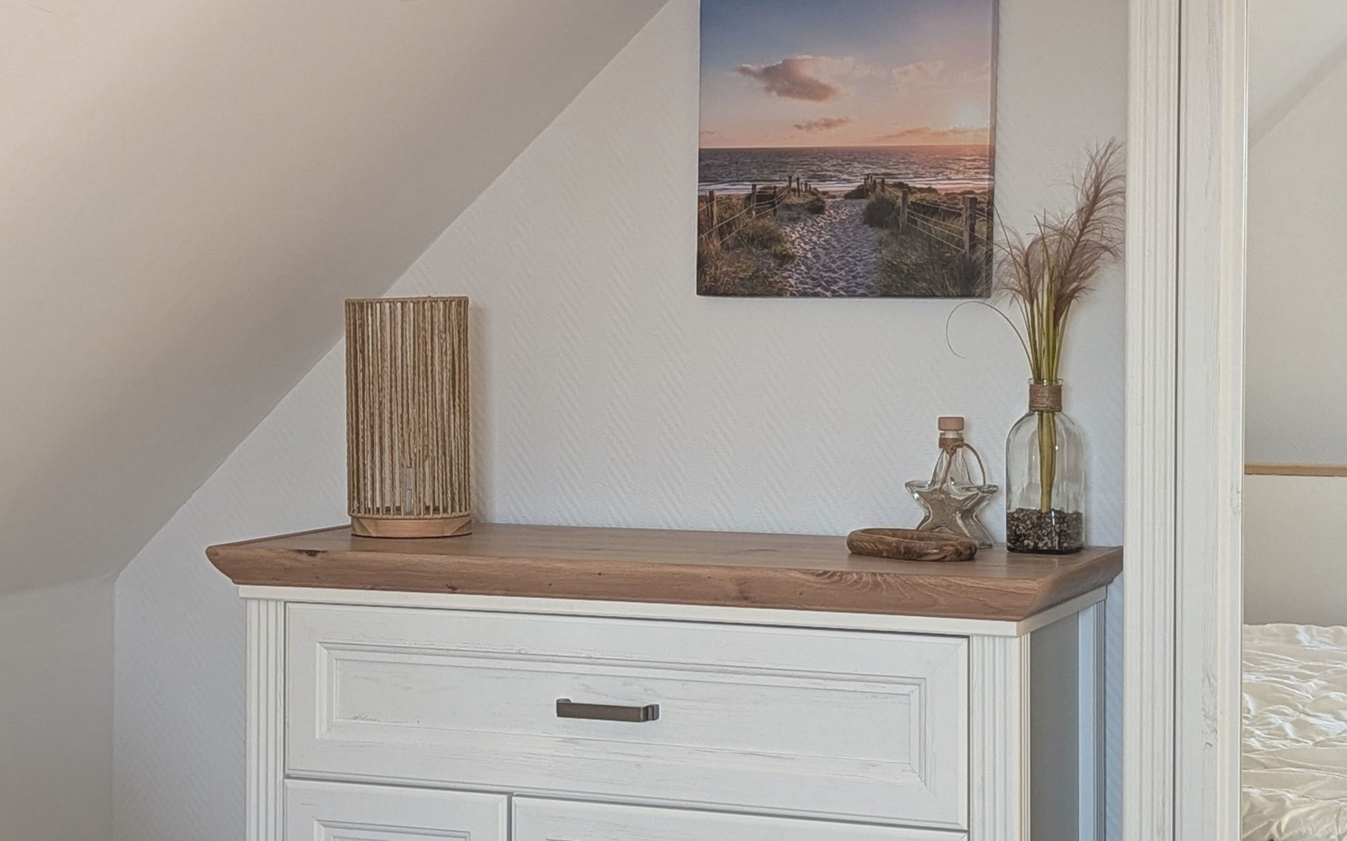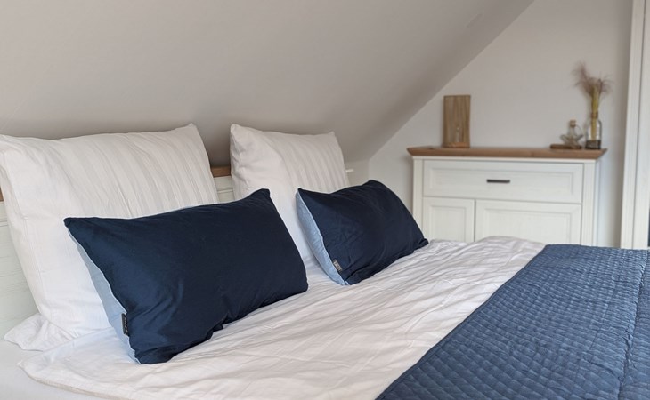 Im Obergeschoß bietet das Schlafzimmer mit einem Doppelbett (180 x 200) inklusive zwei Komfortmatratzen und einem zusätzlichen Schlafsessel Schlafmöglichkeiten für 3 Personen. In der Lese Ecke können Sie einen Krimi aus Ostfriesland lesen und die Seele baumeln lassen. Neben dem Schafzimmer befindet sich das 2. Badezimmer mit WC und einer Badewanne inklusive Duschabtrennung.