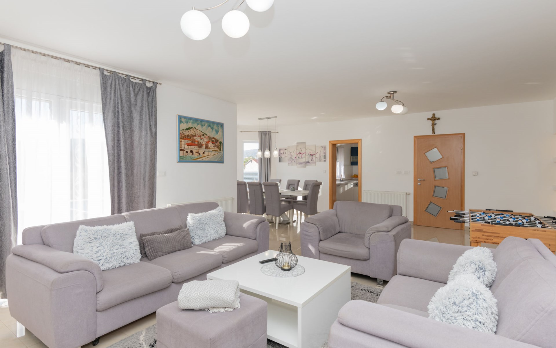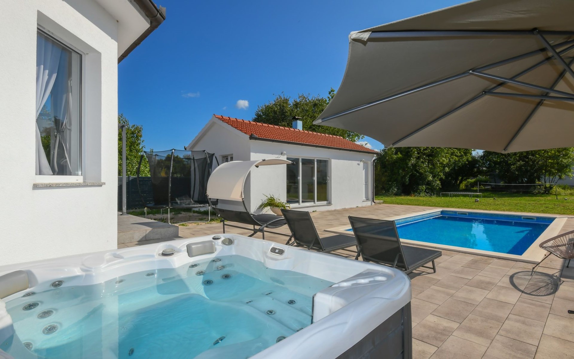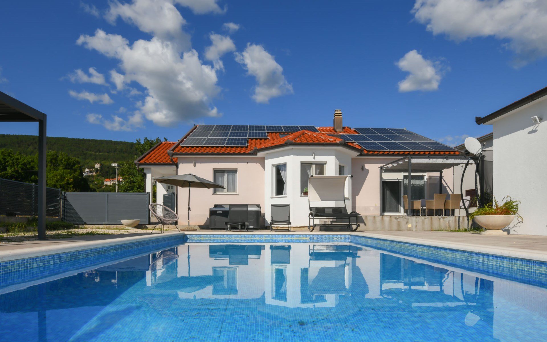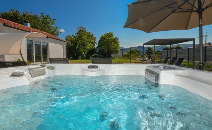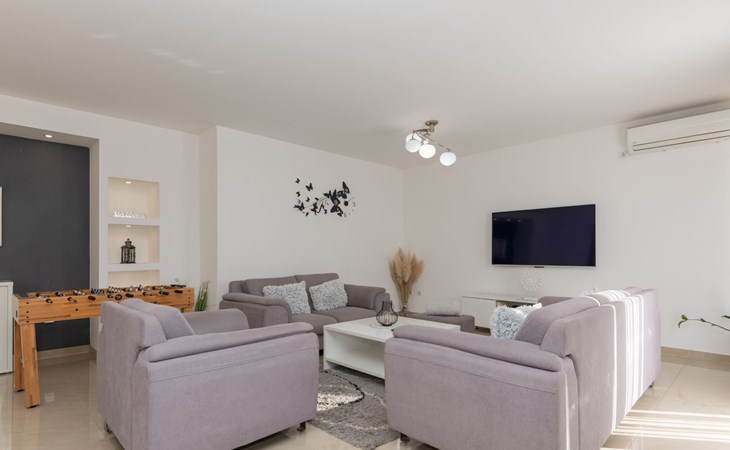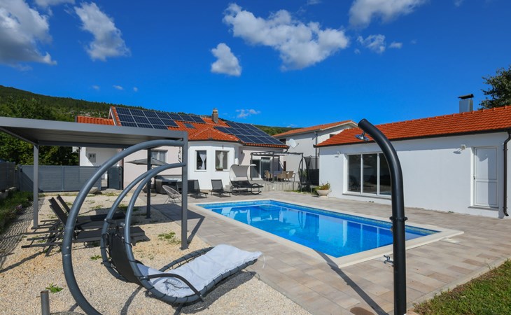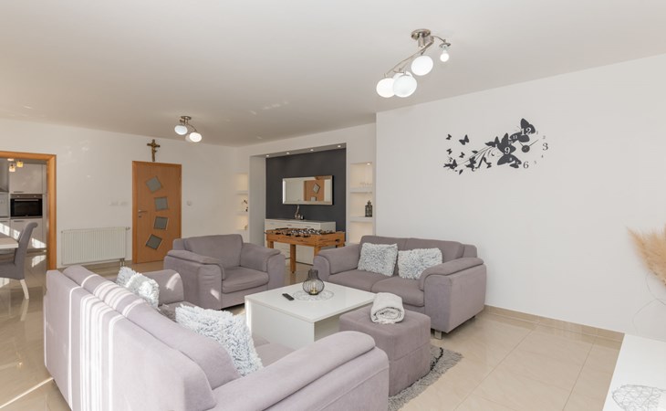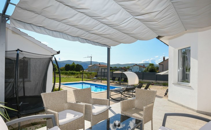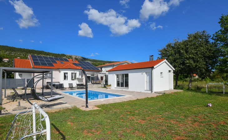 Donji Proložac 6 km von Imotski: Einfamilienhaus "Ana". 38 km vom Meer, 5 km vom See. Zur Alleinbenutzung: Grundstück 1'200 m2, Schwimmbad eckig, beheizt (8 x 4 m, 150 cm tief, saisonale Verfügbarkeit: 01.Mai. - 01.Okt.) mit Innentreppe. WC im Poolbereich, Aussendusche, Sprudelbad, Tischtennis, Terrasse (250 m2), Gartenmöbel, Grillhaus, Kinderspielplatz. Im Hause: Internetzugang, Tischfussball, Trampolin, Waschmaschine. Parkplatz (für 4 Autos) beim Haus auf dem Grundstück. Einkaufsgeschäft 2 km, Restaurant 4 km, Bushaltestelle 5.5 km, Kieselstrand 38 km, Felsstrand 38 km. Bekannte Seen in der Umgebung sind gut erreichbar: Modro jezero 6 m, Crveno jezero 6 m.