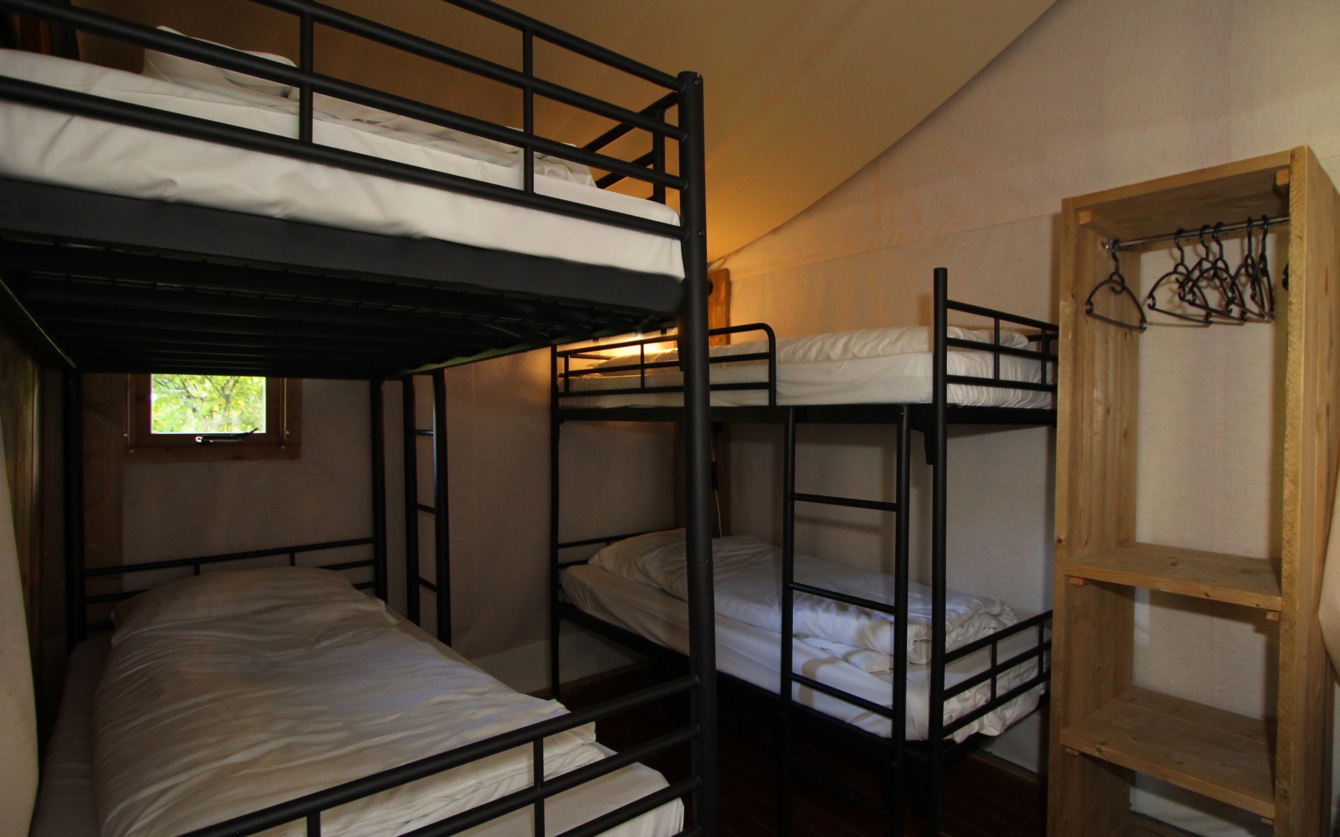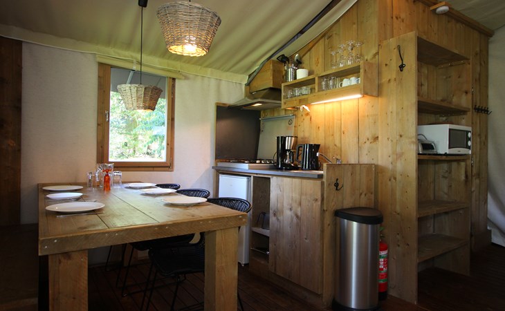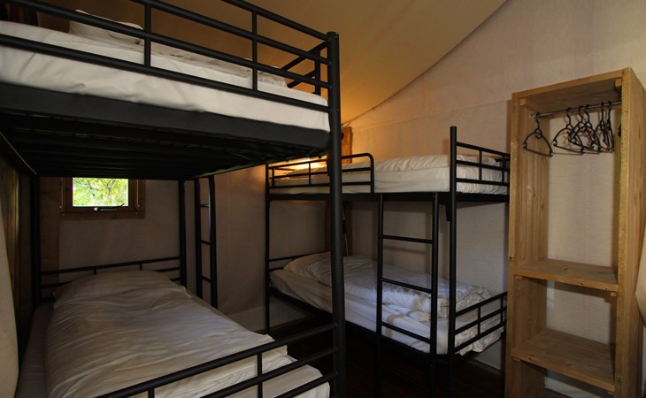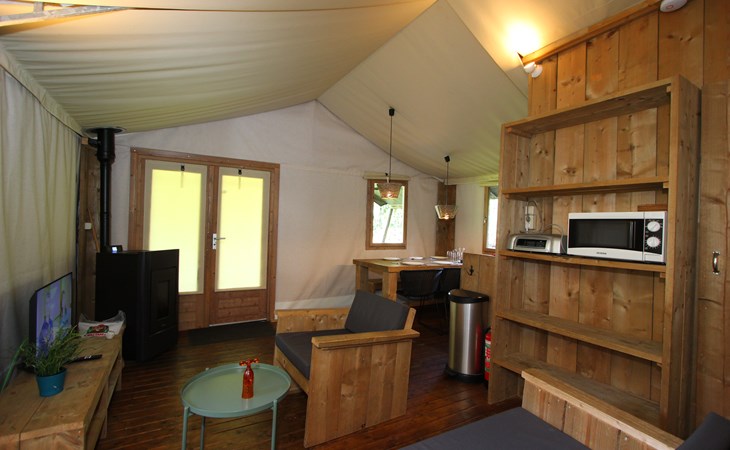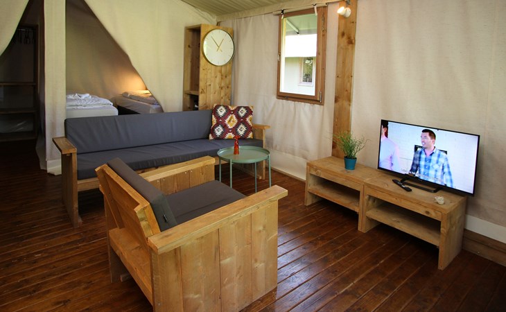 Die Four Season Lodge 6 bietet ein luxuriöses und geräumiges Campingerlebnis in der Landschaft von Drenthe. Dieses ebenerdige Glampingzelt ist für maximal 6 Personen geeignet und kann über eine kleine Stufe betreten werden. Der Gemeinschaftsraum des Zeltes hat eine gemütliche Sitzecke mit Fernseher, einen Esstisch und eine Küche mit Mikrowelle, Gasherd und Filterkaffeemaschine. Das Zelt hat 2 Schlafzimmer, eines mit 2 Etagenbetten (also Platz für 4 Personen) und eines mit zwei Einzelbetten. Das Badezimmer hat eine Toilette, ein Waschbecken und eine Duschkabine. An der Four Season Lodge 6 kann ein Auto geparkt werden. Das WLAN ist kostenfrei. Sie können in der Nähe des Chalets parken.