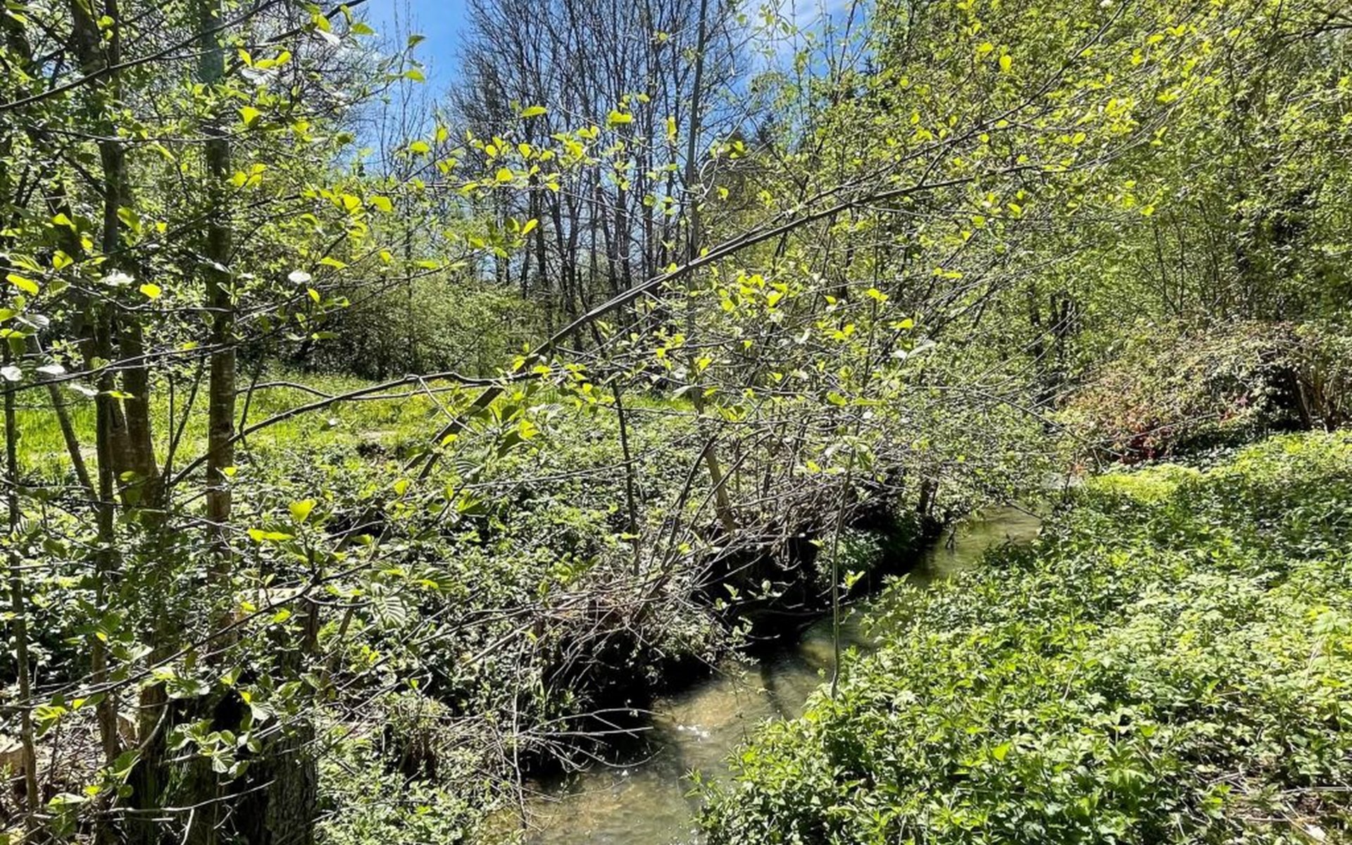 Der Außenbereich lädt zum Verweilen ein: Eine großzügige, eingefriedete Wiese, geschützt durch Zaun, Hecke und Büschen sowie ein malerischer Bachlauf bieten perfekte Bedingungen für ausgelassenes Spielen von Hunden und Kindern. Eine schöne Sonnenterrasse samt Gartenmöbeln verspricht entspannte Stunden im Freien, während sichere Parkplätze das praktische Angebot komplett machen.