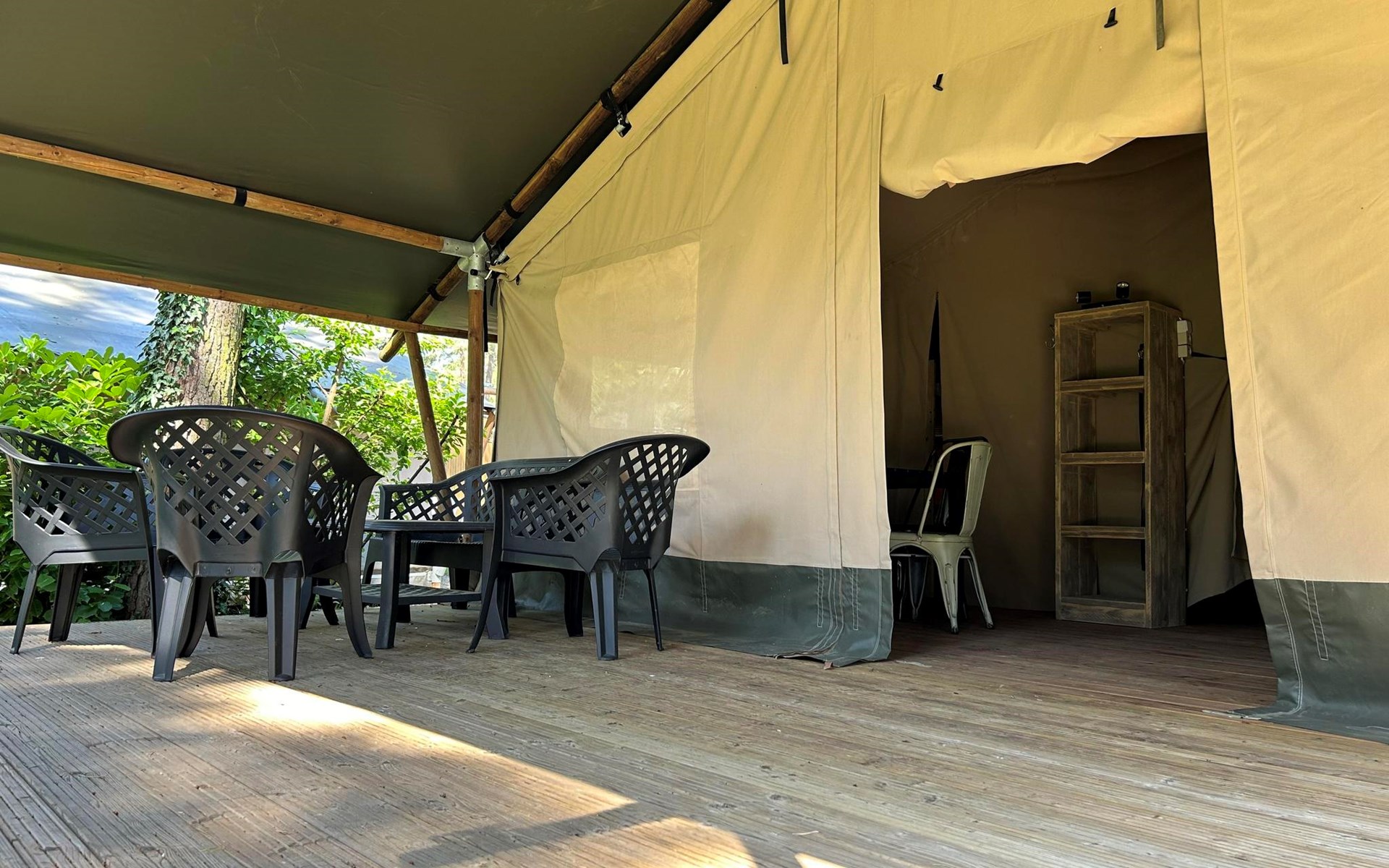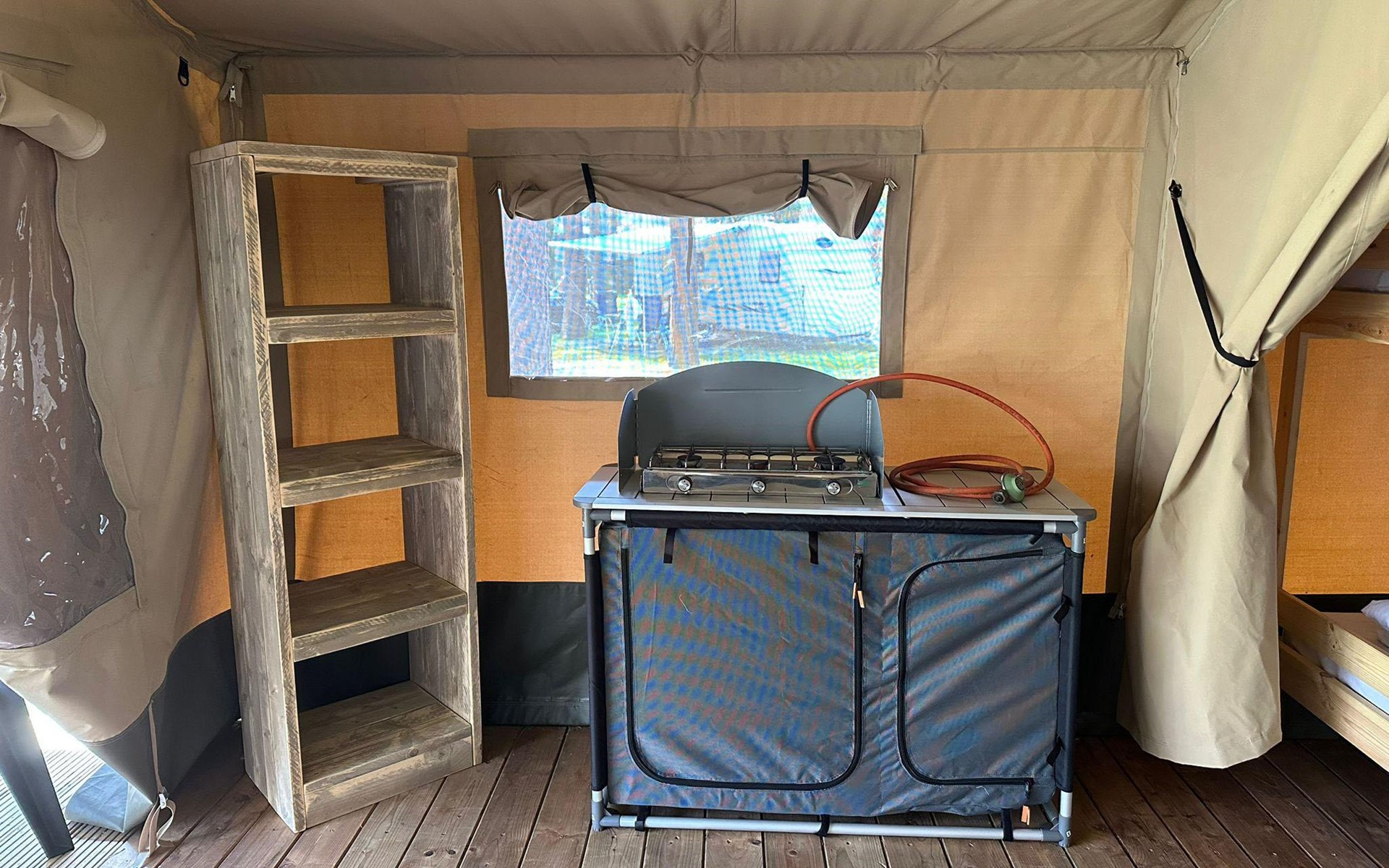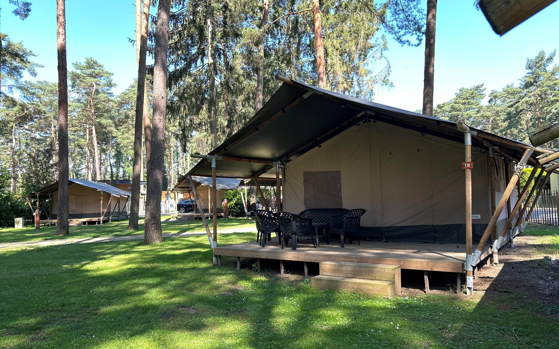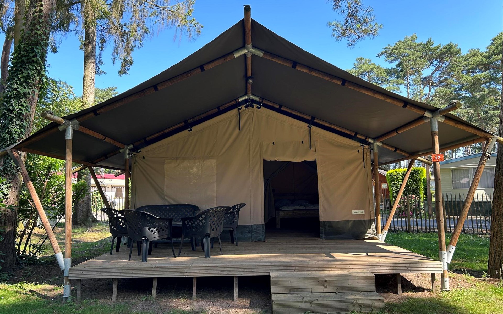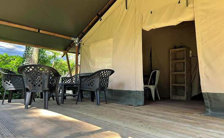 Safari tent 4 ist ein gemütliches Zelt für 4 Personen. Hier erleben Sie das Gefühl von Camping, aber mit dem Luxus eines möblierten Zeltes mit Betten, Kochnische und Essbereich. Im Glamping-Zelt gibt es zwei Schlafzimmer, eines mit einem Doppelbett und eines mit einem Etagenbett. Darüber hinaus gibt es eine Küchenzeile mit Wasserkocher und Filterkaffeemaschine. Im Glamping-Zelt gibt es keine Sanitäranlagen, dafür können Sie das Toilettengebäude im Ferienpark aufsuchen. Auf der Terrasse mit Gartenmöbeln können Sie die schönen Bäume und die Natur um Sie herum genießen. Sie können auch das kostenlose WLAN nutzen.