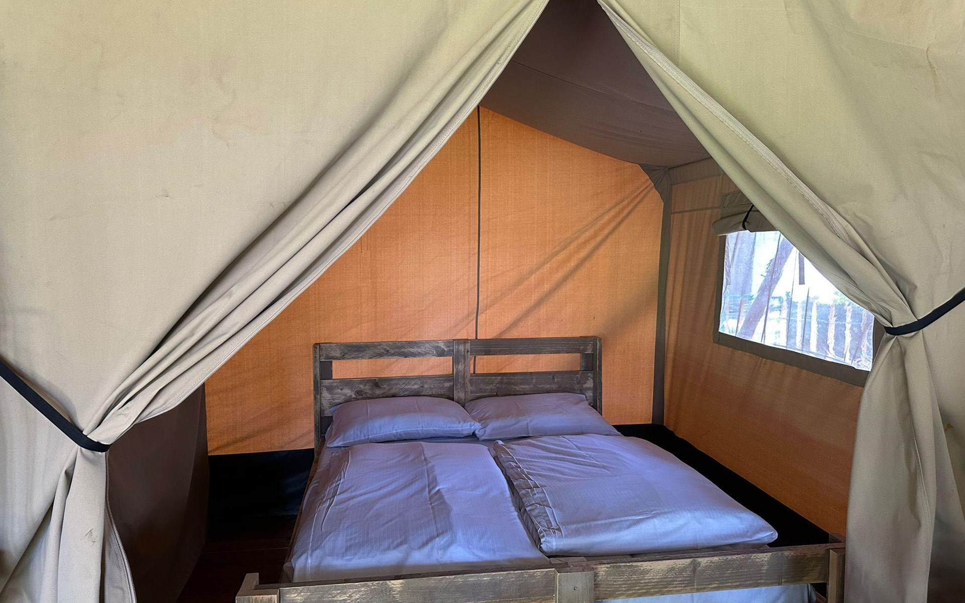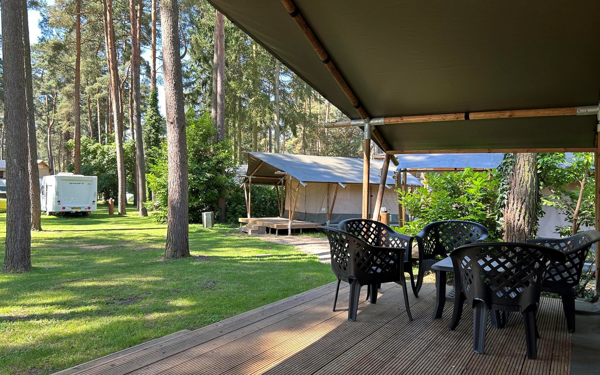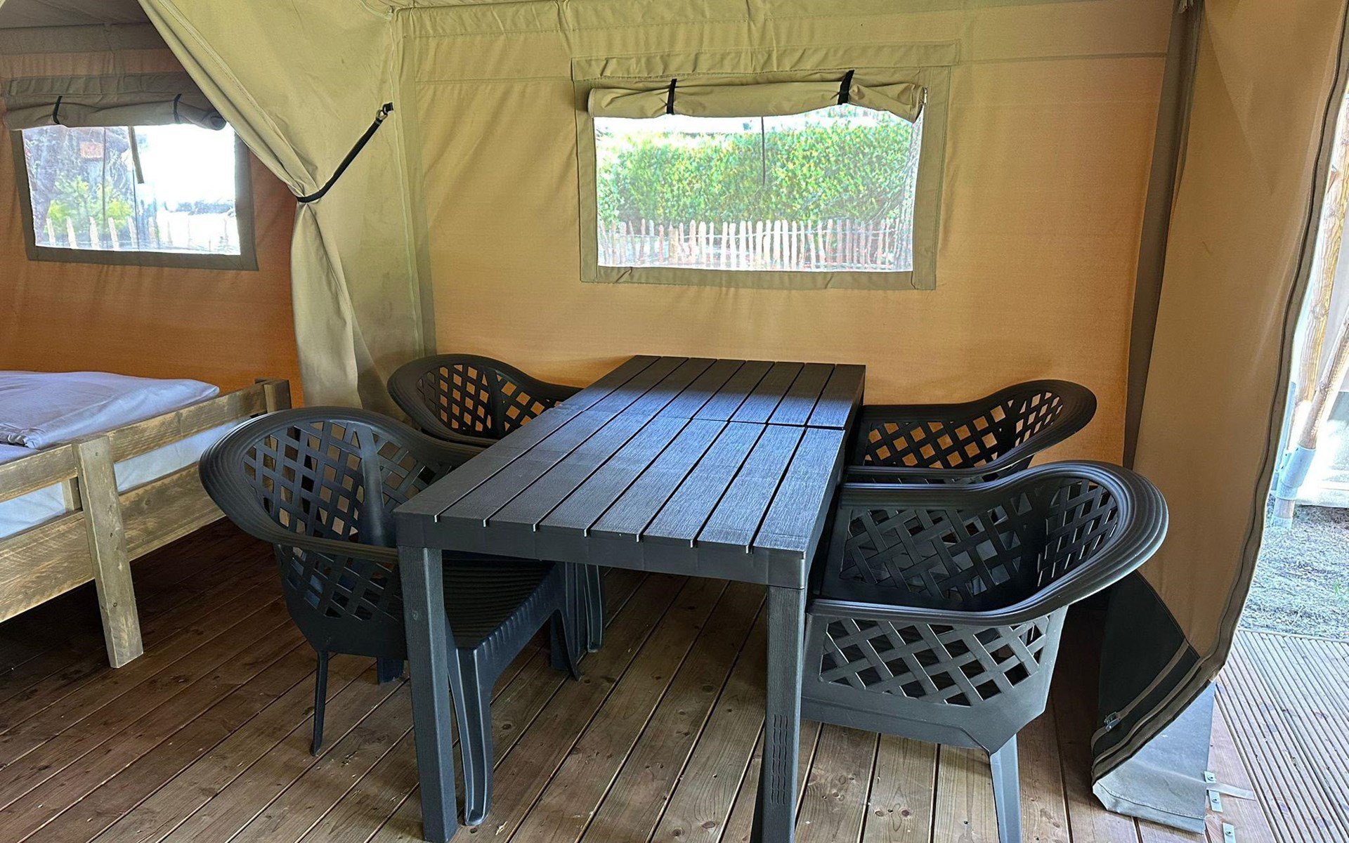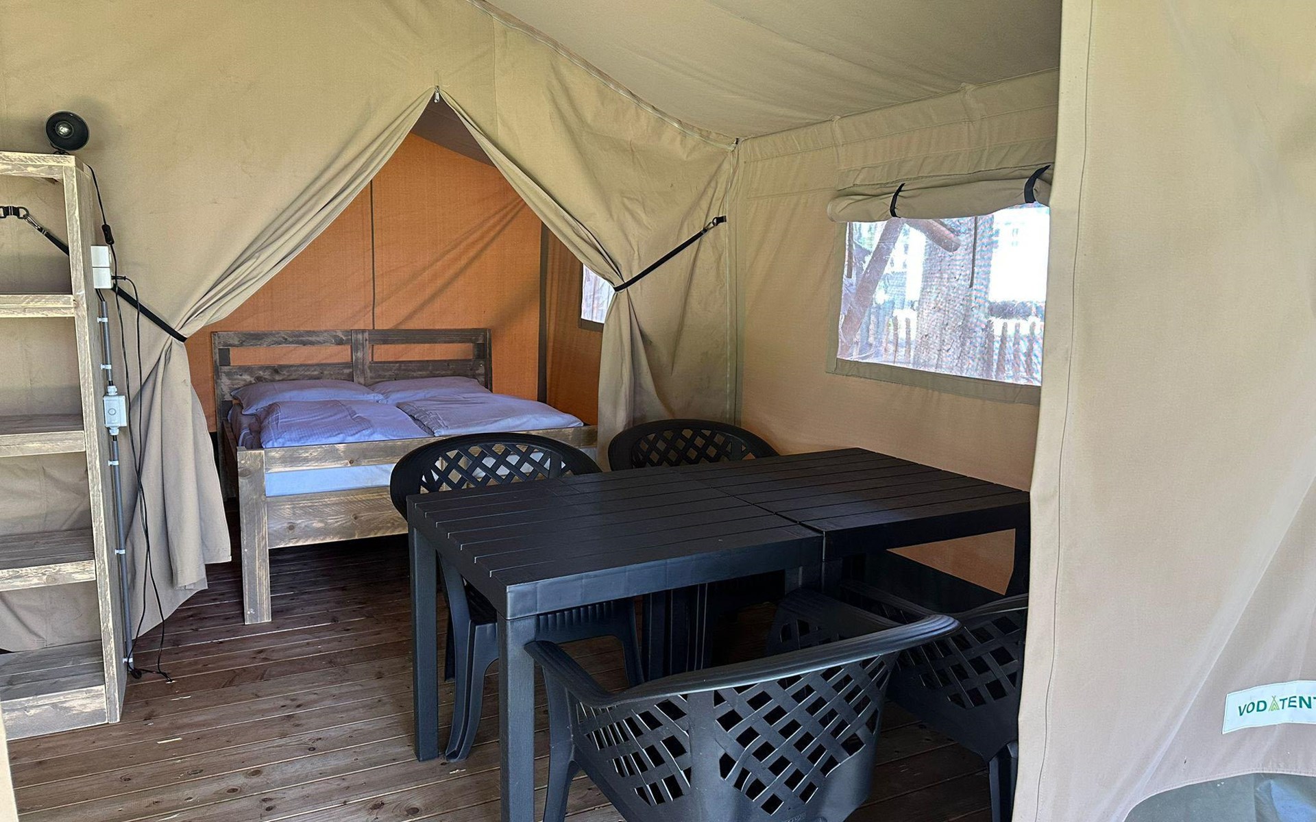 Safari tent 4 ist ein gemütliches Zelt für 4 Personen. Hier erleben Sie das Gefühl von Camping, aber mit dem Luxus eines möblierten Zeltes mit Betten, Kochnische und Essbereich. Im Glamping-Zelt gibt es zwei Schlafzimmer, eines mit einem Doppelbett und eines mit einem Etagenbett. Darüber hinaus gibt es eine Küchenzeile mit Wasserkocher und Filterkaffeemaschine. Im Glamping-Zelt gibt es keine Sanitäranlagen, dafür können Sie das Toilettengebäude im Ferienpark aufsuchen. Auf der Terrasse mit Gartenmöbeln können Sie die schönen Bäume und die Natur um Sie herum genießen. Sie können auch das kostenlose WLAN nutzen.