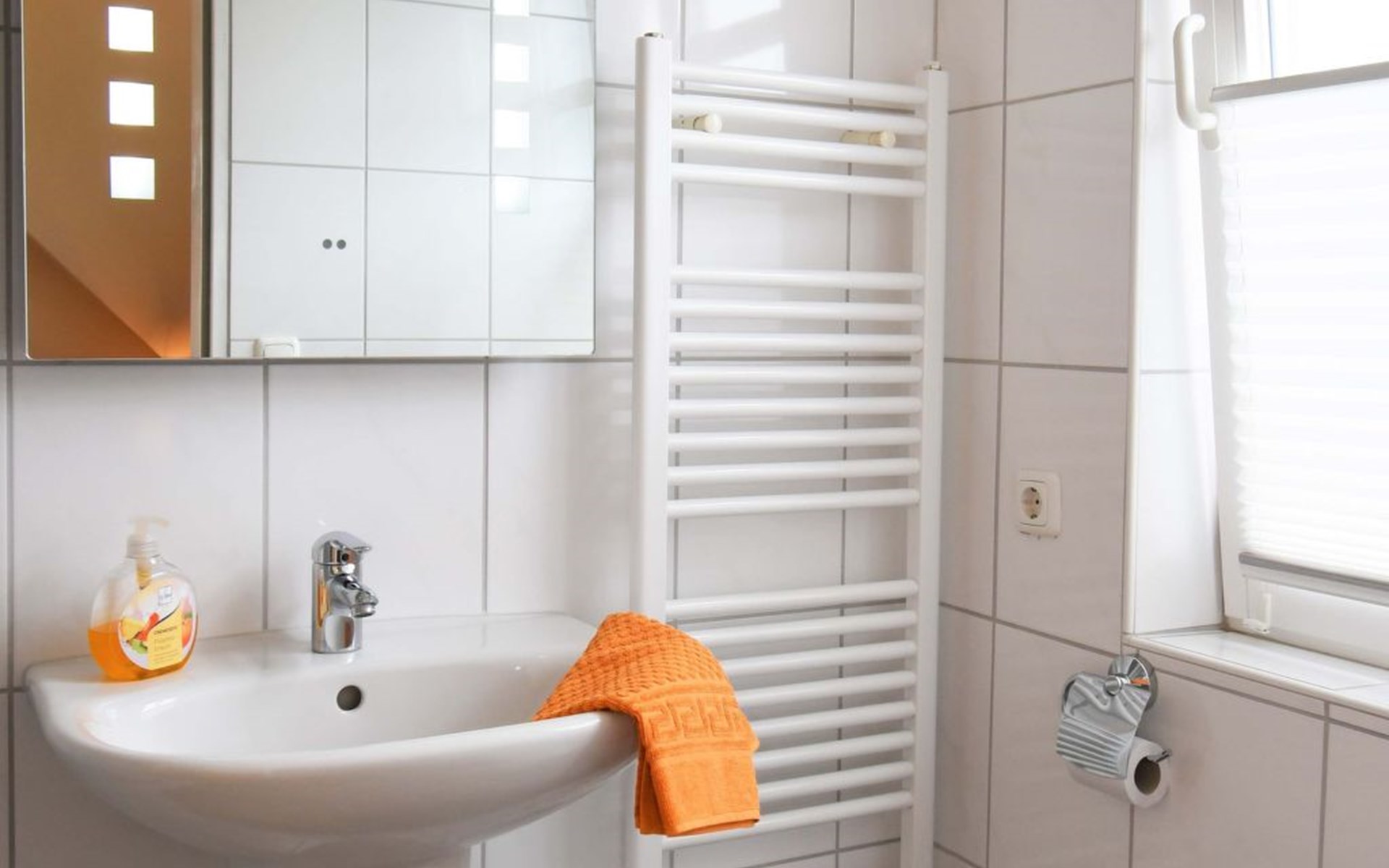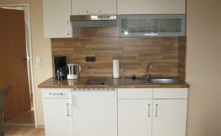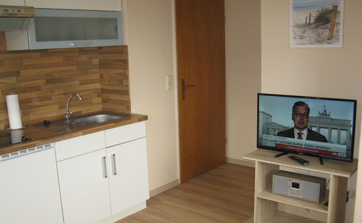 Innen erwartet Sie ein behaglich gestaltetes Schlafzimmer, das vollständig abgedunkelt werden kann, um Ihnen einen ruhigen und erholsamen Schlaf zu gewährleisten. Ein Smart-TV steht zur Unterhaltung bereit. Die komplett ausgestattete Küchenzeile mit einem Zwei-Platten-Herd, einer Filter-Kaffeemaschine, einem Wasserkocher und einem Minibackofen verspricht unkomplizierte Mahlzeiten in eigenem Ambiente. Zudem stehen eine Waschmaschine und ein Wäschetrockner zur gemeinschaftlichen Nutzung im Gebäude bereit, was einen längeren Aufenthalt besonders komfortabel gestaltet.