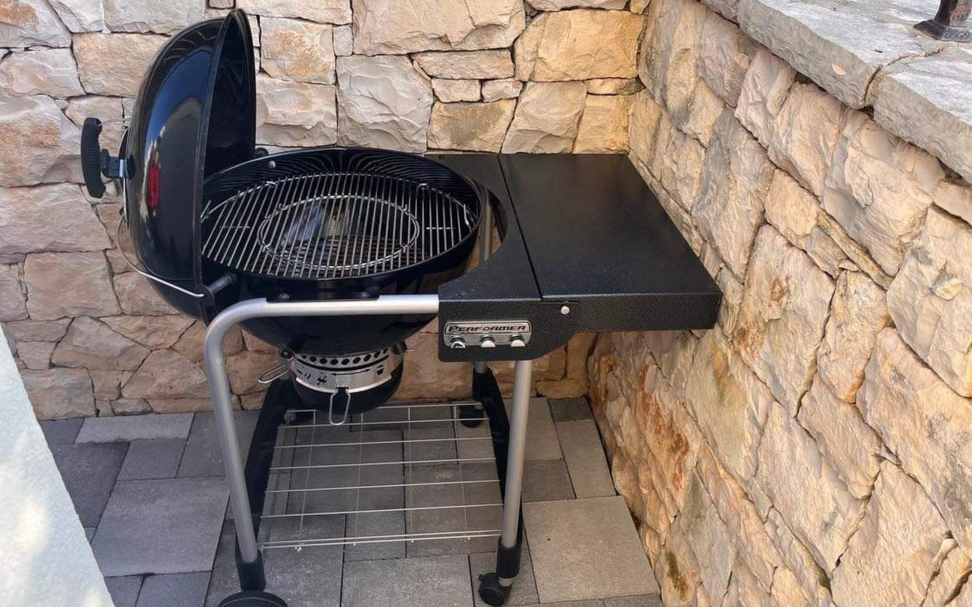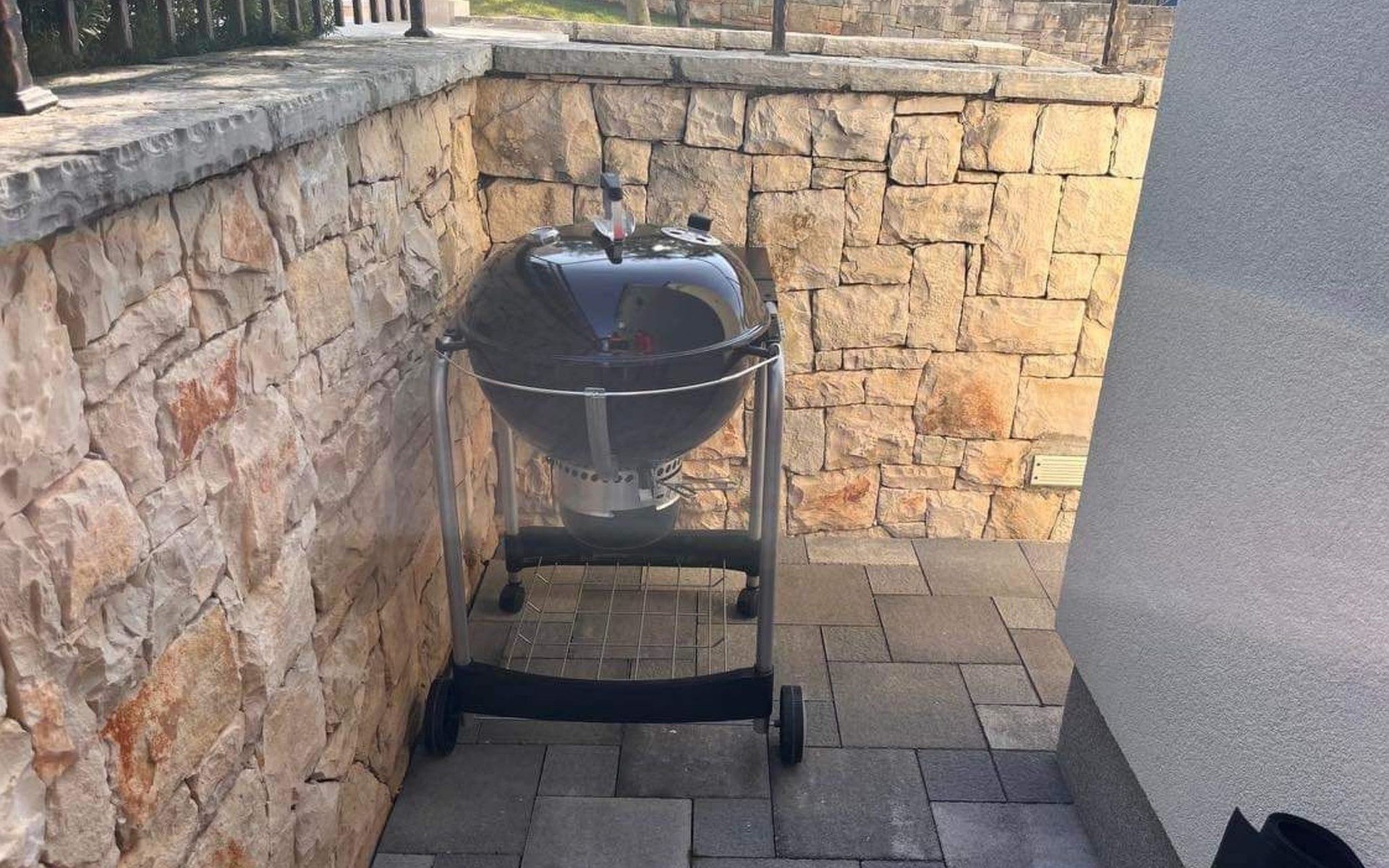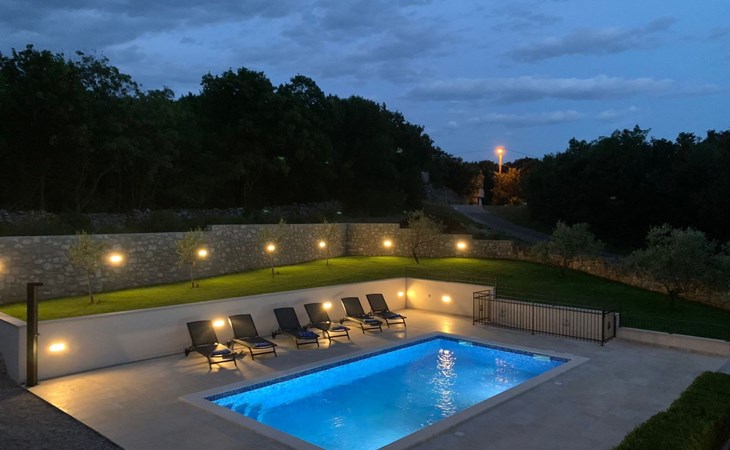 Vor dem Haus befindet sich eine 20 m² große offene Terrasse sowie ein Schwimmbad (8 x 4 m) mit Sonnenterrasse (Beckentiefe 150 cm). Ein Parkplatz ist auf dem Grundstück vorhanden. Das Naturgrundstück ist 1000m² groß und eingezäunt. Gartenmöbel und Liegestühle sind vorhanden, ebenso wie eine Außendusche mit solarbeheiztem Warmwasser.
