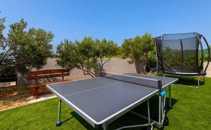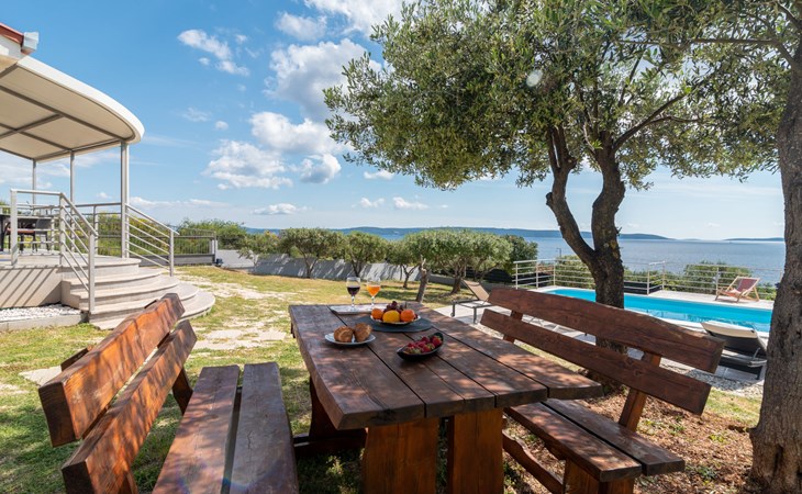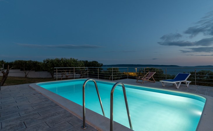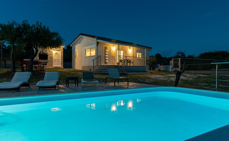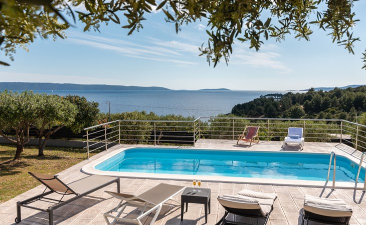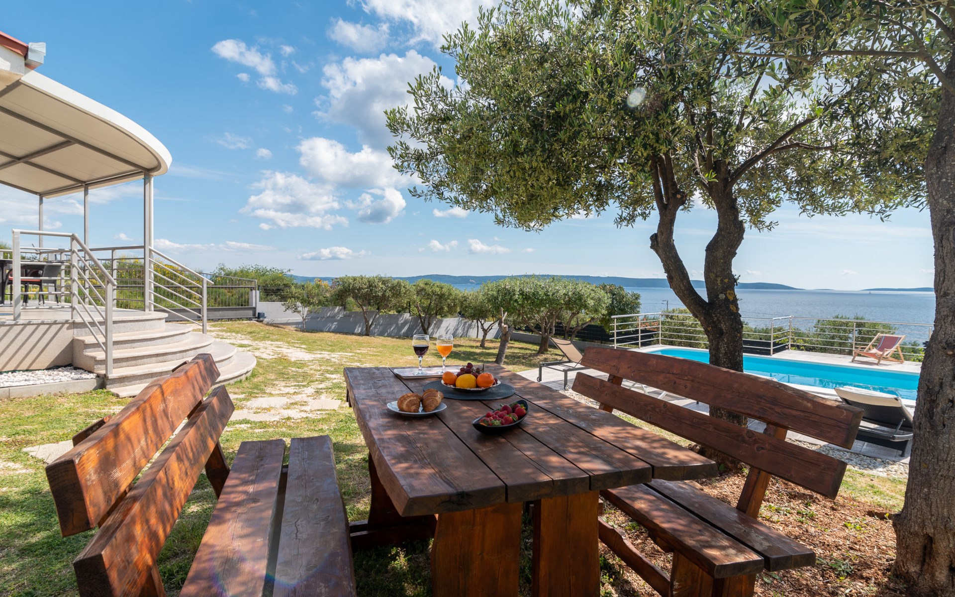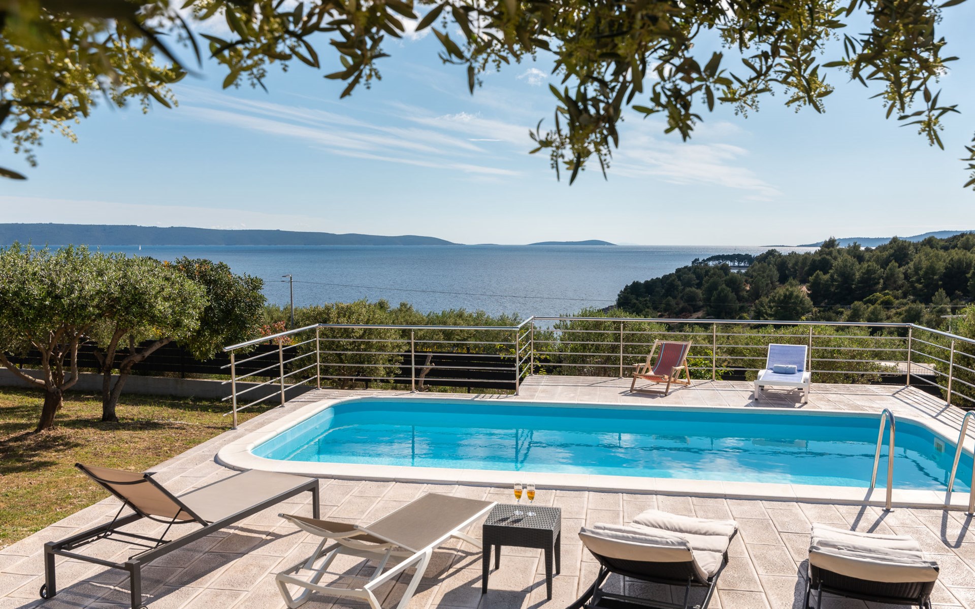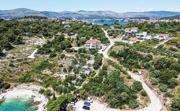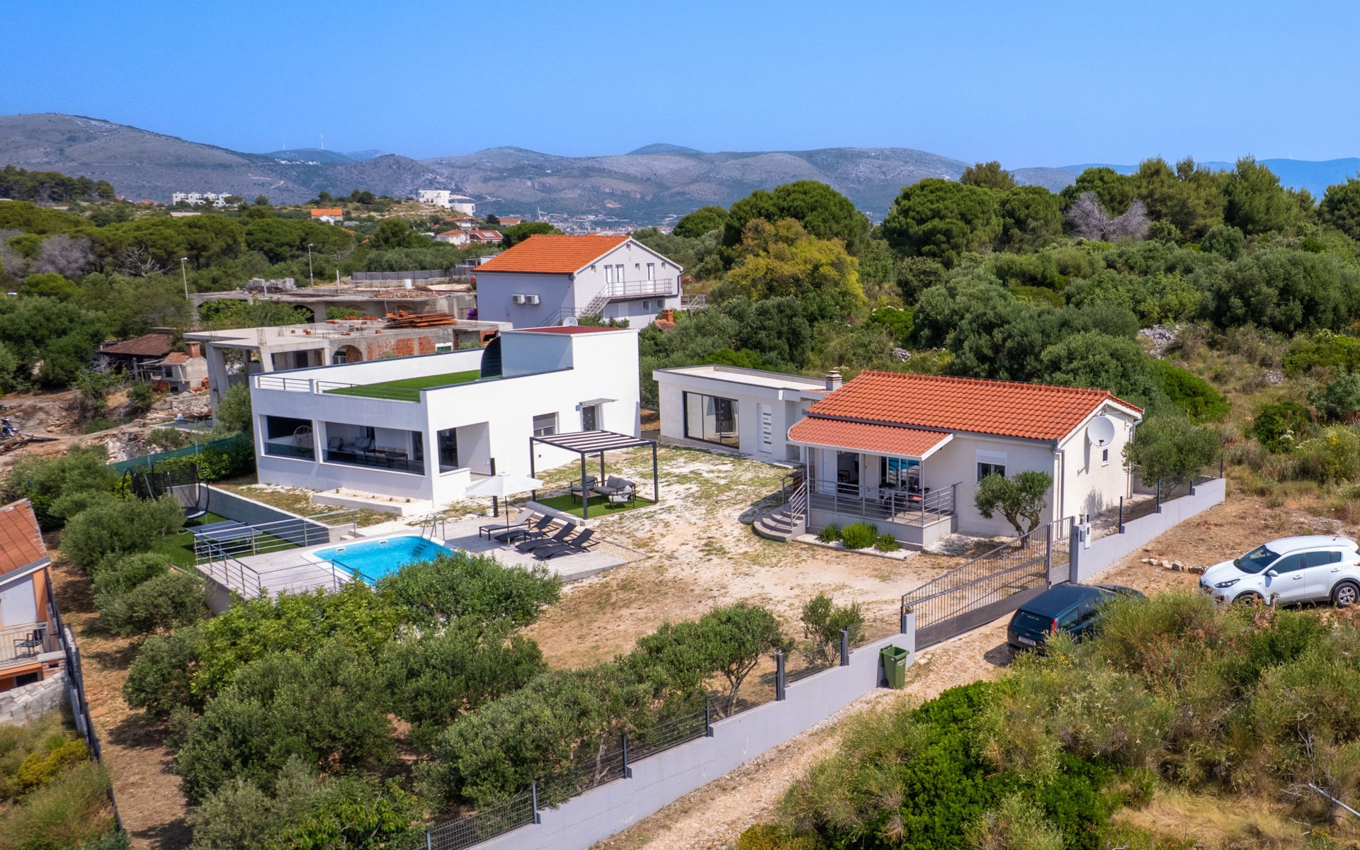 Okrug Gornji (Čiovo): Haus "Ria with heated pool". 1.5 km vom Zentrum von Okrug Gornji, 5 km vom Zentrum von Trogir, ruhige, sonnige Lage, 180 m vom Meer, 180 m vom Strand. Zur Alleinbenutzung: Grundstück 1'200 m2 (eingezäunt), Bäumen, Schwimmbad beheizt (26 m2, 150 cm tief, saisonale Verfügbarkeit: 04.Apr. - 06.Nov.). Aussendusche, Gartenmöbel, Grill. Im Hause: Internetzugang, Dachterrasse, Waschmaschine. Zufahrt bis zum Haus (50 m Naturweg). Parkplatz (für 3 Autos) beim Haus auf dem Grundstück. Einkaufsgeschäft 500 m, Supermarkt 1.5 km, Restaurant 1.5 km, Bushaltestelle 500 m, Kieselstrand 180 m. Bitte beachten: Flugplatz 10 km vom Haus. Die Anlage besteht aus einem grossen Haupthaus (100 m2) und einem kleinen Haus (46 m2) welche zusammen vermietet werden.