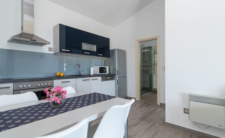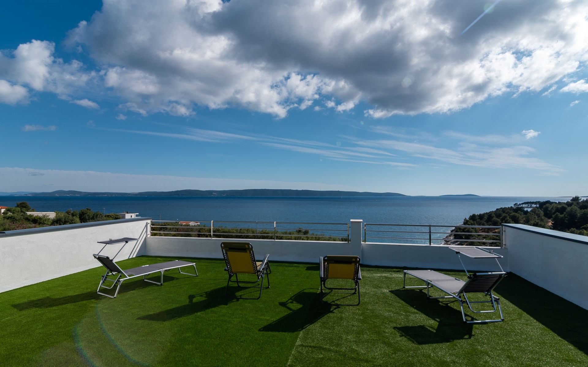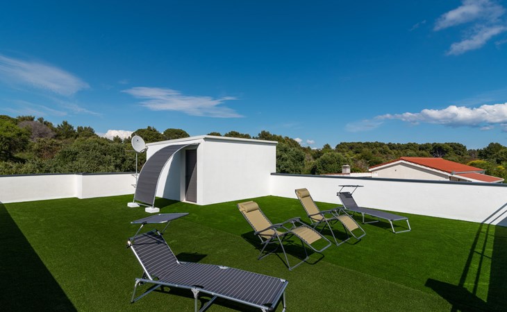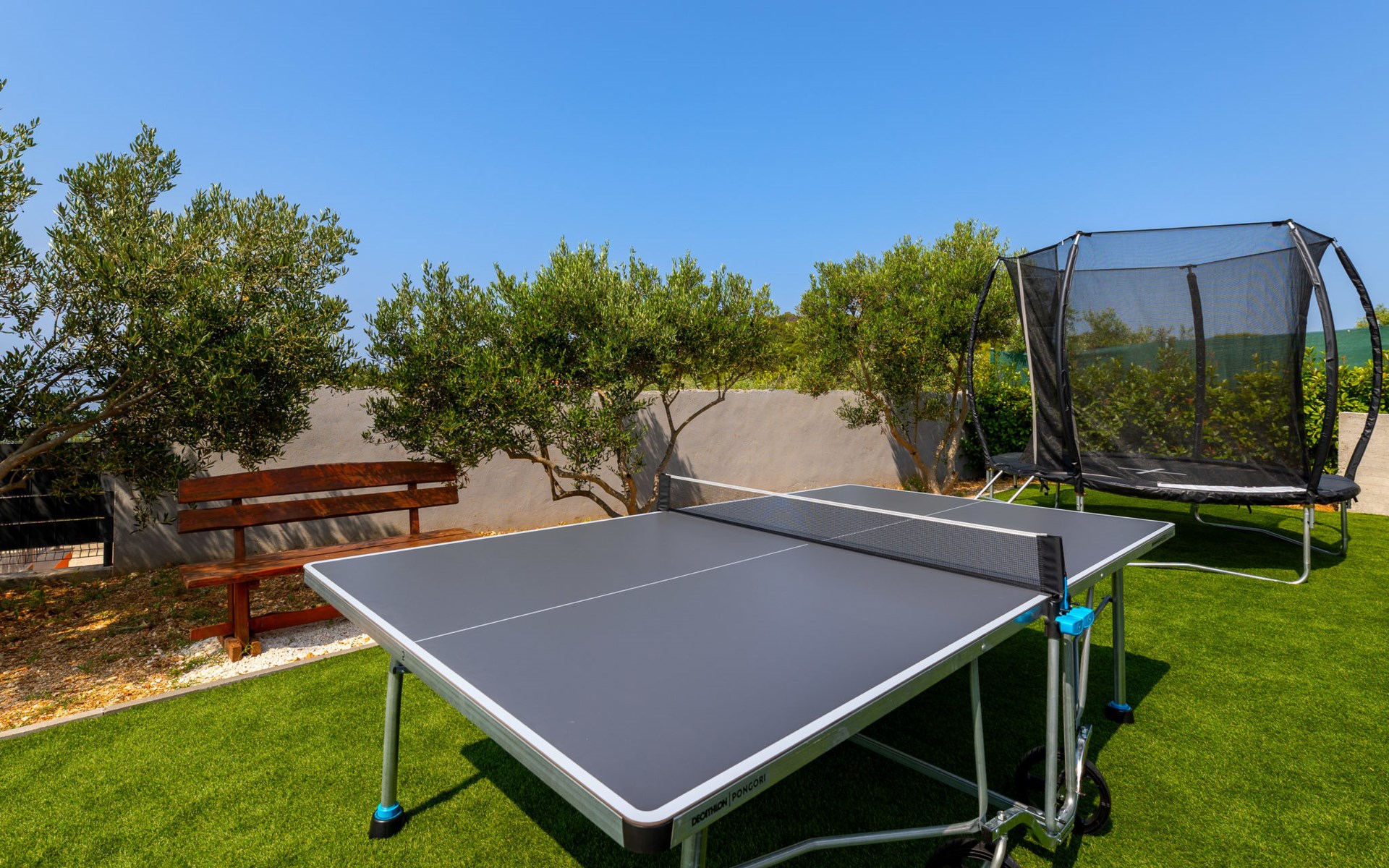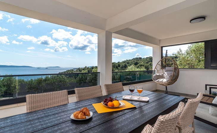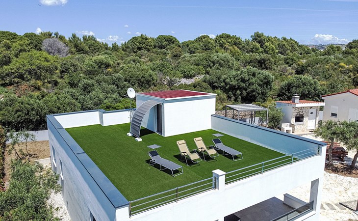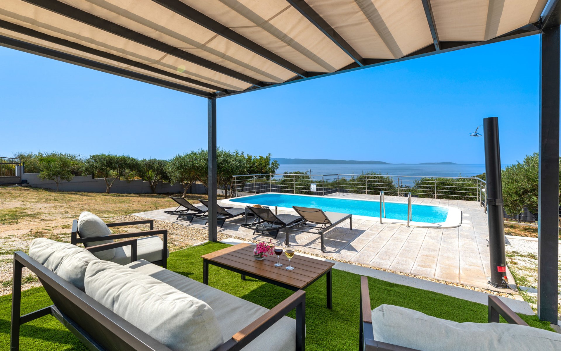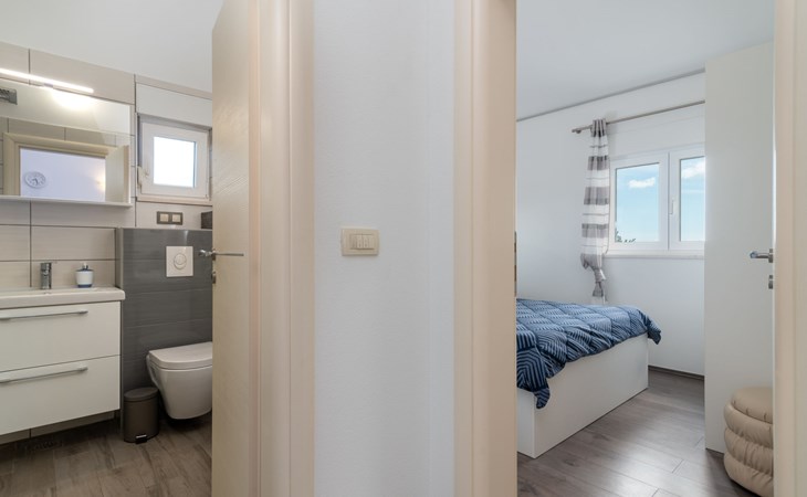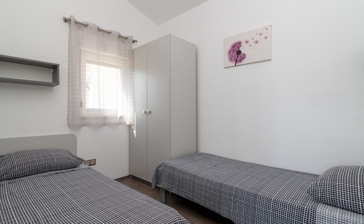 Okrug Gornji (Čiovo): Haus "Ria with heated pool". 1.5 km vom Zentrum von Okrug Gornji, 5 km vom Zentrum von Trogir, ruhige, sonnige Lage, 180 m vom Meer, 180 m vom Strand. Zur Alleinbenutzung: Grundstück 1'200 m2 (eingezäunt), Bäumen, Schwimmbad beheizt (26 m2, 150 cm tief, saisonale Verfügbarkeit: 04.Apr. - 06.Nov.). Aussendusche, Gartenmöbel, Grill. Im Hause: Internetzugang, Dachterrasse, Waschmaschine. Zufahrt bis zum Haus (50 m Naturweg). Parkplatz (für 3 Autos) beim Haus auf dem Grundstück. Einkaufsgeschäft 500 m, Supermarkt 1.5 km, Restaurant 1.5 km, Bushaltestelle 500 m, Kieselstrand 180 m. Bitte beachten: Flugplatz 10 km vom Haus. Die Anlage besteht aus einem grossen Haupthaus (100 m2) und einem kleinen Haus (46 m2) welche zusammen vermietet werden.