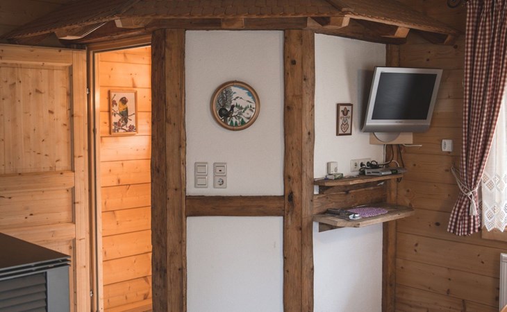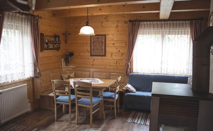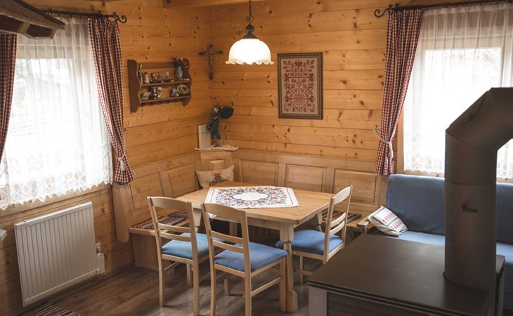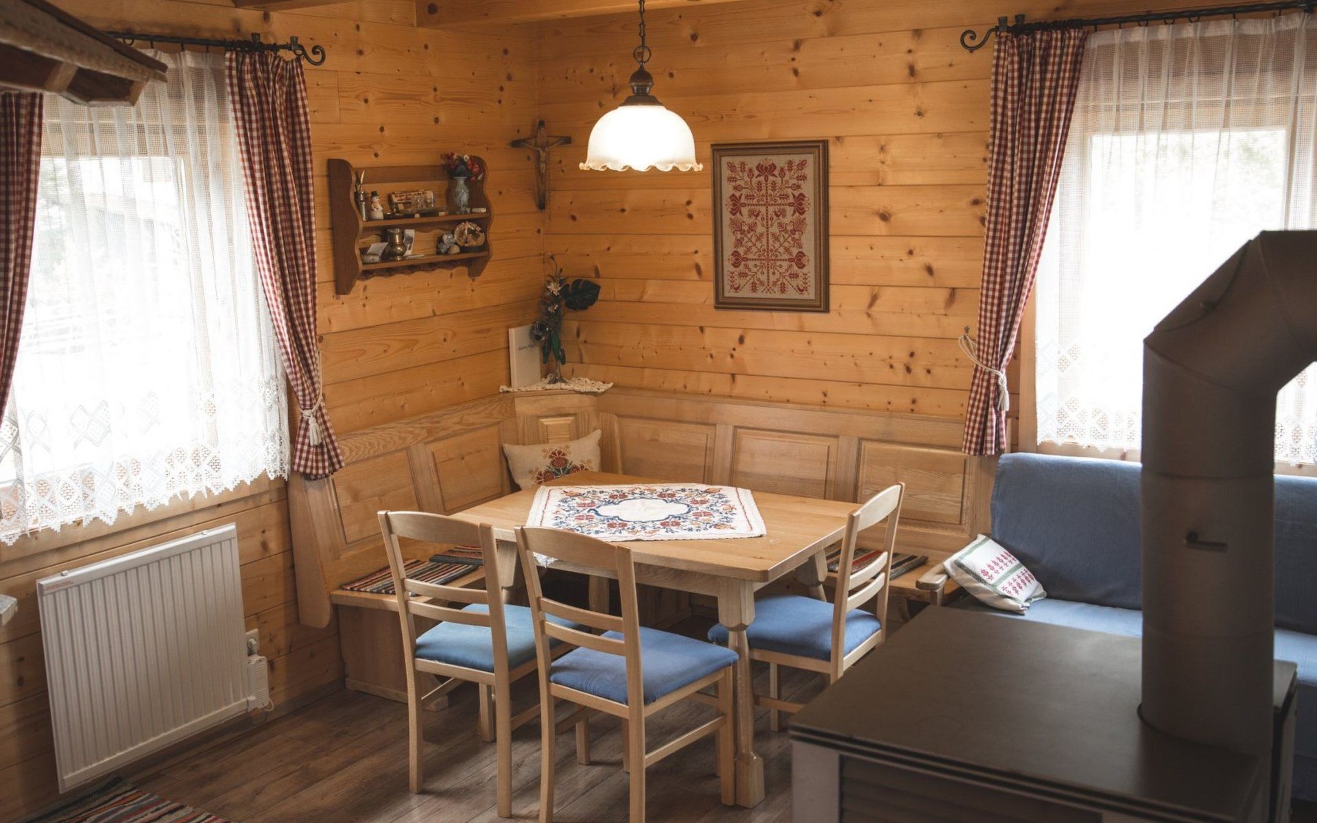* einem Wohnraum, der zu einem gemütlichen Zusammensitzen einlädt (eine große Sitzecke mit Holztisch, TV mit SAT - Anlage und ein Kaminofen),