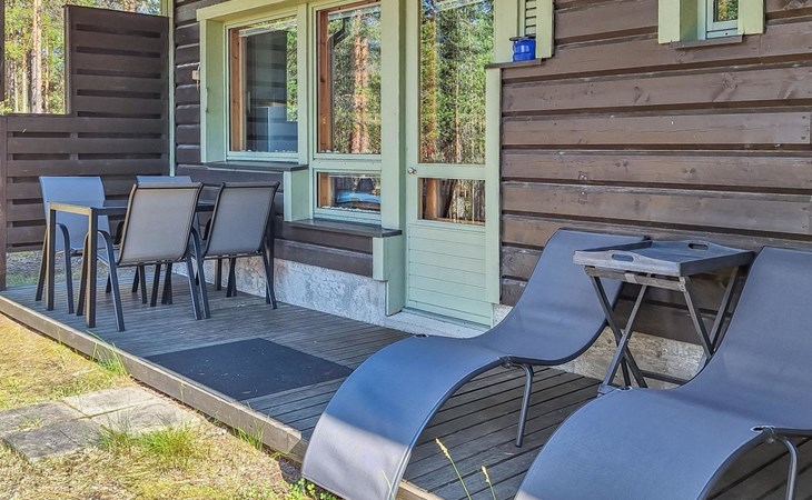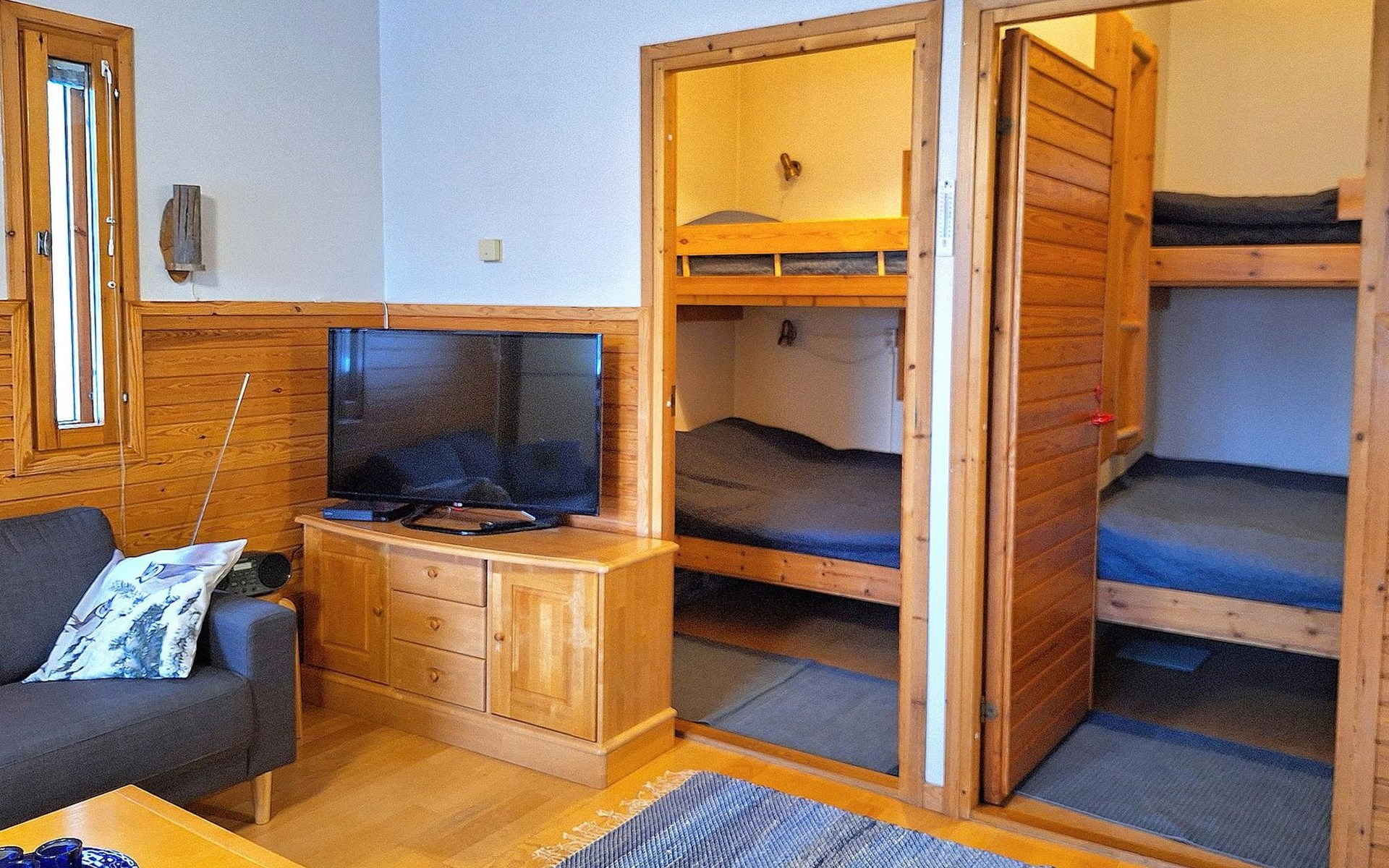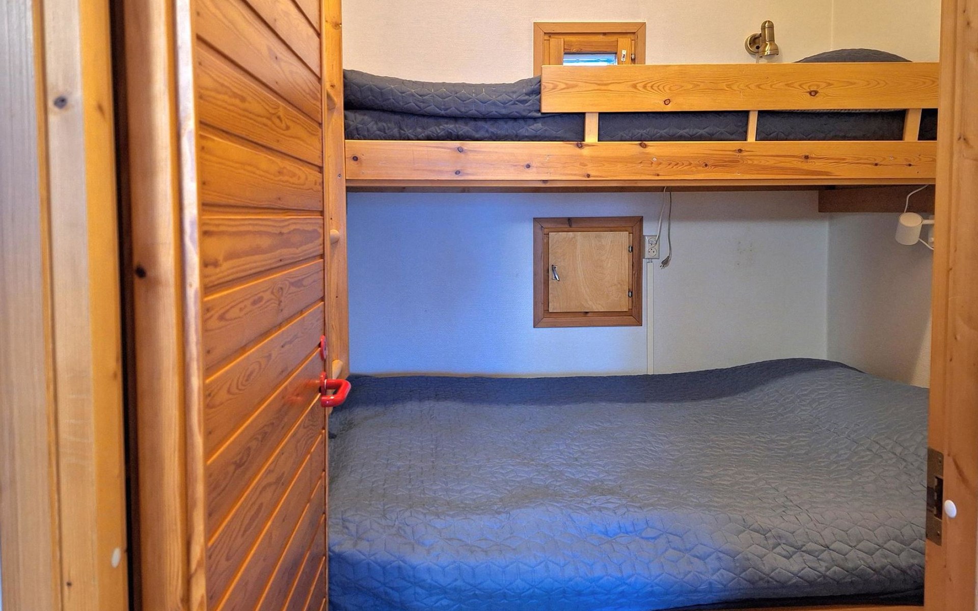 Indoors, there's an open living room/kitchen, perfect for spending time together. Two bedrooms offer space for 4-6 people, each with bunk beds, where the lower bed is 160 cm wide. The closet in the second bedroom is not available to customers.