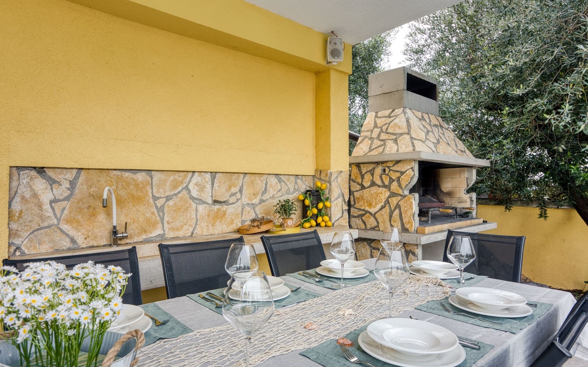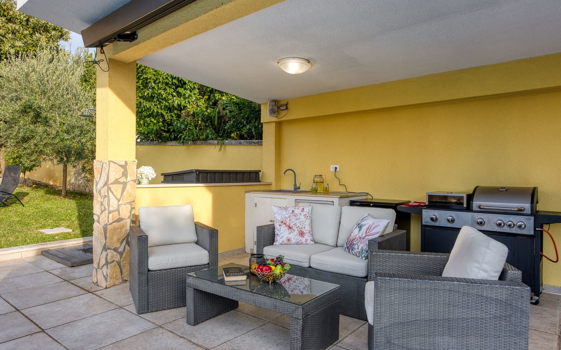 - Verschiedene Grillmöglichkeiten: Gemauerter Grill und Gasgrill