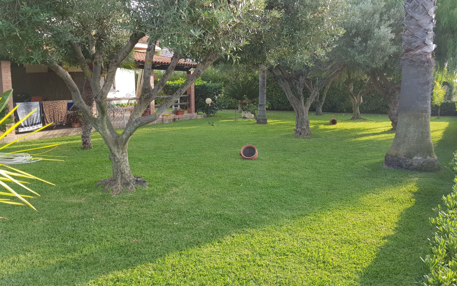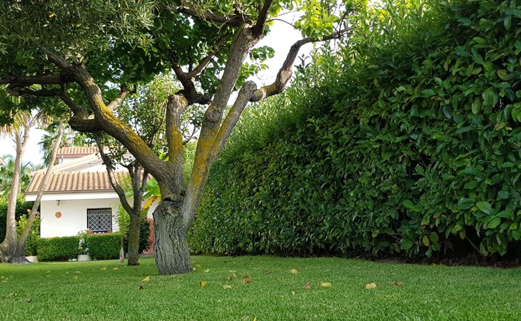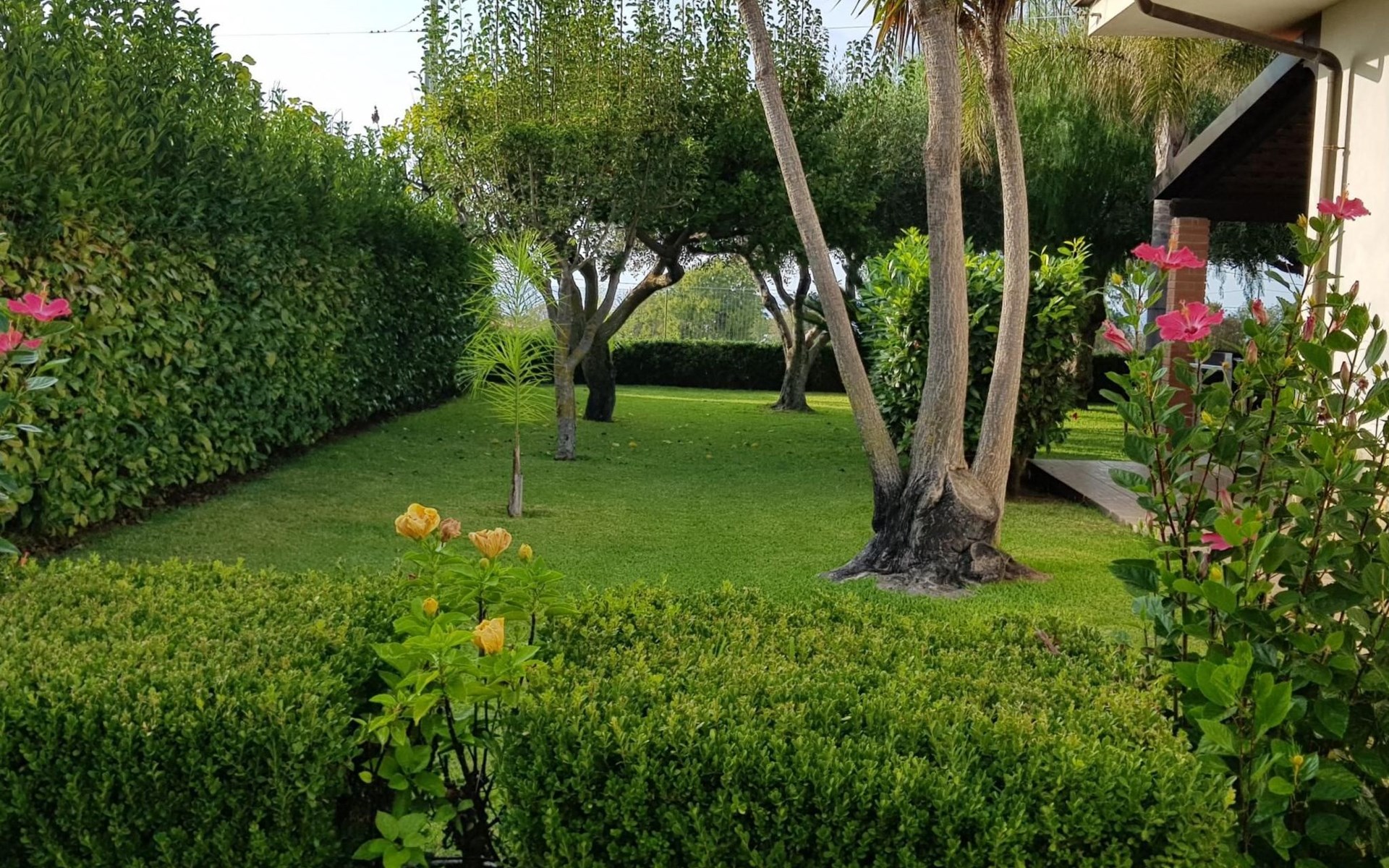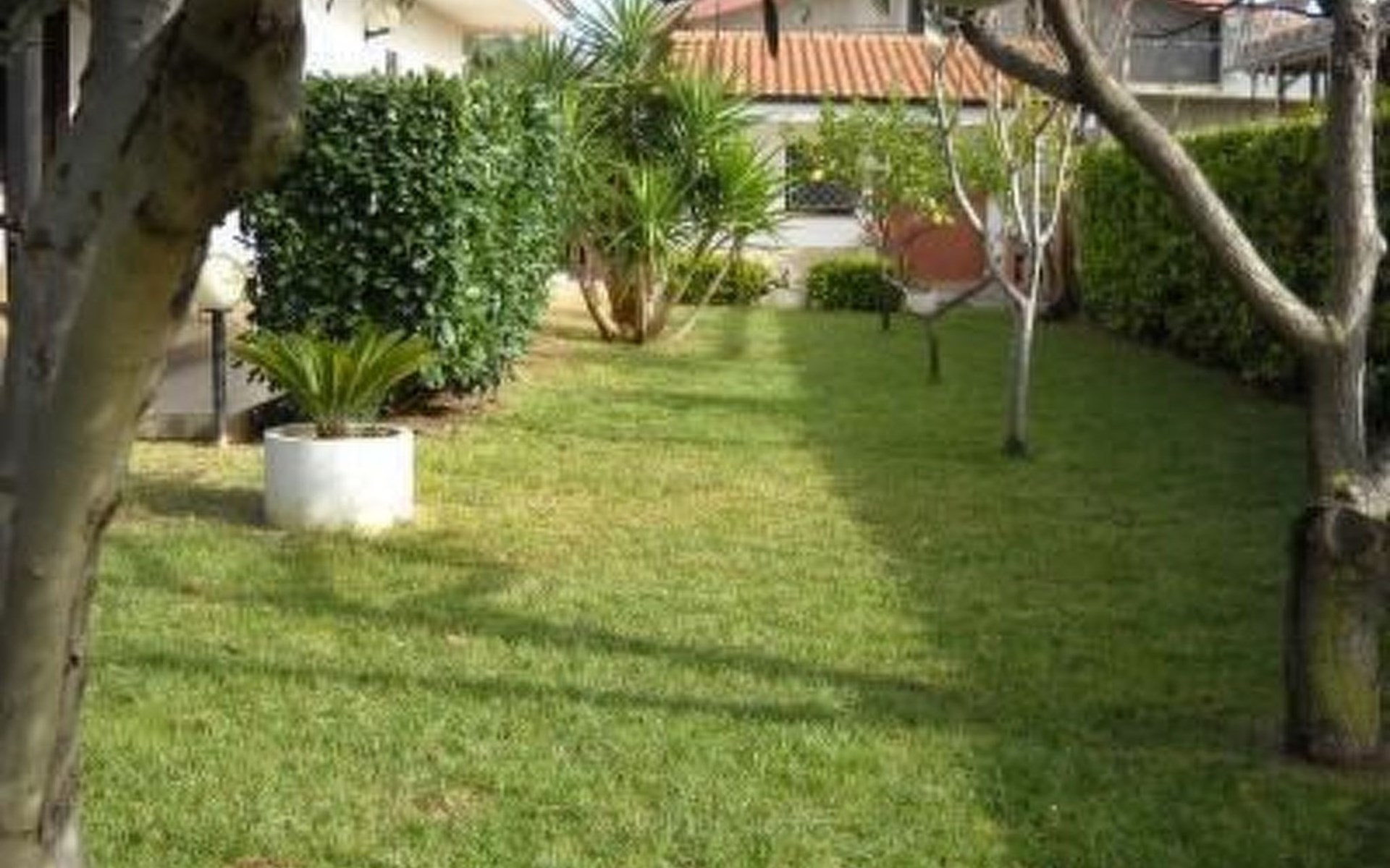 Großer, gepflegter Garten mit Bäumen.