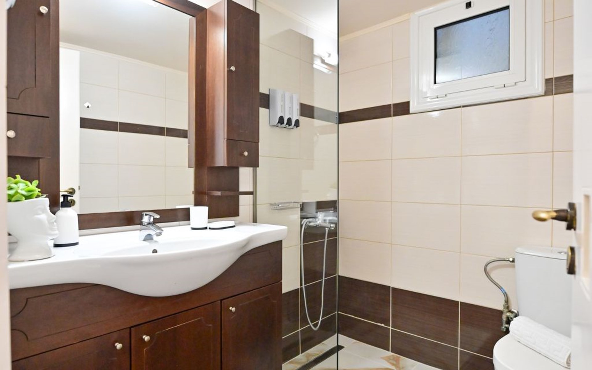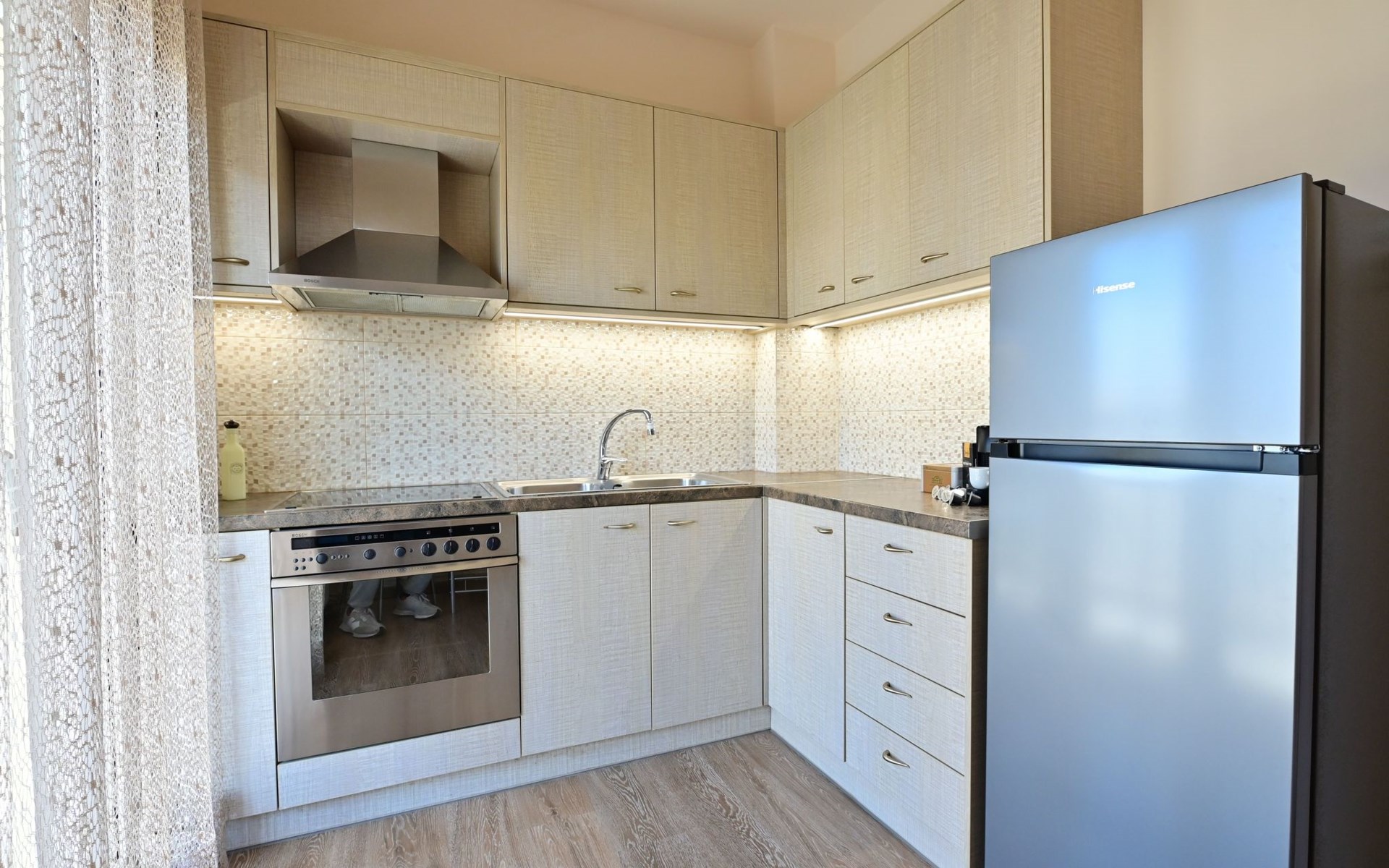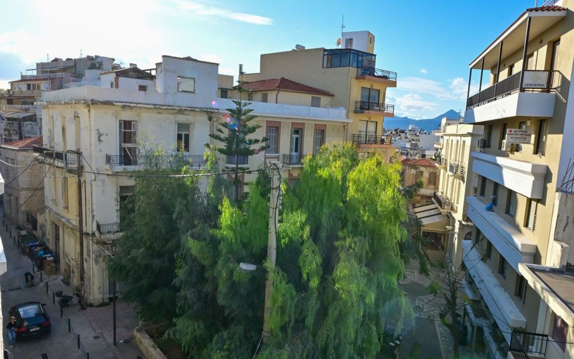 Die Außenbereiche dieses Ferienhauses sind ebenso einladend wie die Innenräume. Die Sonnenterrasse ist eine private Oase, in der die Gäste entspannen und die Sonne Heraklions genießen können. Der Balkon mit Blick auf die Stadt ist der perfekte Ort, um den Morgenkaffee oder ein abendliches Getränk in Ruhe zu genießen. Diese Bereiche werten das Wohnerlebnis erheblich auf und bieten Orte der Ruhe inmitten des Trubels der Stadt.