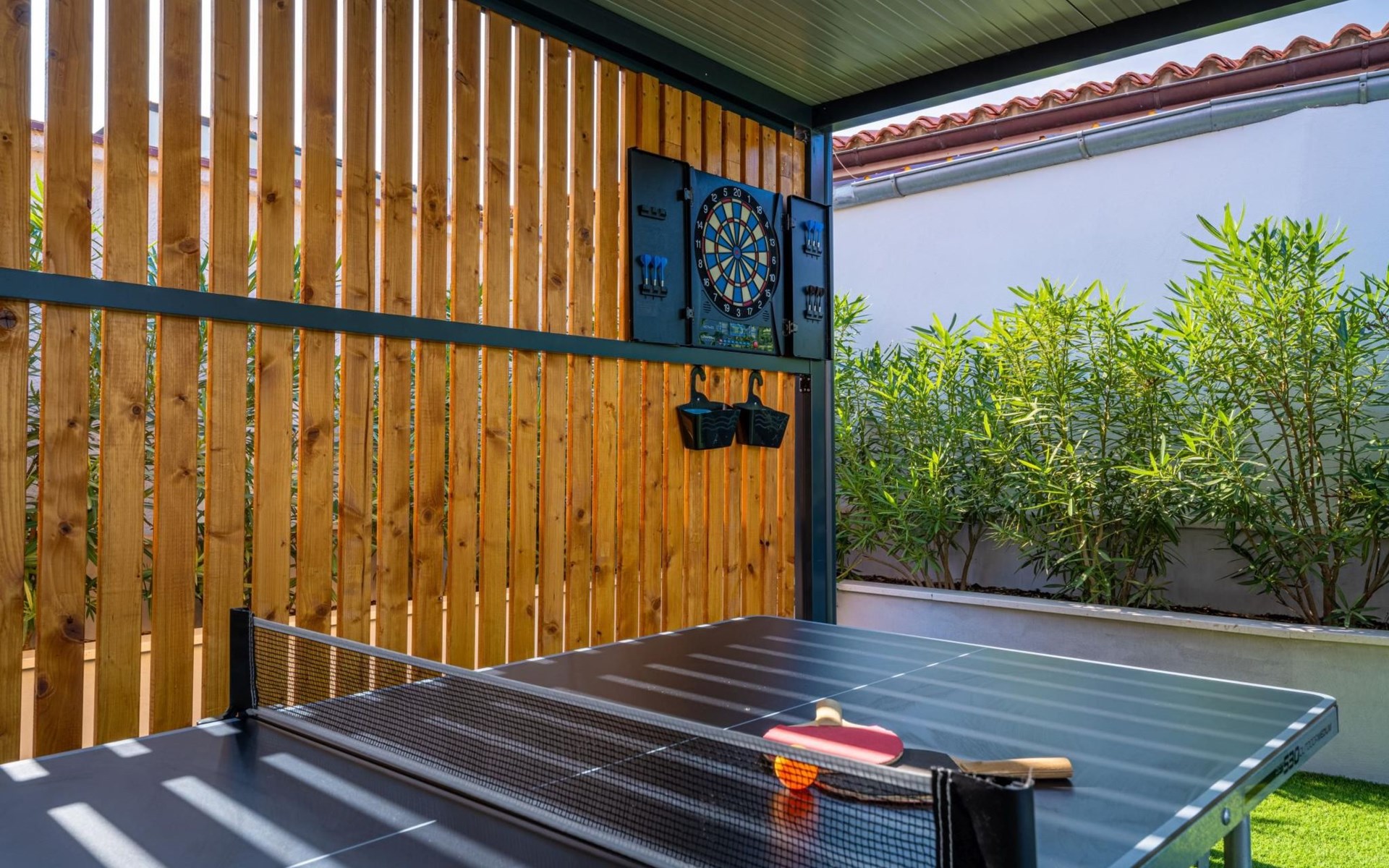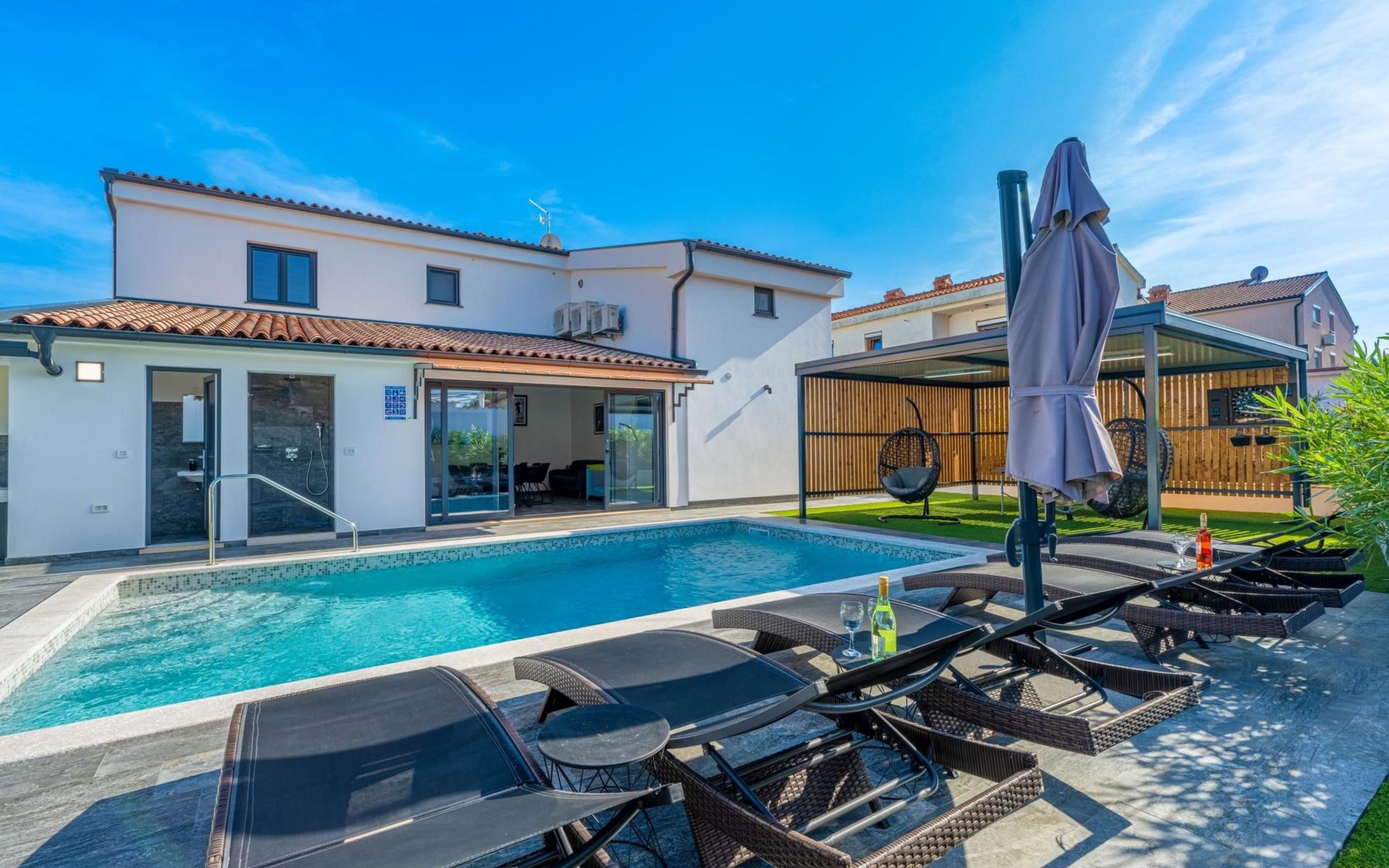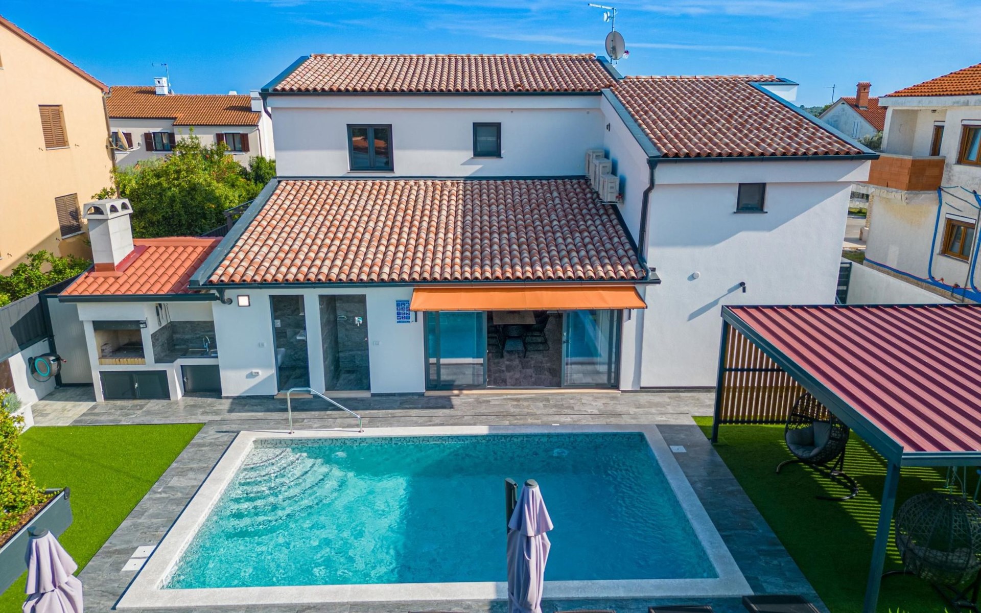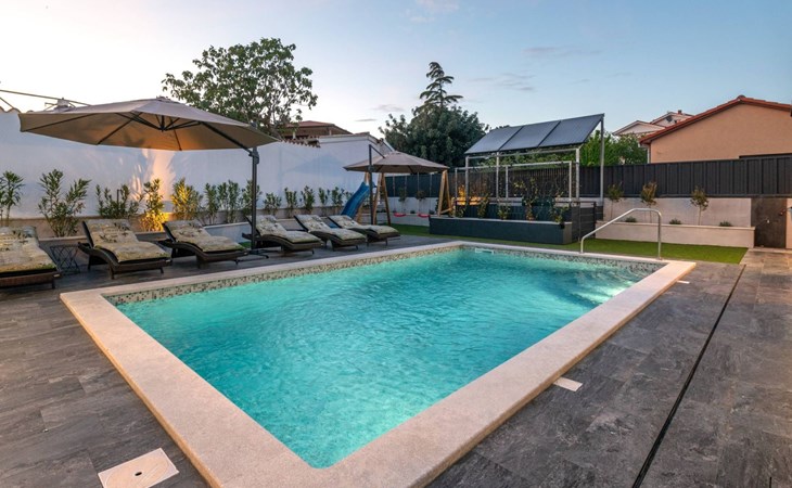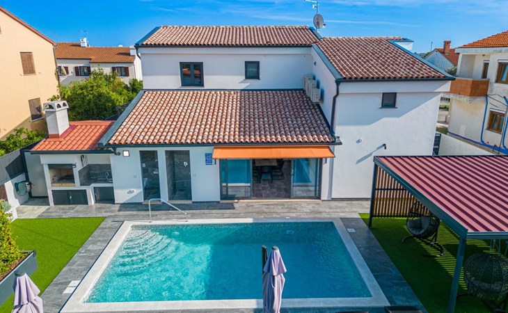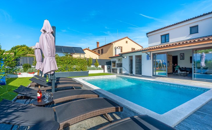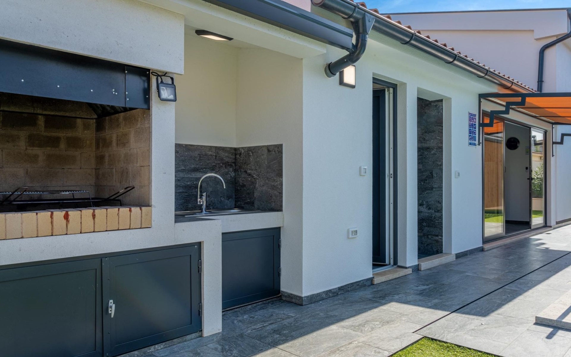 Das große Anwesen bietet einen privaten Pool, einen Holzgrill, eine voll ausgestattete Sommerküche mit großem Esstisch, einen Garten und 3 Parkplätze.