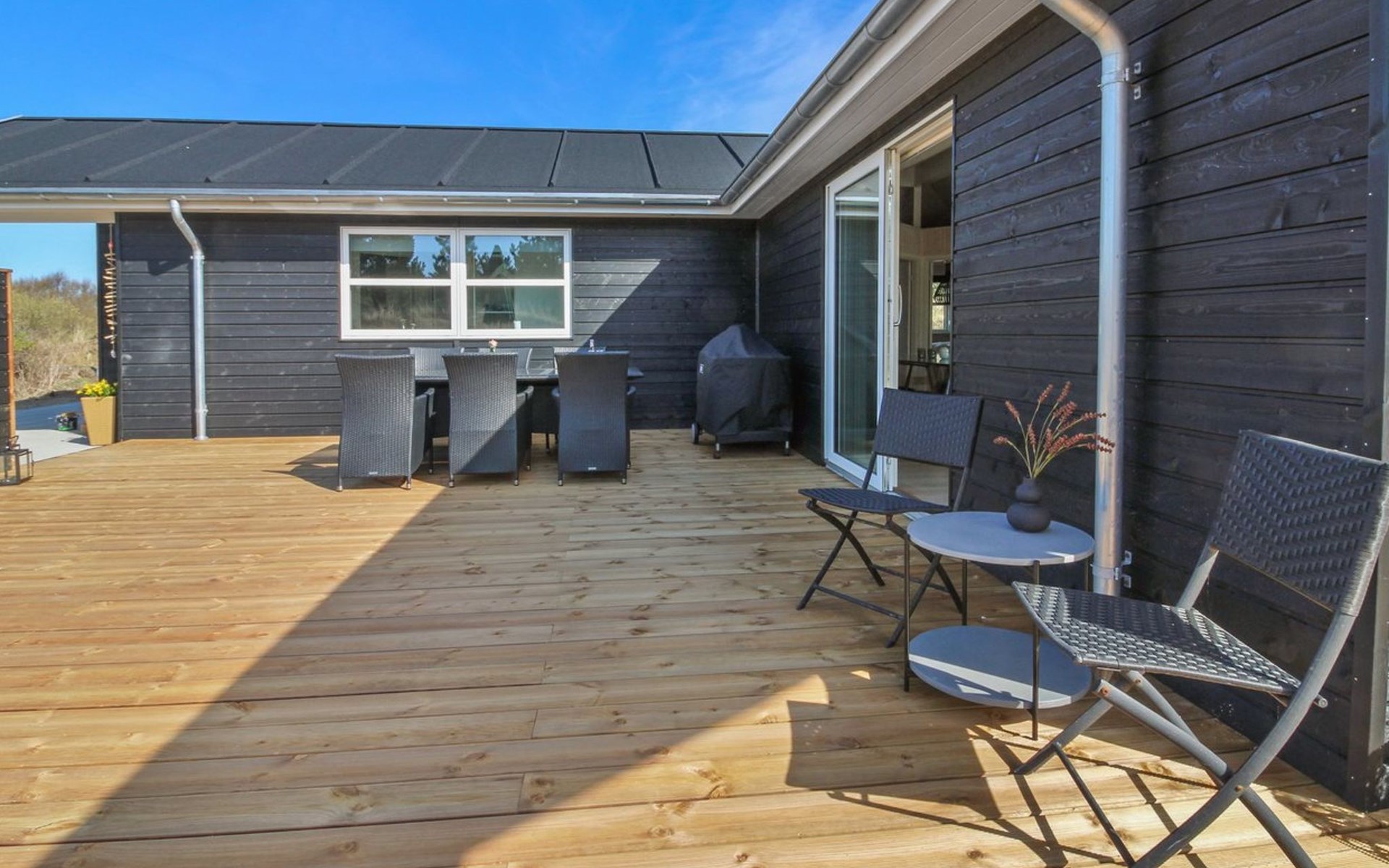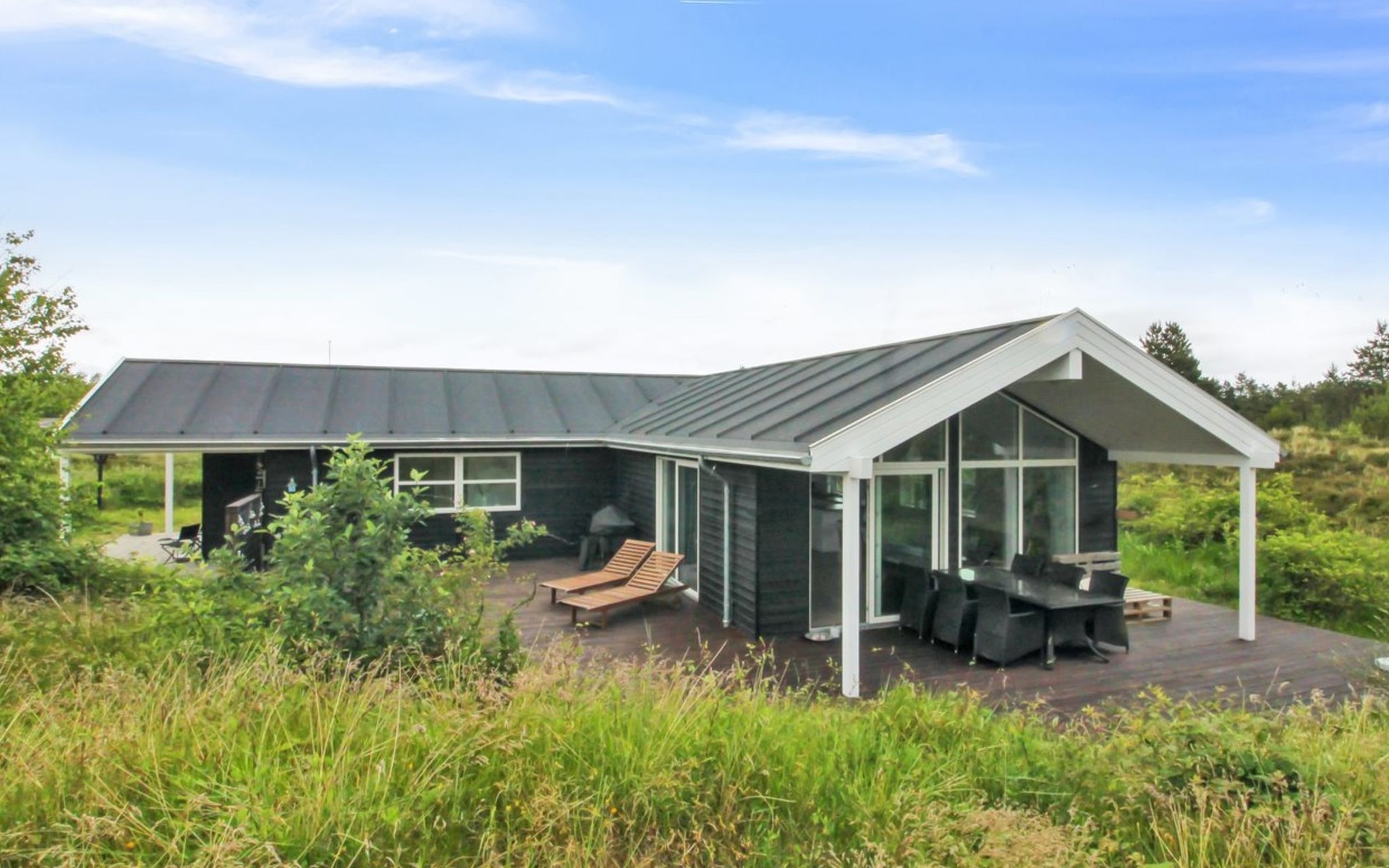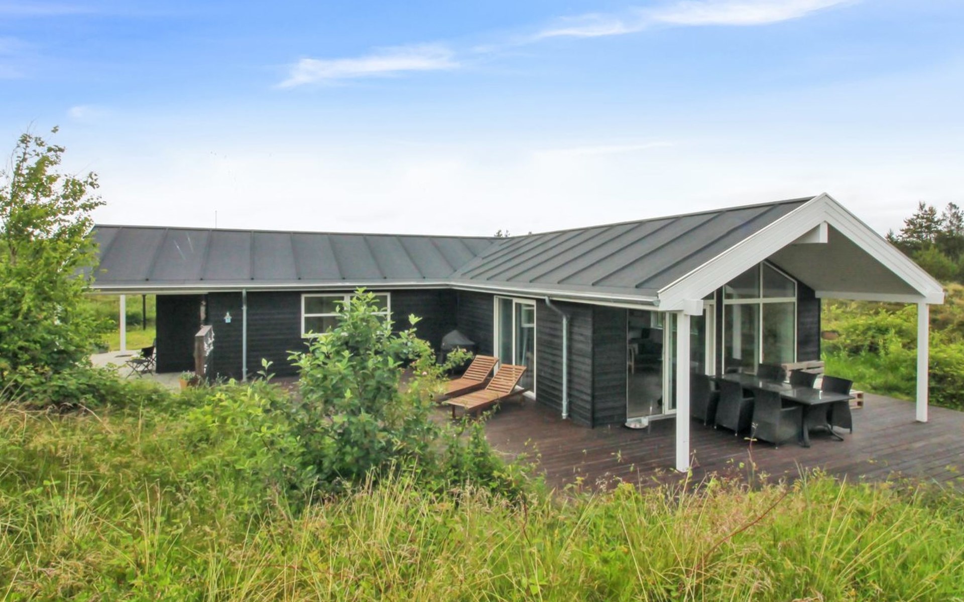 Einfamilienhaus, Baujahr 2022. 2.2 km vom Meer. Zur Alleinbenutzung: naturbelassenes Grundstück 2'500 m2. Terrasse (70 m2), Grill, Kinderspielplatz (Schaukel). Im Hause: Waschmaschine, Wäschetrockner. Parkplatz beim Haus. E-Ladestation. Lebensmittelgeschäft 1.8 km. Golfplatz 8.5 km. Der Besitzer akzeptiert keine Jugendgruppen.