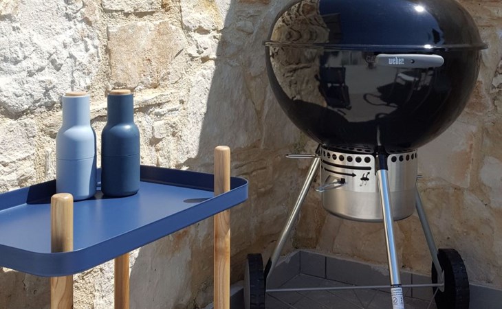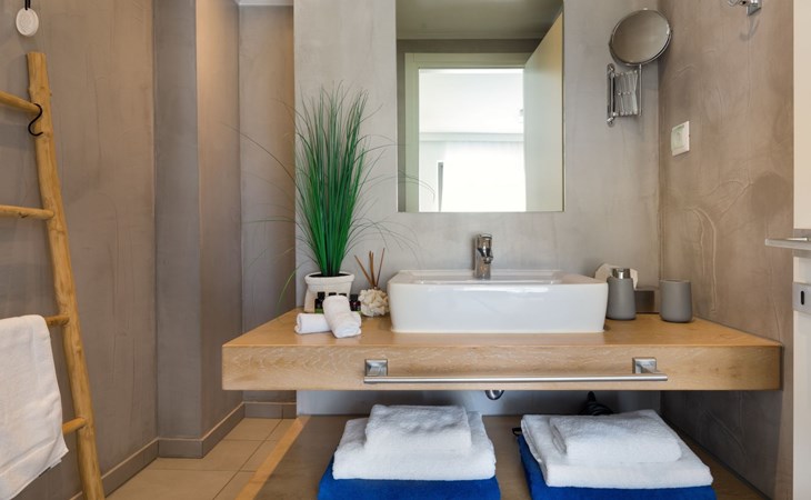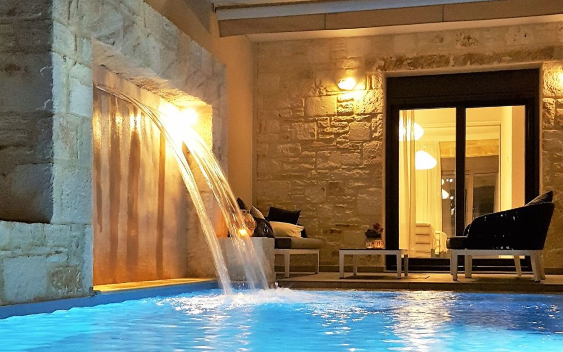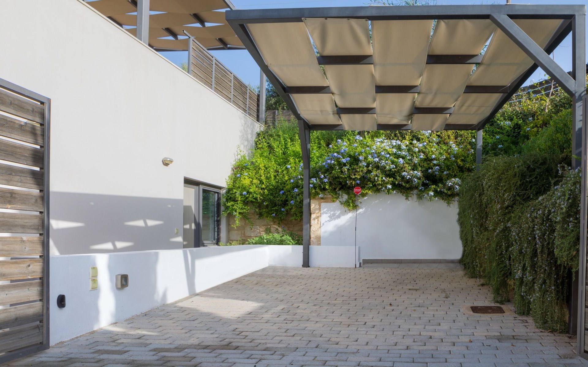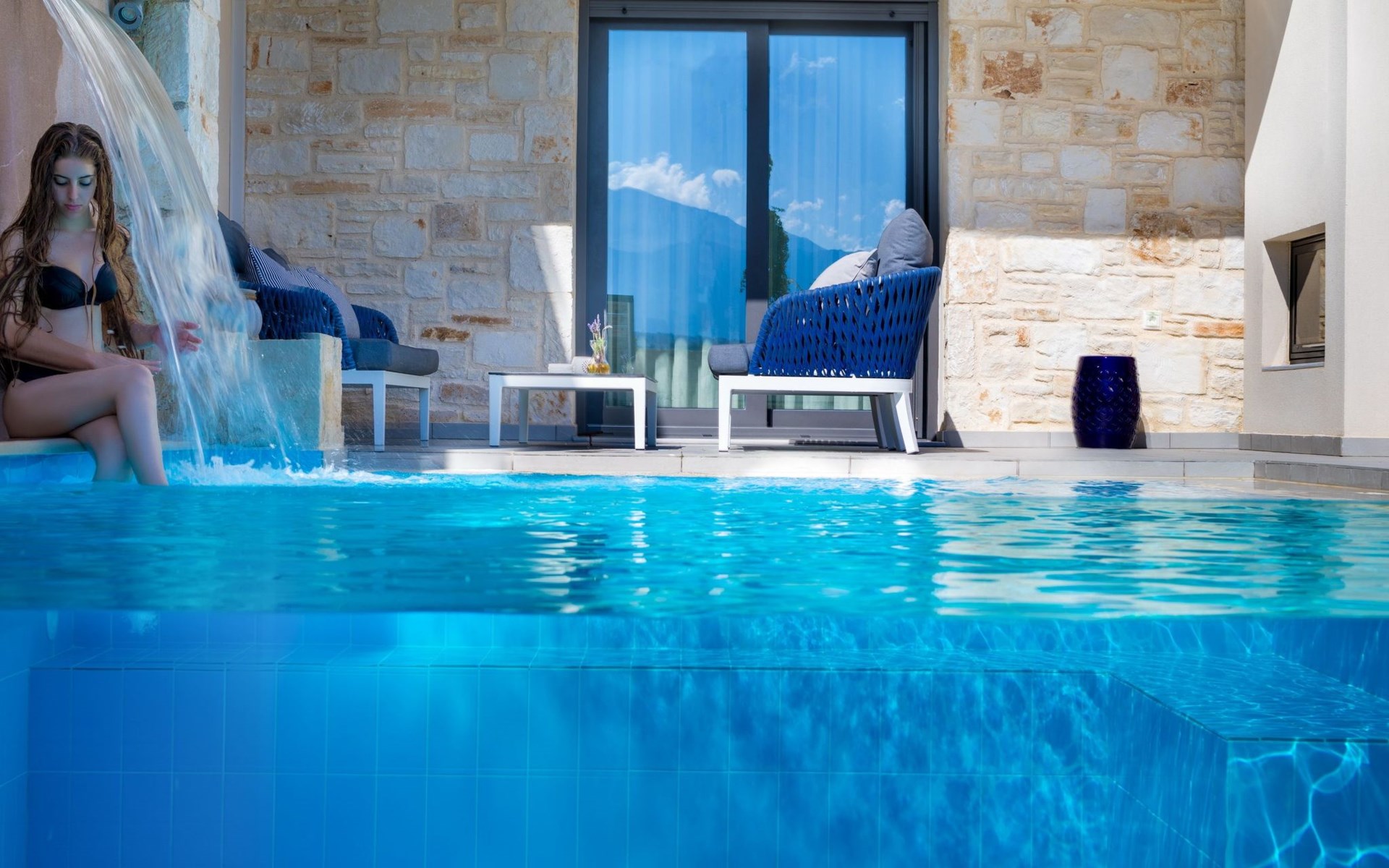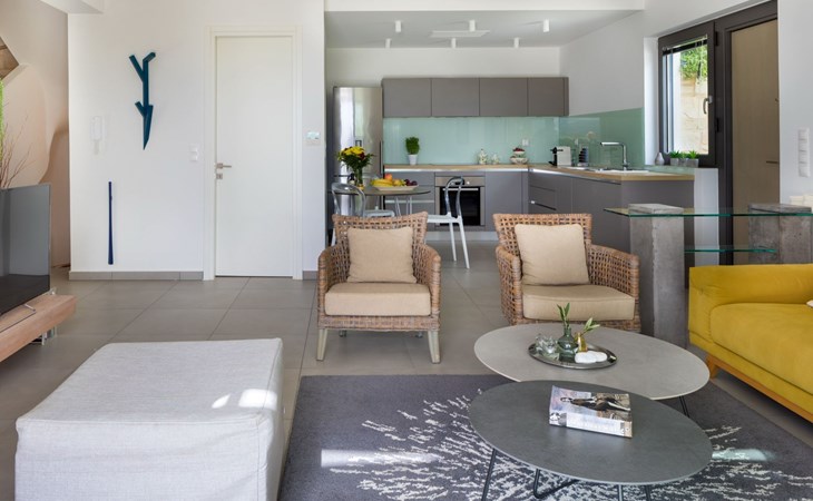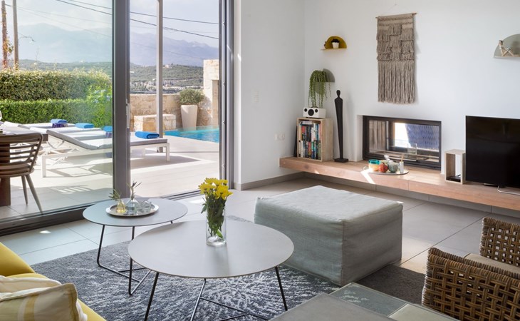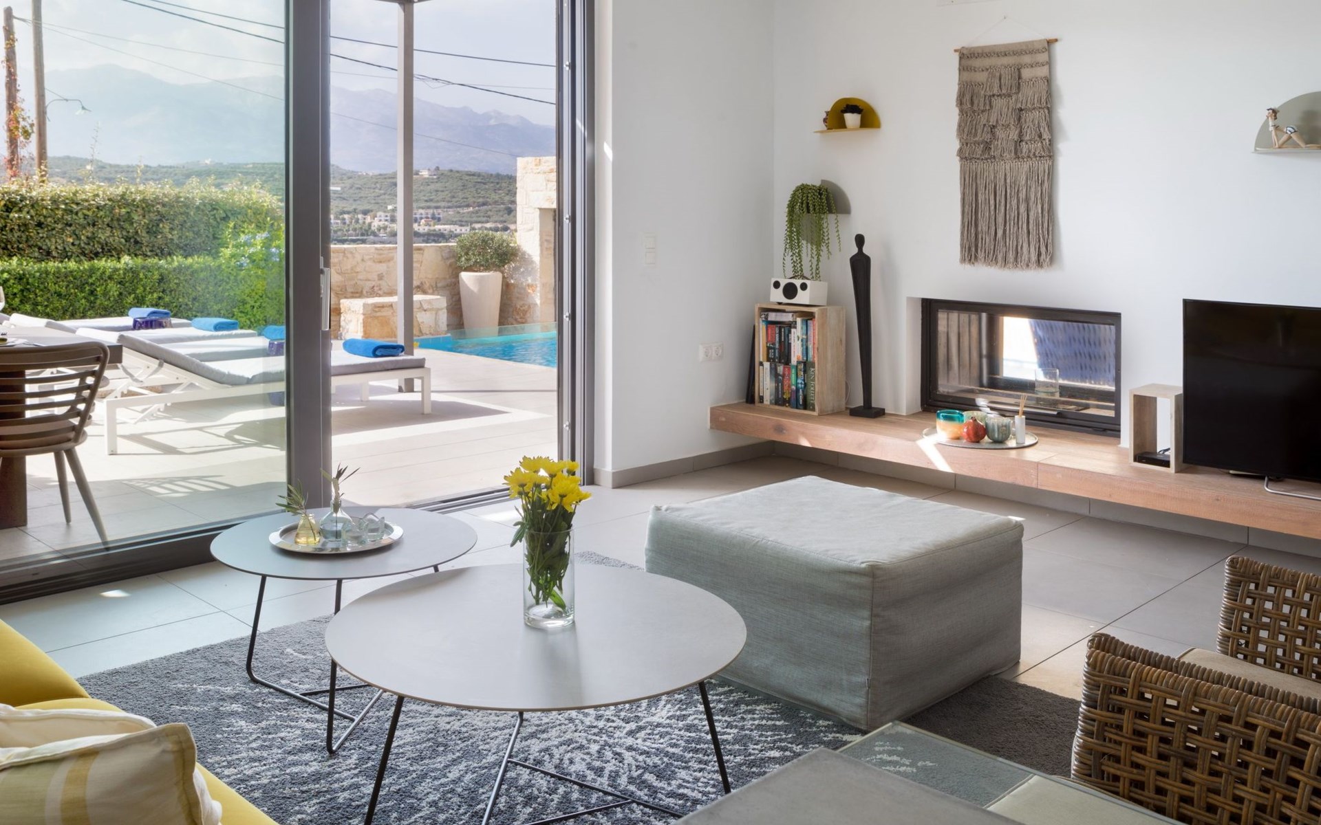 Die Villa's interior is a blend of elegance and comfort, featuring air conditioning, two bedrooms, and two bathrooms to accommodate four adults and a child comfortably. The masterful design incorporates stone, glass, wood, and warm colors, providing a sophisticated yet cozy atmosphere. The living room, complete with a fireplace, opens onto the pool area, inviting guests to unwind and enjoy the view. A fully-equipped kitchen with dining space allows for culinary adventures with fresh herbs from the garden. Comfortable bedrooms, equipped with double beds and the option for a child'bietet auf Wunsch ein Bett, das für erholsame Nächte sorgt. Moderne Duschräume tragen zum allgemeinen Luxus der Villa bei.
