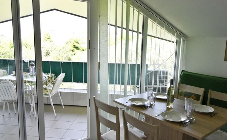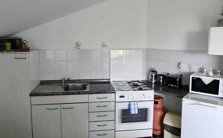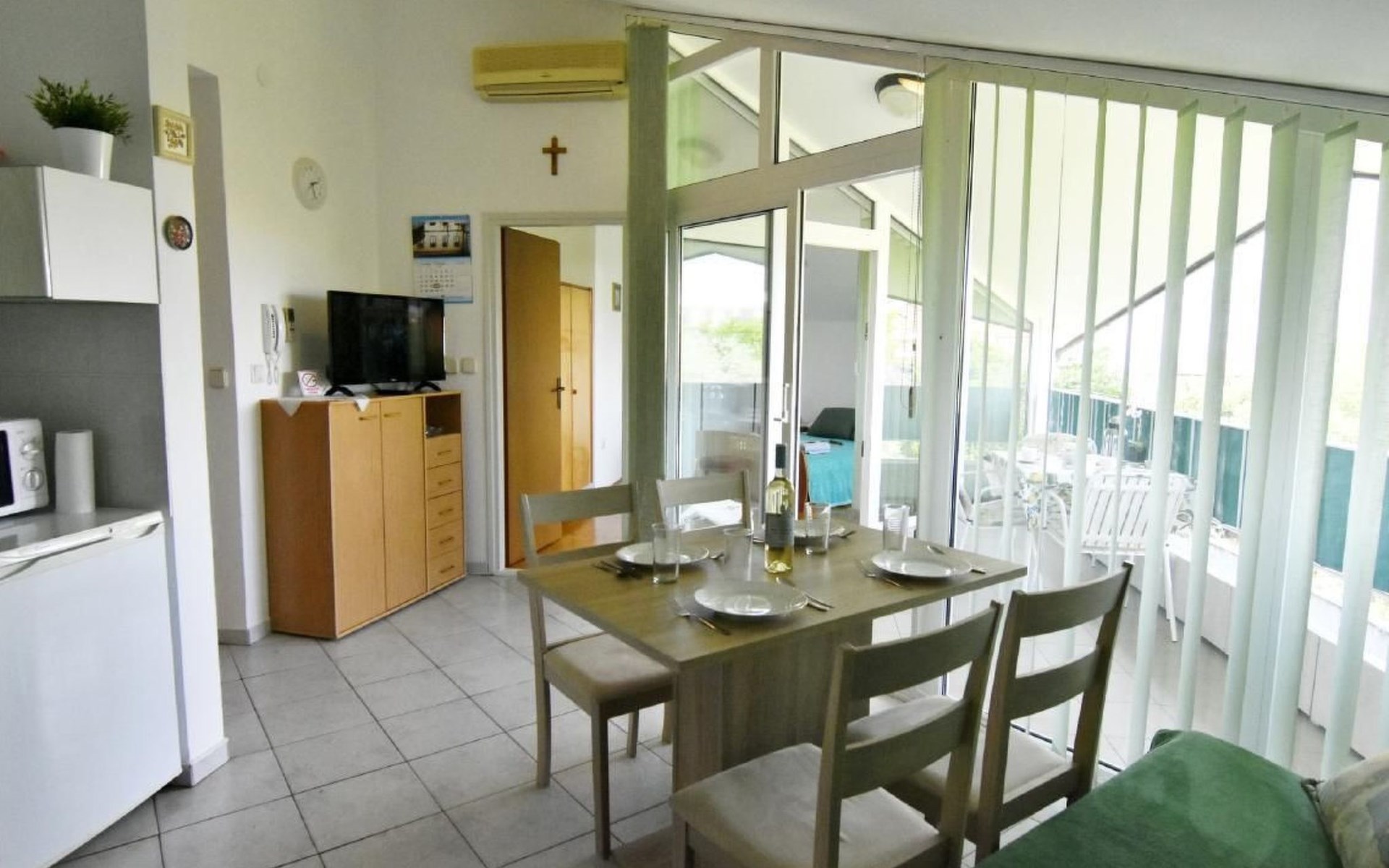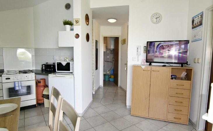 Innen bietet das Apartment eine komfortable Küche mit einer Küchenzeile, die mit einem Backofen, einem Herd mit zwei Gas- und zwei Elektrokochplatten, einem Kühlschrank, einer Mikrowelle, einer Kaffeemaschine, einem Wasserkocher und allen notwendigen Küchenutensilien ausgestattet ist. Im Wohnbereich erleichtern ein Esstisch mit 4 Stühlen, ein Schlafsofa/Futon, das Platz für einen Erwachsenen oder zwei Kinder bietet, ein Flachbild-TV und eine Klimaanlage, die sich zu einem überdachten Balkon hin öffnet, die Entspannung. Das separate Schlafzimmer verfügt über ein komfortables Doppelbett, Nachttische mit Lampen und Zugang zum Balkon, während das moderne Badezimmer mit Dusche, WC und Waschbecken ausgestattet ist.
